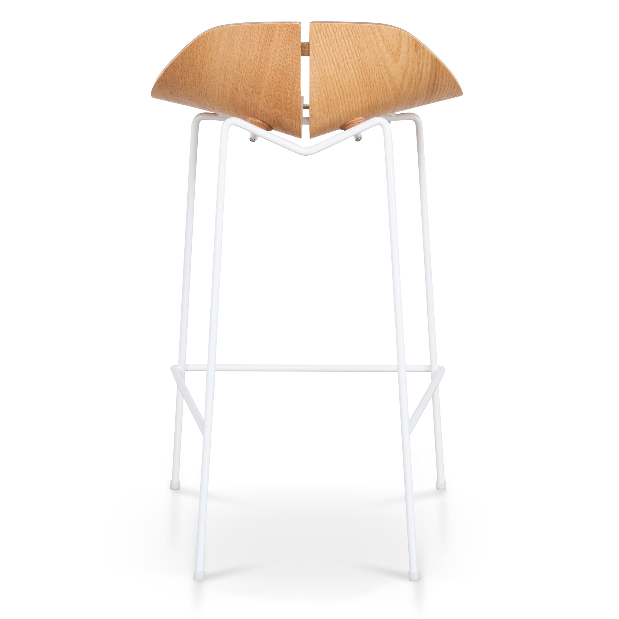 The 65cm Matte White Bar Stool - Natural is ideal for those who love minimalist furniture with a touch of natural warmth.Steel base in matte white finish Curved plywood seat with natural wood Ergonomic design Open-frame structure Neutral wood-and-white palette for versatile styling Weight capacity: 150 kg Fully assembled for convenience46.7cm (W) x 49.5cm (D) x 79.5cm (H) Seat: 46.7cm (W) x 43.8cm (D) x 65cm (H) Footrest Height: 21.7cm Distance between Legs (Front): 45cm Distance between Legs (Back): 32.2cmBox 1/1: 54cmx52cmx91cm, 11kg, 0.2555cbm