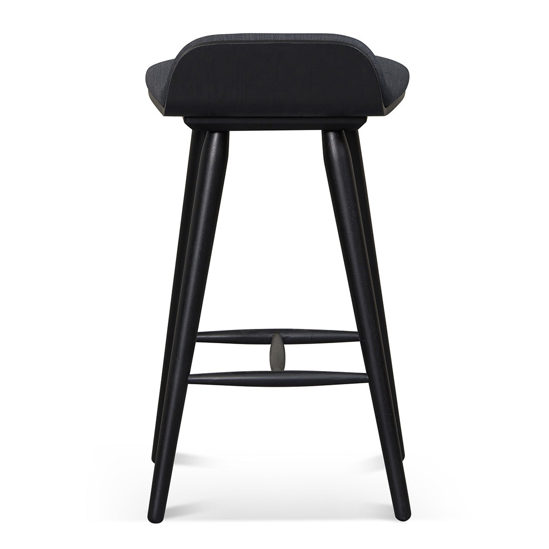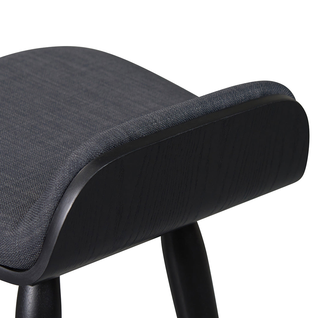 Finn 65cm Wooden Bar Stool, showcases a sleek charcoal black finish and a modern silhouette for a truly elevated seating experience.100% polyester charcoal black fabric Natural rubber square solid wood frame and legs Built with plywood with ash veneer Curved seat with optimal seat firmness Weight limit: 200kg Product is fully assembled40cm (W) x 45cm (D) x 72cm (H) Seat Height: 65cmBox 1/1: 75cmx47cmx49cm, 7.8kg, 0.1727cbm