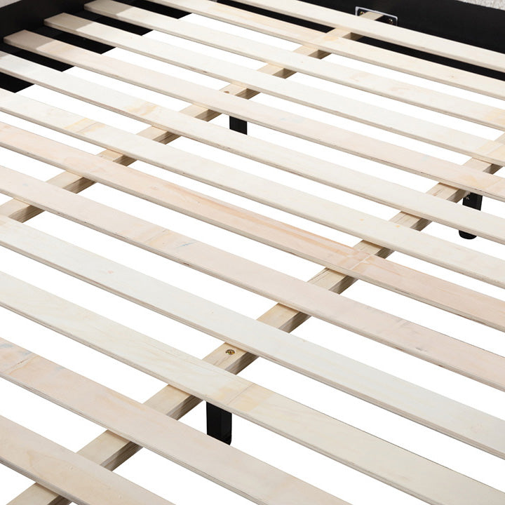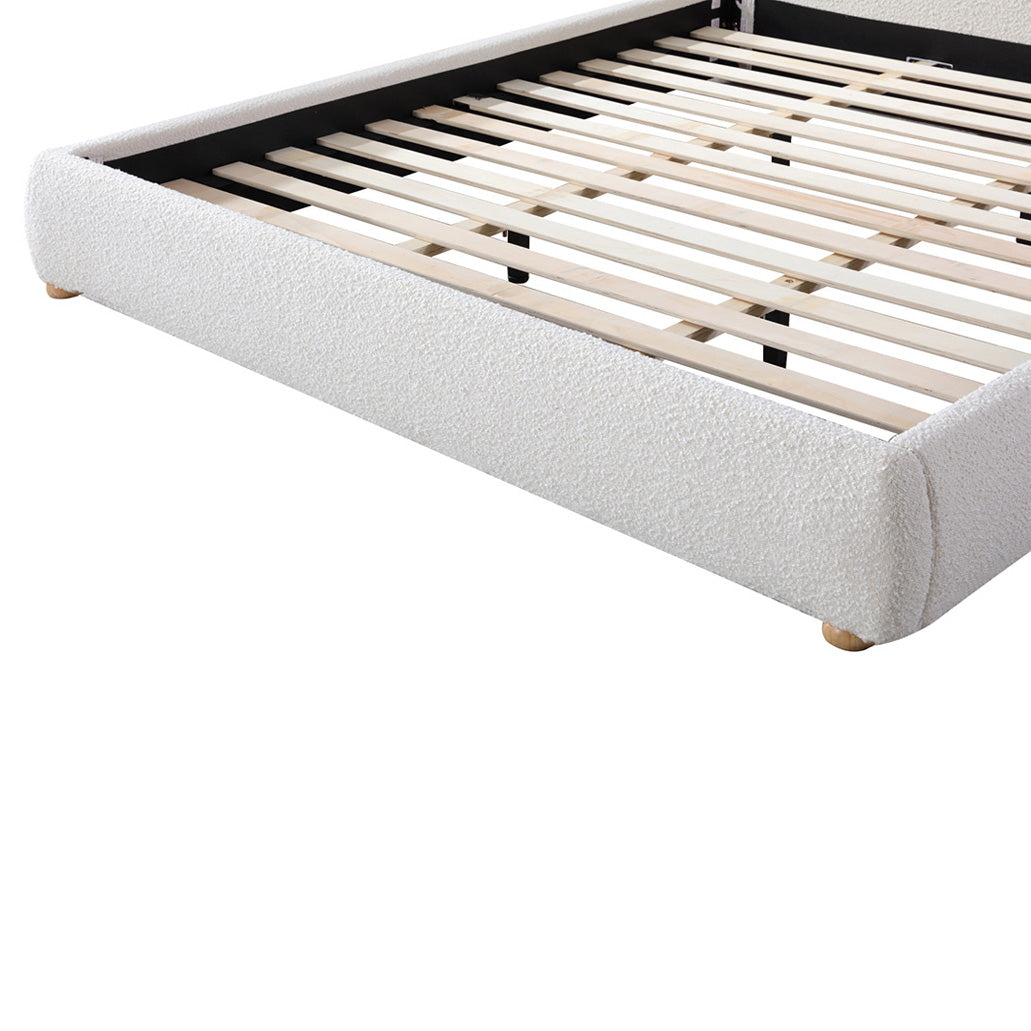 The King Bed Frame - Cream White Boucle offers a serene and luxurious sleeping experience.Cream white boucle polyester upholstery MDF construction Accommodates a King mattress Weight capacity: 400kg Product comes flat packed and requires two-person assembly and a screwdriver Note: Bed mattress not included Please ensure your mattress is compatible with the provided slat construction of this bed frame.201cm (W) x 230cm (D) x 104cm (H) Bedhead: 201cm (W) x 21cm (D) x 99cm (H) Sideboard: 205cm (W) x 7cm (D) x 27cm (H) Leg height: 5cmBox 1/2: 206cmx23cmx101cm, 30kg, 0.4785cbm Box 2/2: 225cmx30cmx34cm, 53kg, 0.2295cbm
