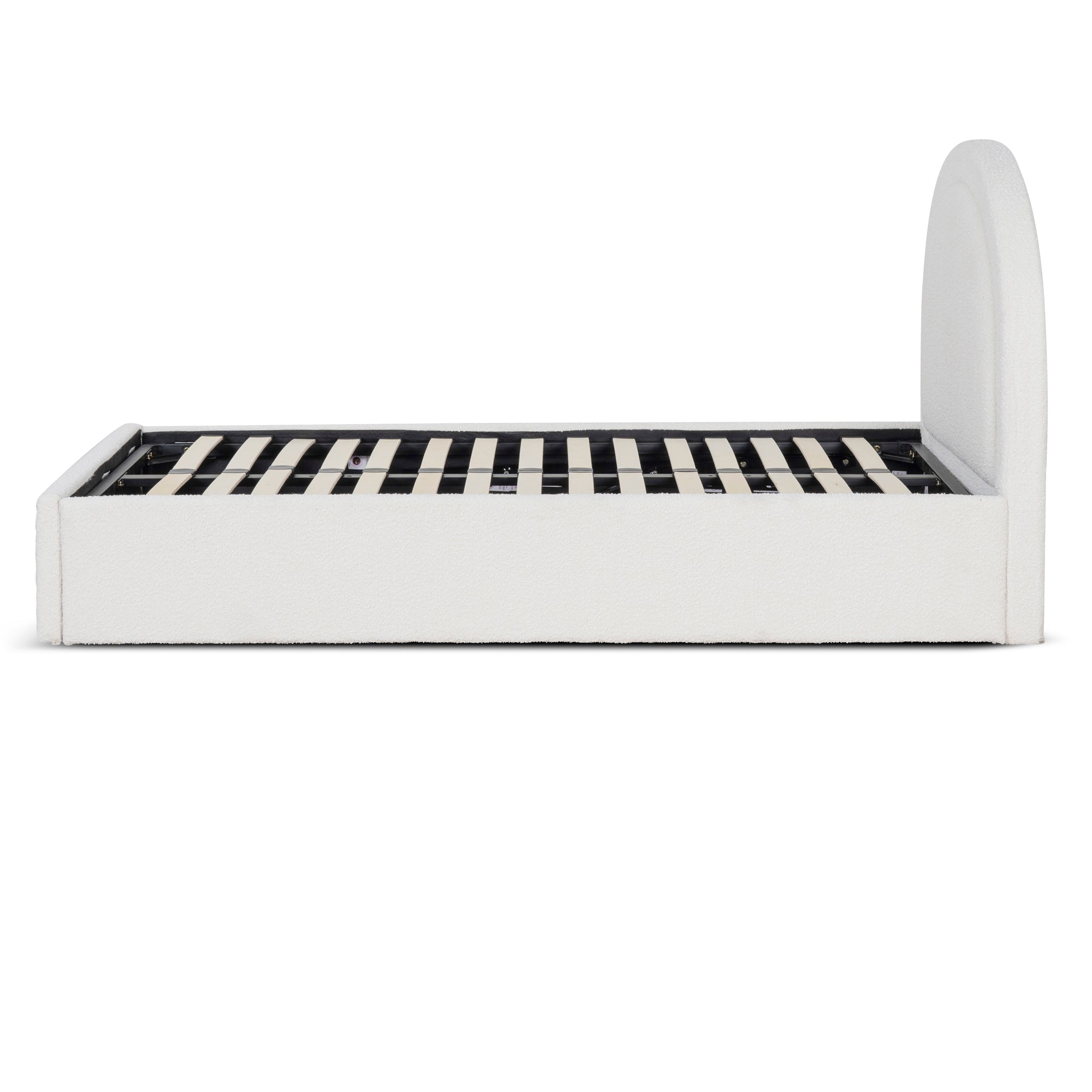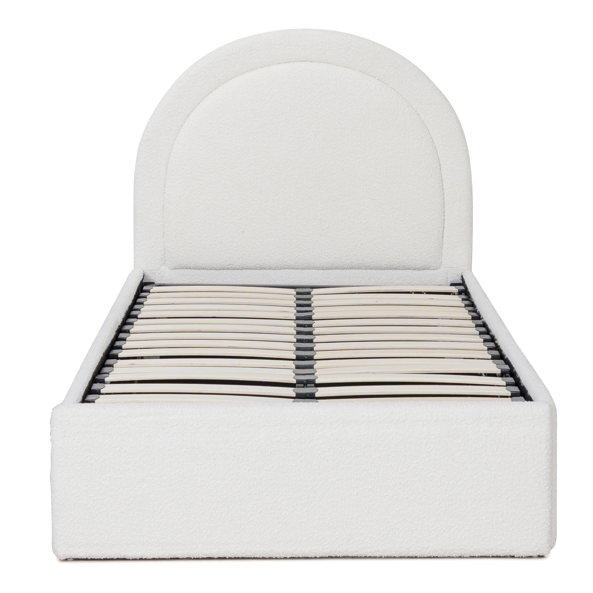 Introducing the Single Sized Bed Frame - Antique White Boucle with Storage, where elegance meets practicality.Antique white boucle polyester/acrylic upholsteryMDF, foam and metal constructionGas lift mechanism supports up to 50 kgAccommodates a Single mattressWeight capacity: 350kgProduct comes flat packed and requires two-person assembly and a screwdriver Note: Please ensure your mattress is compatible with the provided slat construction of this bed frame.103cm (W) x 201cm (D) x 98cm (H) Internal Dimensions: 94cm (W) x 190cm (D)Box 1/2: 105cmx7cmx115cm, 17kg, 0.0845cbm Box 2/2: 191cmx18cmx32cm, 33kg, 0.1100cbm