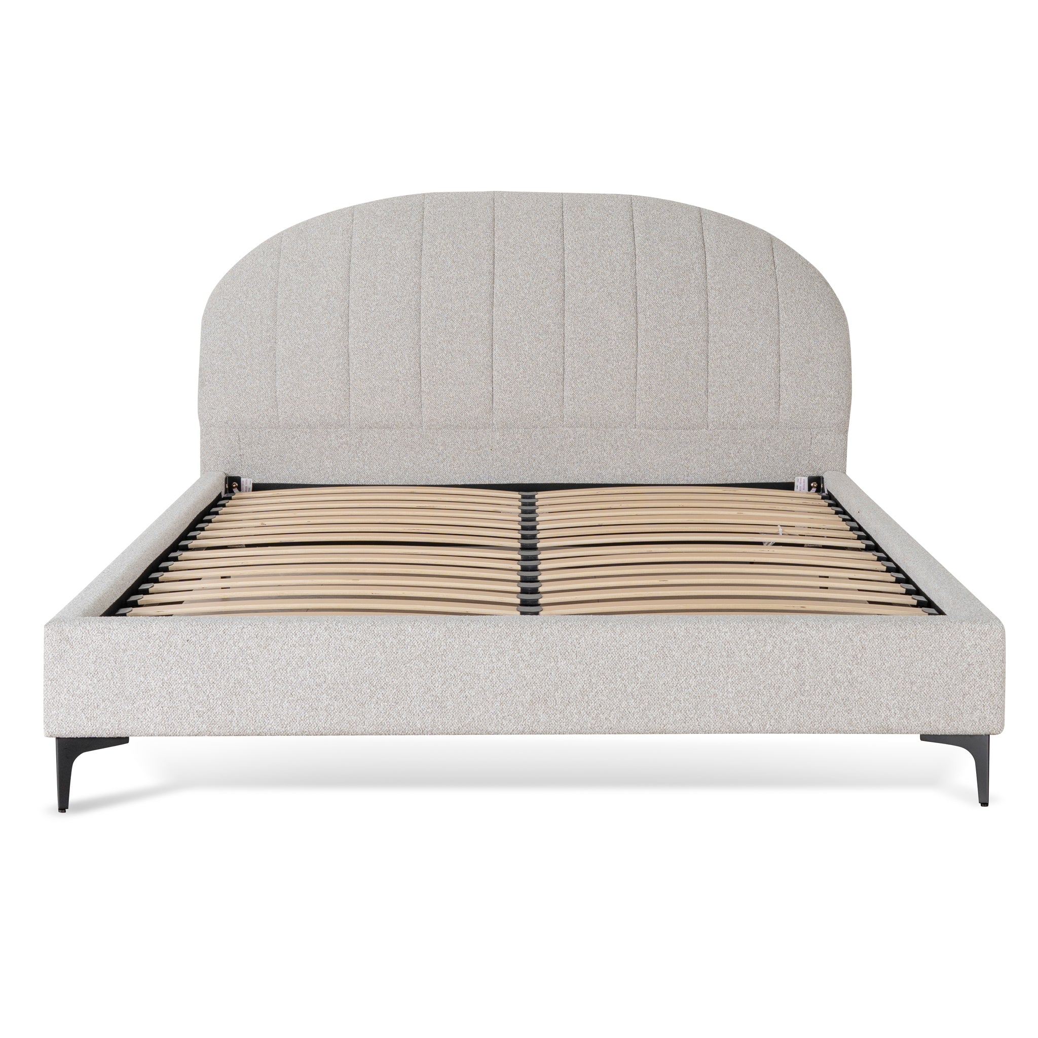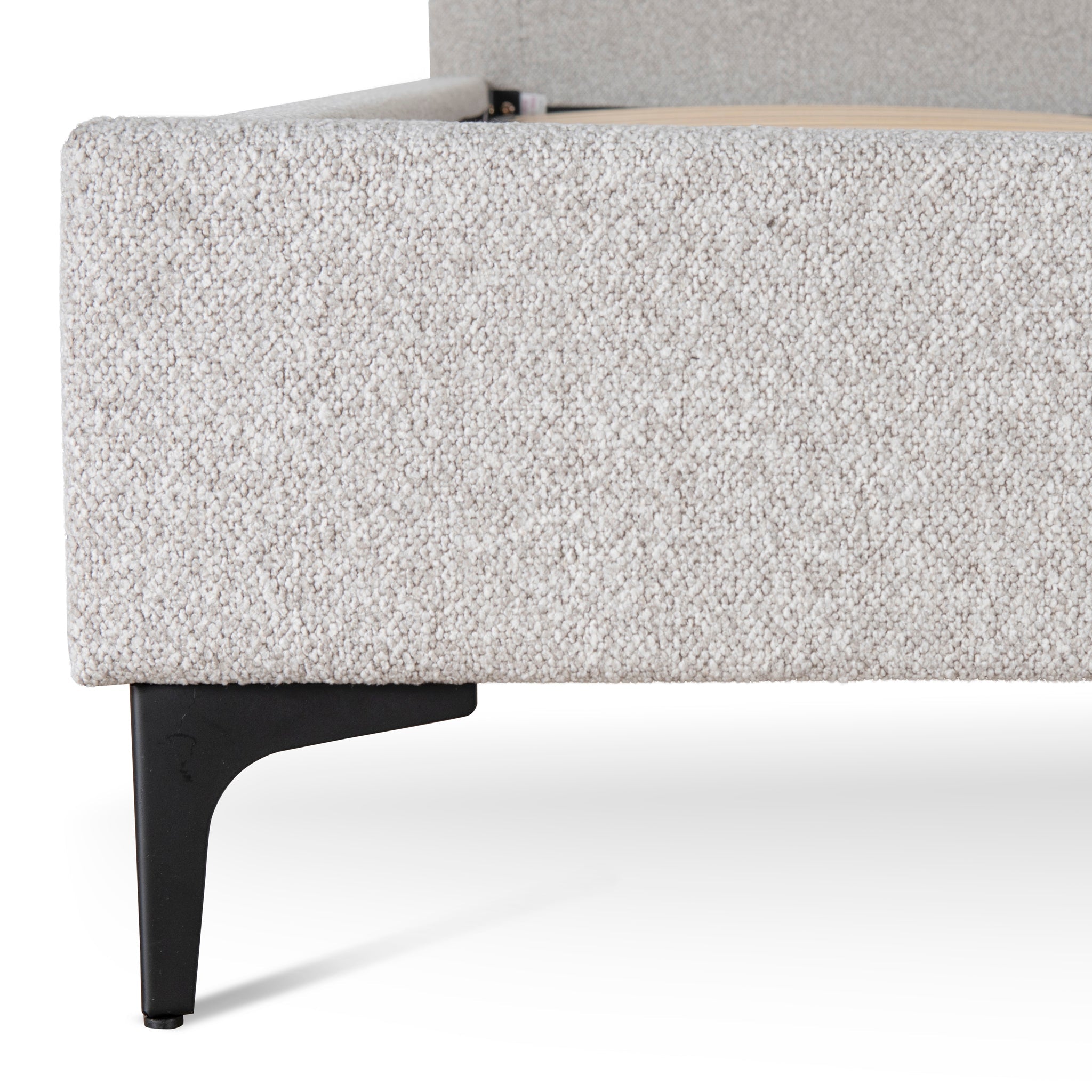 Discover unparalleled comfort with the Fabric Queen Bed Frame in Clay Grey.Clay grey polyester upholstery MDF construction Foam filled Black metal legs Accommodates a Queen mattress Weight capacity: 350kg Product comes flat packed and requires two-person assembly and a screwdriver Note: Bed mattress not included Please ensure your mattress is compatible with the provided slat construction of this bed frame.170cm (W) x 239cm (D) x 108cm (H) Bed head: 170cm (W) x 28cm (D) x 105cm (H) Sideboard: 205cm (W) x 6cm (D) x 20cm (H)Box 1/2: 171cmx18cmx95cm, 25kg, 0.2924cbm Box 2/2: 228cmx25cmx28cm, 31.5kg, 0.1596cbm