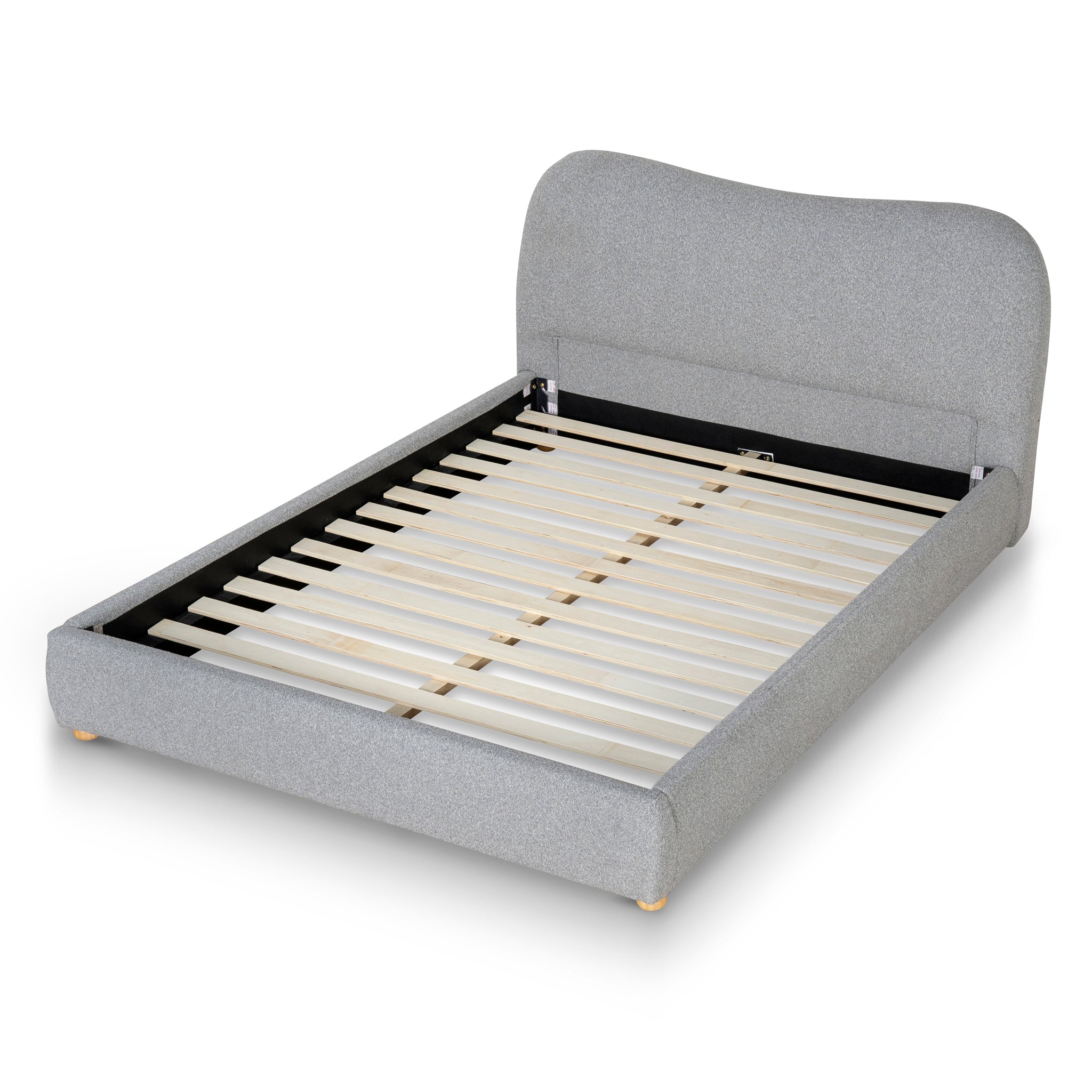The Queen Bed Frame - Storm Grey is the epitome of modern sophistication.Storm grey polyester upholstery MDF construction Foam filled Black metal frame with timber slats Accommodates a Queen mattress Weight capacity: 350kg Product comes flat packed and requires two-person assembly and a screwdriver Note: Bed mattress not included Please ensure your mattress is compatible with the provided slat construction of this bed frame.171cm (W) x 230cm (D) x 104cm (H) Bedhead: 171cm (W) x 21cm (D) x 99cm (H) Sideboard: 205cm (W) x 7cm (D) x 27cm (H)Box 1/2: 176cmx23cmx101cm, 26kg, 0.4088cbm Box 2/2: 225cmx30cmx34cm, 50kg, 0.2295cbm