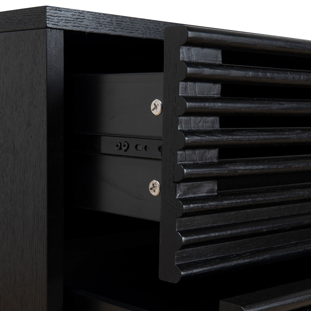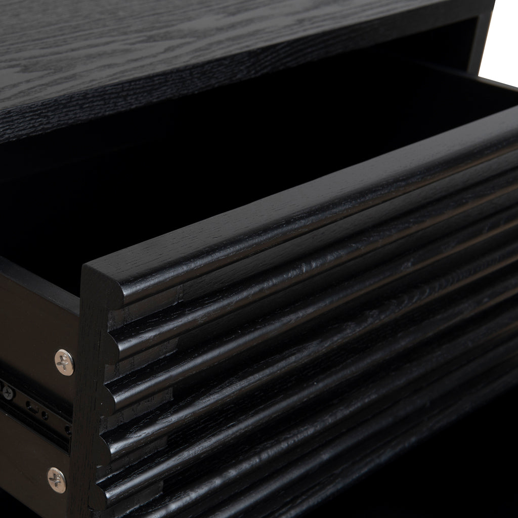 Meet the Bedside Table in Full Black, a sleek and stylish addition to your bedroom that will elevate your sleeping space with its modern designEngineered wood body with ash veneer Drawers with horizontal solid wood strip Pull-to-open mechanism for easy access Solid ash wood legs Full black wood color frame Weight capacity: 40kg Product is flat pack and requires two-person assembly55cm (W) x 45cm (D) x 50cm (H)Box 1/1: 63cmx53cmx58cm, 28kg, 0.1937cbm