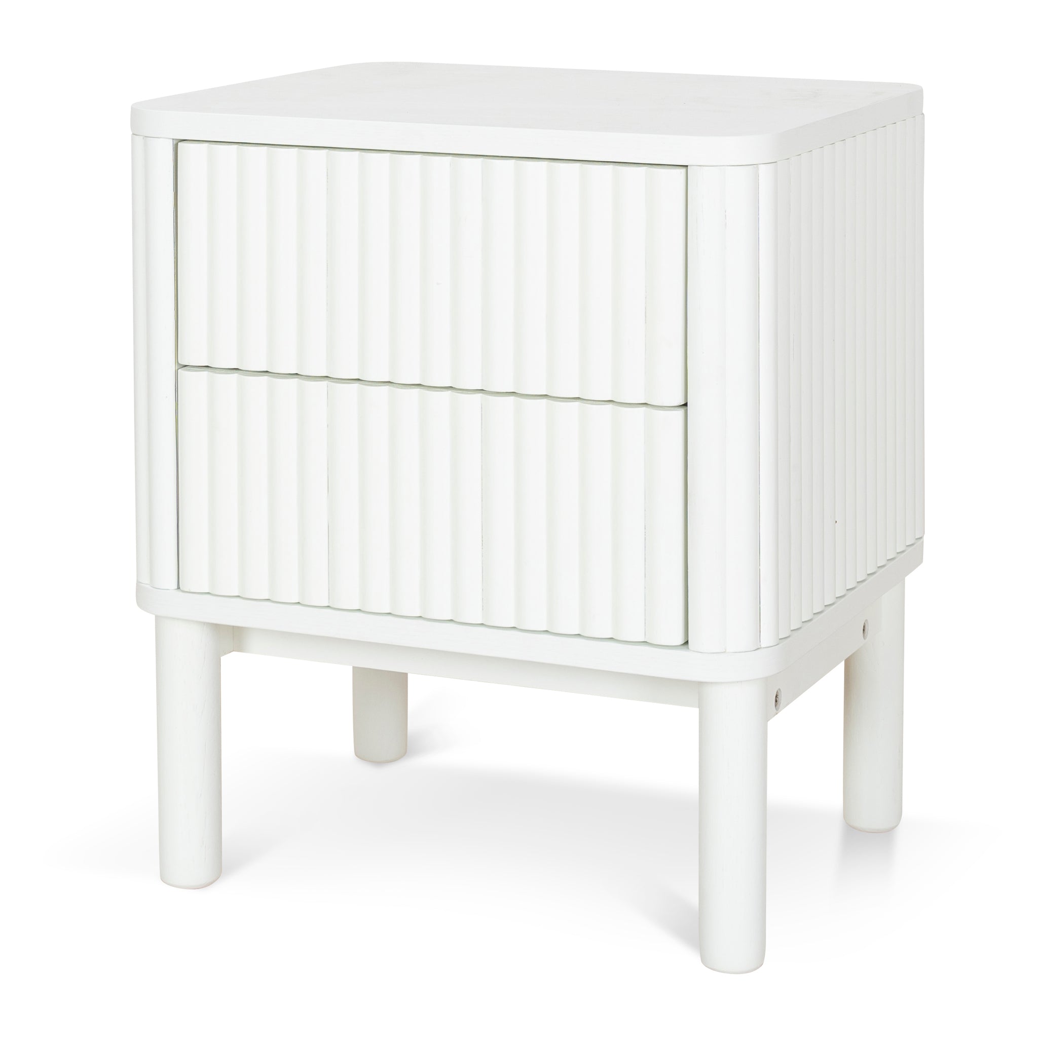 The Bedside Table in Warm White brings a refined touch of elegance to your bedroom.MDF construction in a white oak veneer finish White solid oak wood legs White finish with NC coating Two push-to-open drawers Weight Capacity: 60 kg Product comes flat pack and requires two-person assembly and a screwdriver Note: Please note that white tones may be affected by the lighting in the room.48cm (W) x 40cm (D) x 55cm (H) Internal drawers: 32cm (W) x 29cm (D) x 15.4cm (H)Box 1/1: 51cmx58.5cmx27cm, 24.6kg, 0.0806cbm