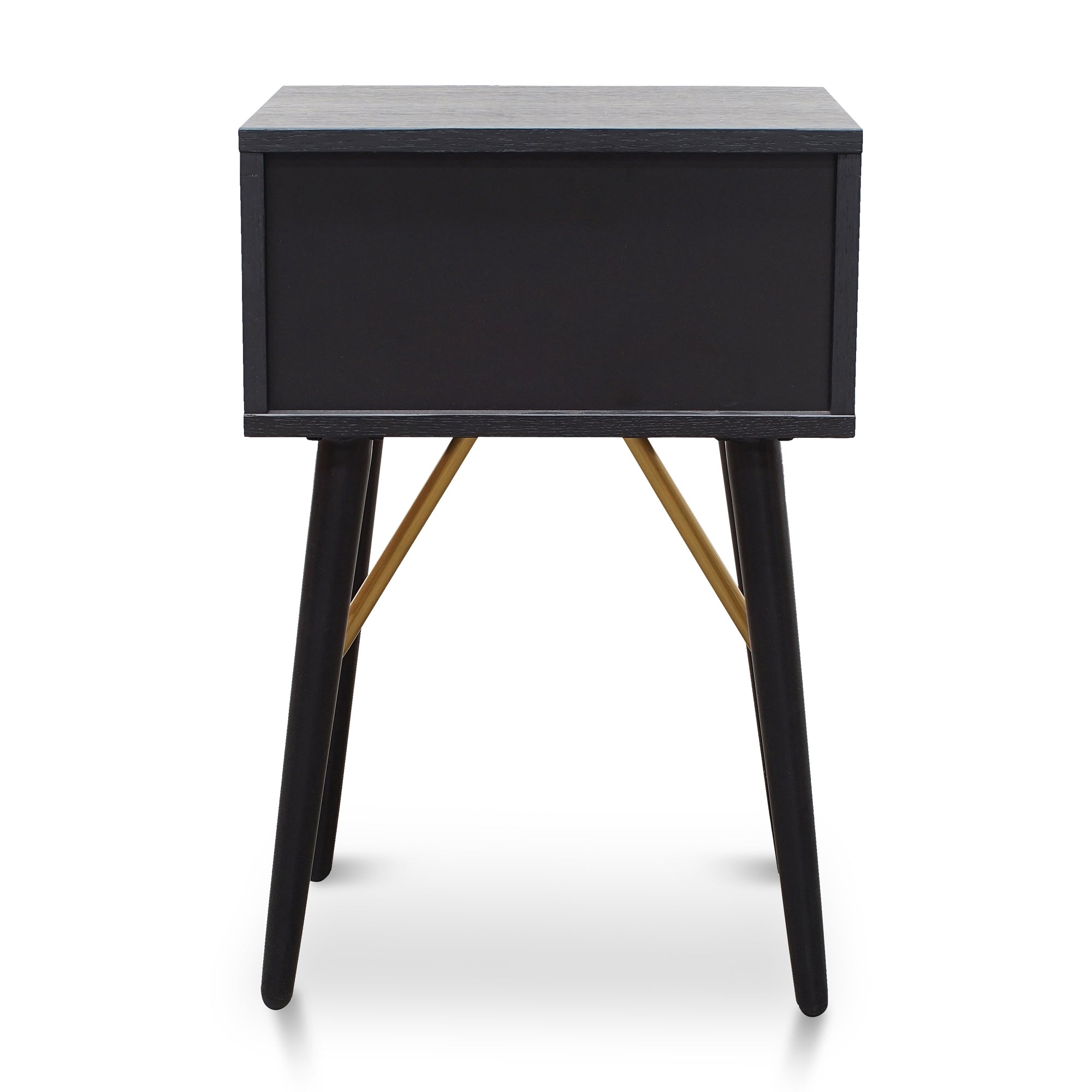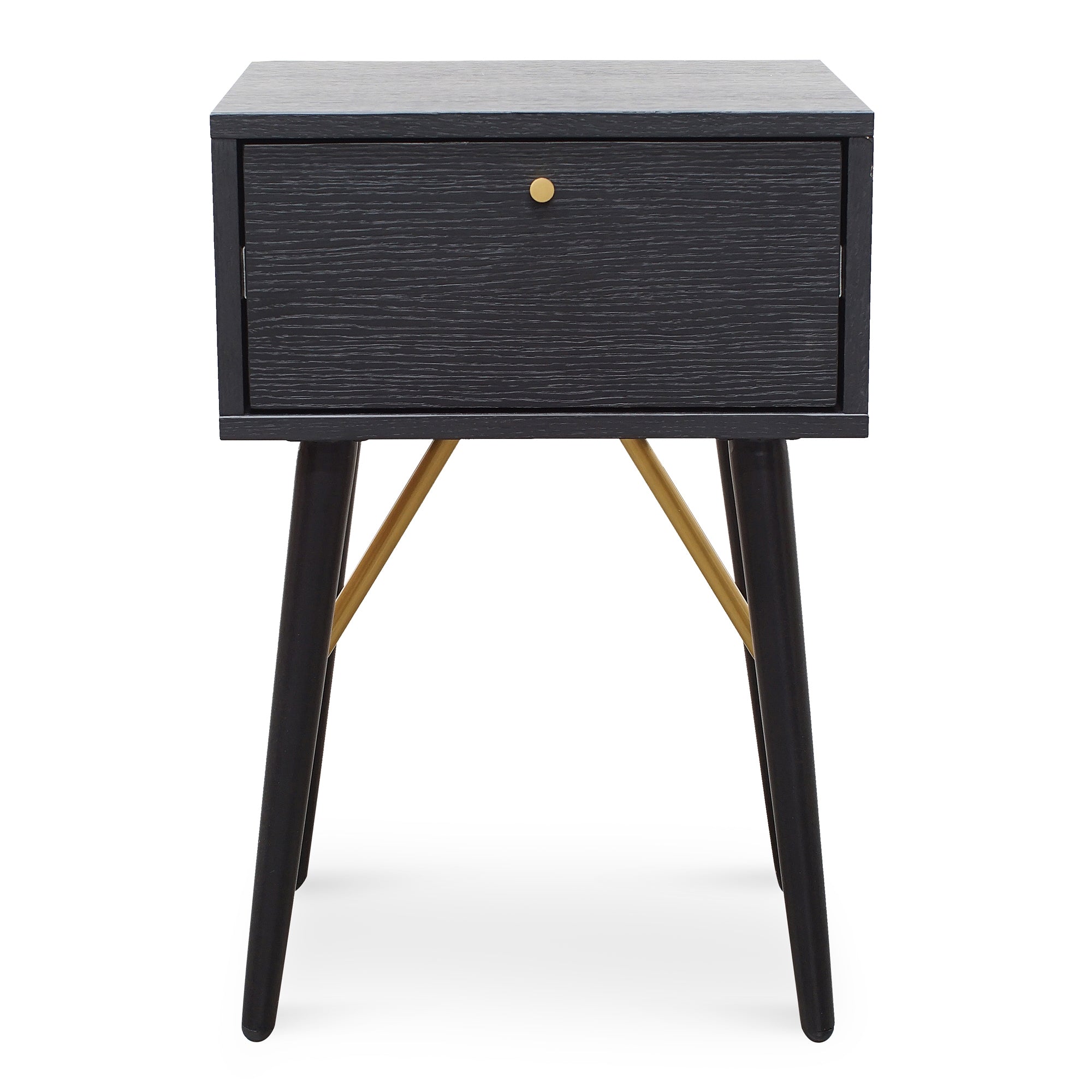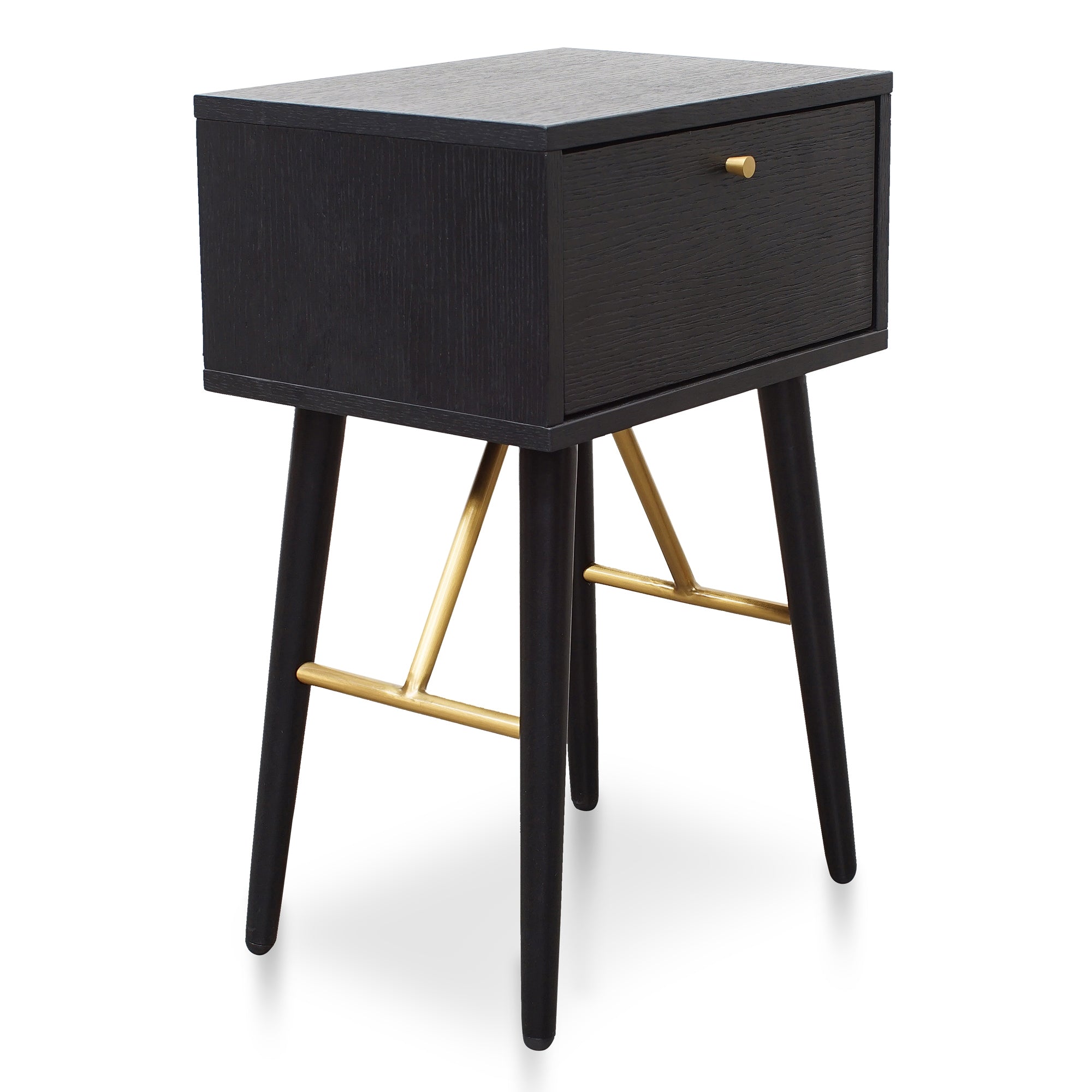 Elevate your bedroom decor with the chic Bedside Table – Black, minimal yet bold addition to your space.Features 1x pull-out drawer Small circular brushed brass handle Durable MDF ash veneer body and drawer in a black finish Strong and tapered black legs with brushed brass support beams40cm (W) x 30cm (D) x 60cm (H) Drawer inside: 31.5cm (W) x 24cm (D) x 8cm (H)Box 1/1: 32cmx46cmx36cm, 10.5kg, 0.0530cbm