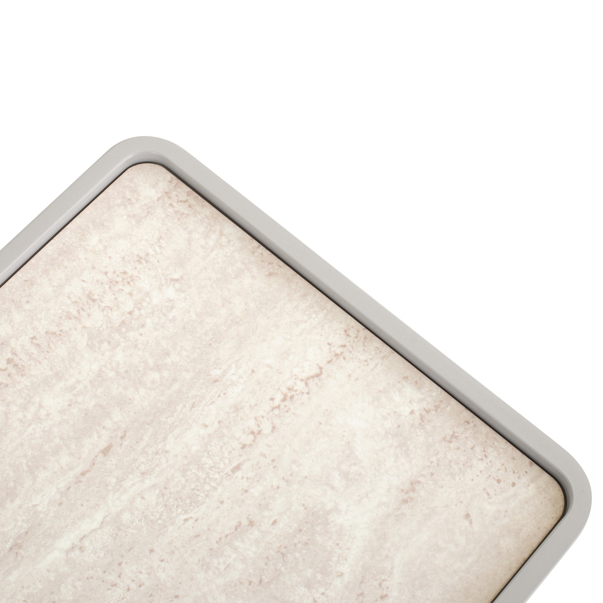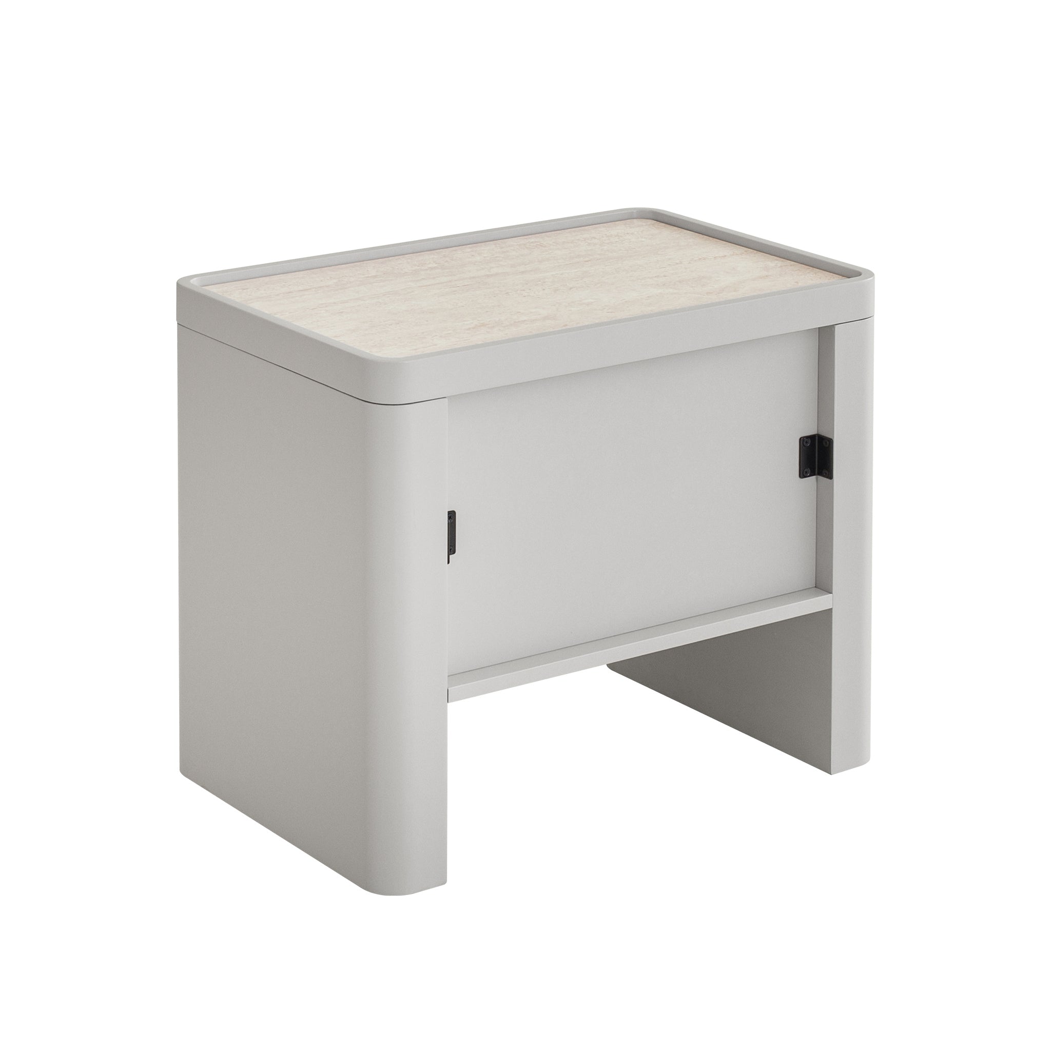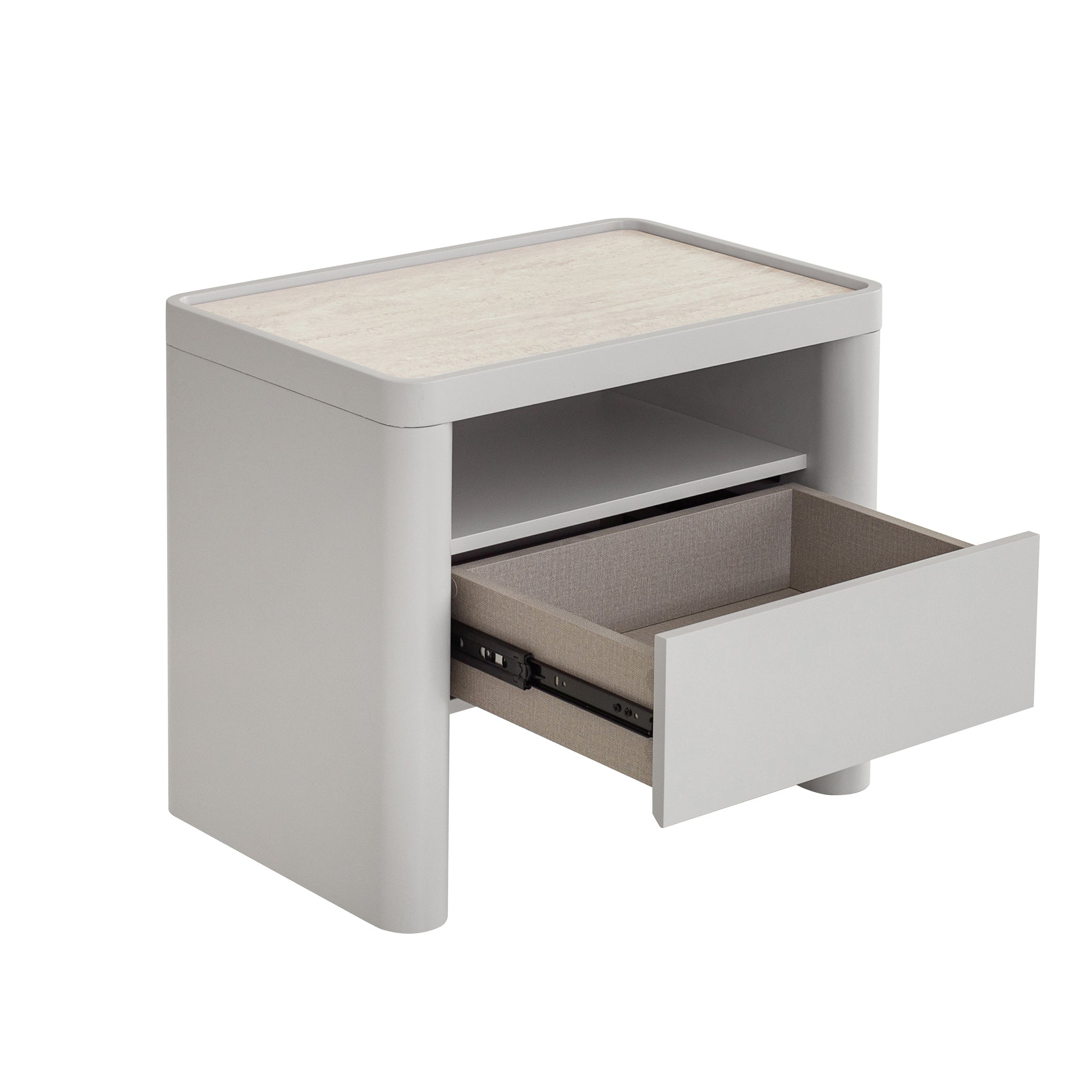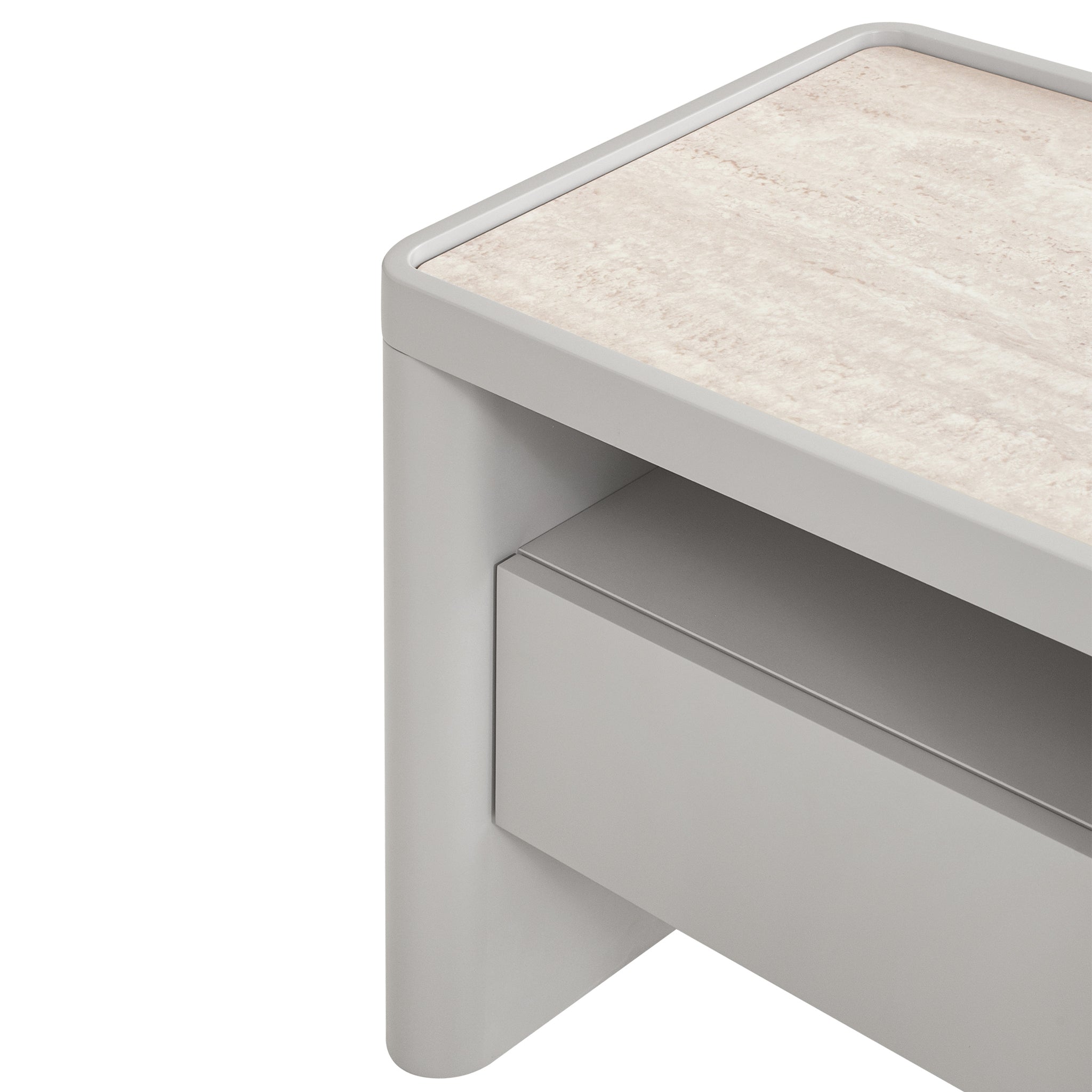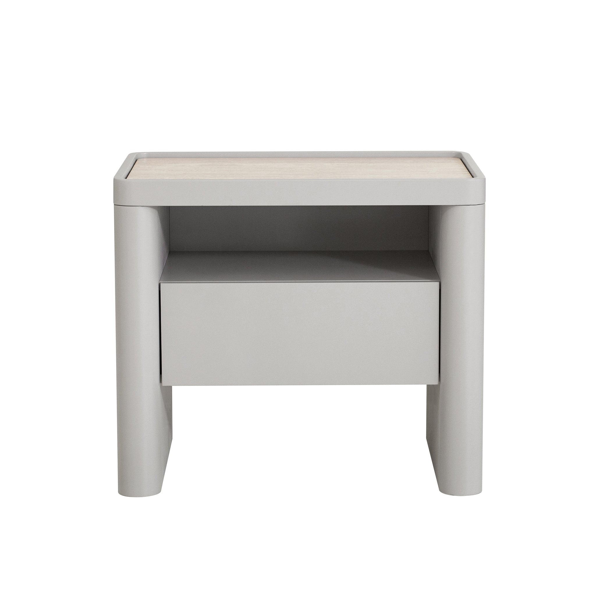 Minimal, refined, and effortlessly modern, Glass Top Bedside Table - Warm Grey is made for calm, considered living.Travertine look tempered glass top Engineered wood legs, sides, and drawer front panels Melamine back and internal drawer panels Warm grey with a PU finish One spacious drawer and open shelf Rounded corners and legs Handle-free design Contrasting textures Weight Capacity: 50 kg Product comes fully assembled60cm (W) x 40cm (D) x 52.5cm (H) Internal Drawer: 40cm (W) x 27cm (D) x 10cm (H) Shelf: 45.7cm (W) x 32.5cm (D) x 13cm (H) Table Thickness: 4cm Leg Height: 48cm Base Height: 18cmBox 1/1: 67cmx47cmx59cm, 31.3kg, 0.1858cbm