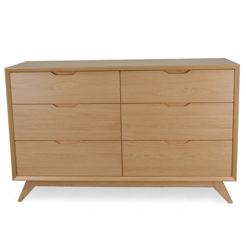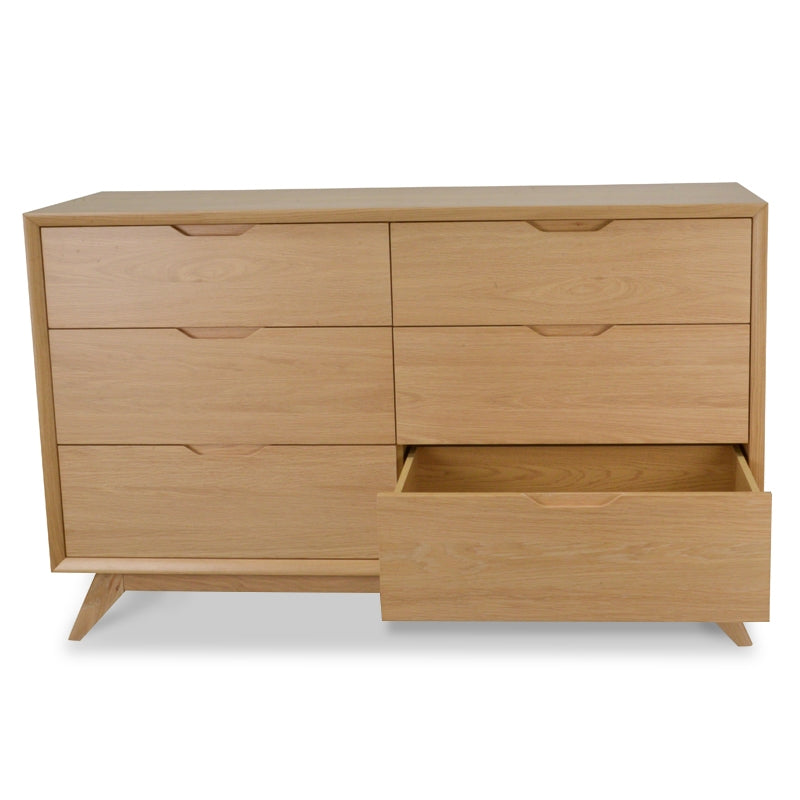 Give your bedroom the contemporary touch with the sleek and functional 6 Drawer Wide Chest Dressing - Natural. Infusing your space with warm wood tones and natural textures, its streamlined design and flared legs echo Scandinavian-inspired simple living and timeless style.Body crafted from natural oak veneer for a sturdy build and timeless style Stunning solid American oak legs for lasting strength Features six pull out drawers for any storage needs Natural wood grains add a subtle textural element in any interior space A versatile and contemporary design that can complement any decor style135cm (W) x 42.2cm (D) x 84.6(H)Box 1/1: 81cmx49cmx142cm, 83.5kg, 0.5636cbm