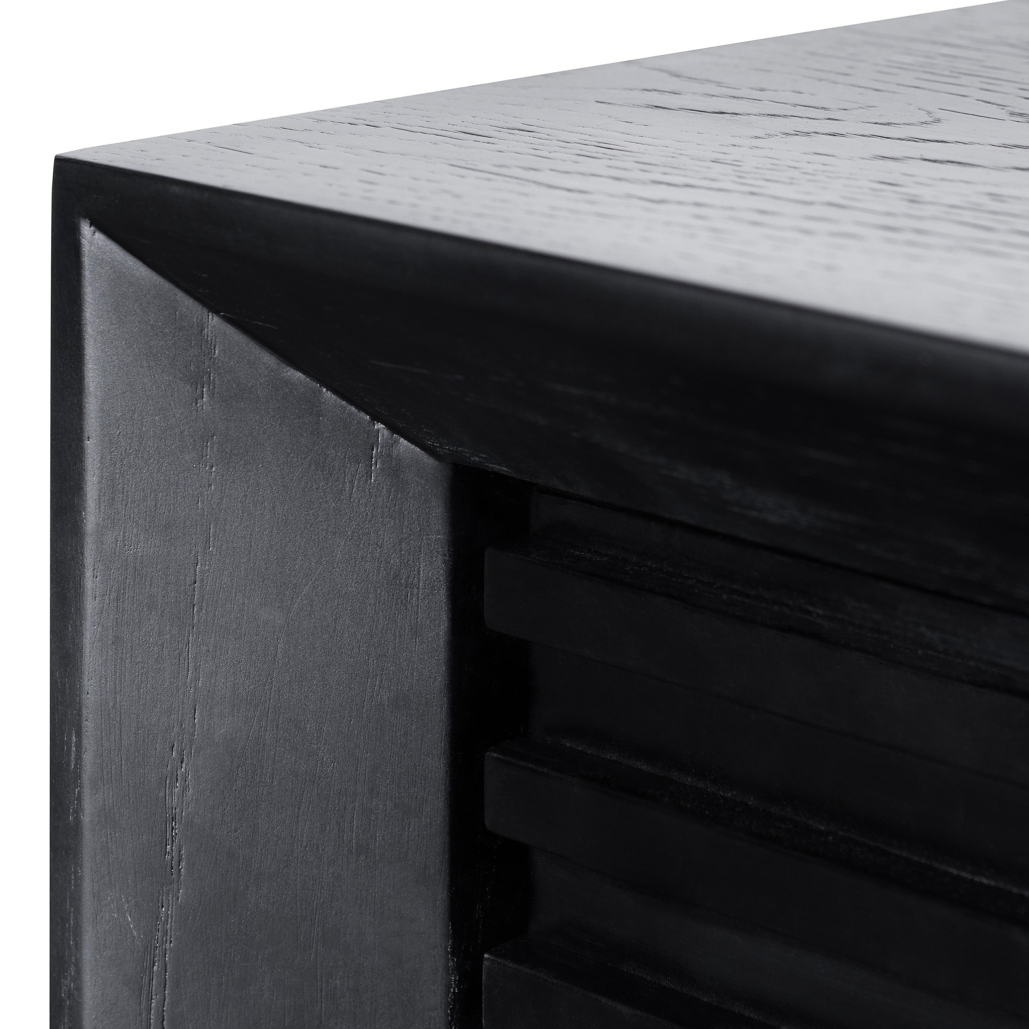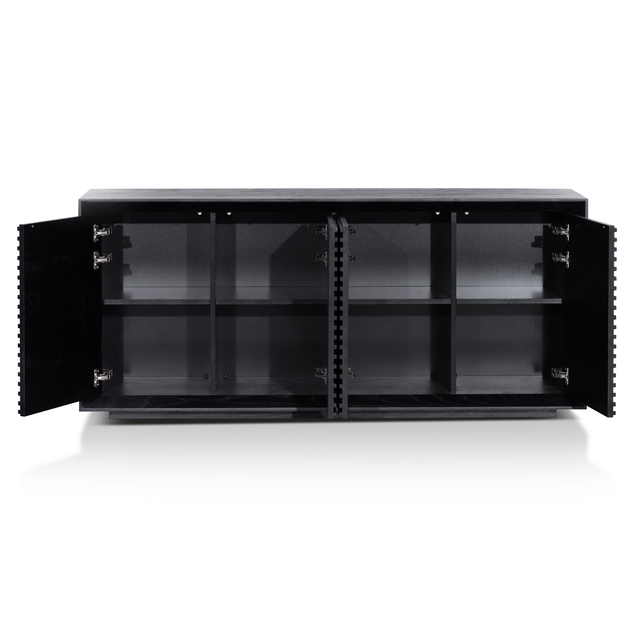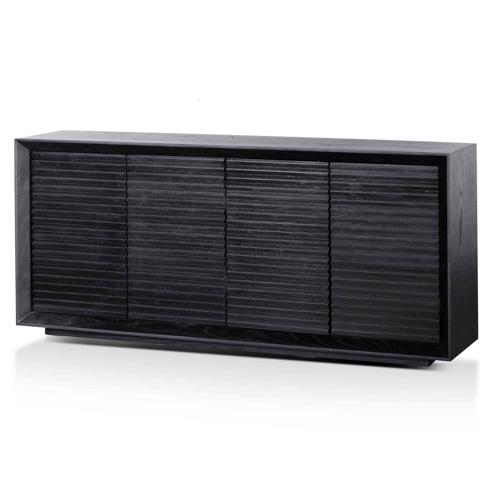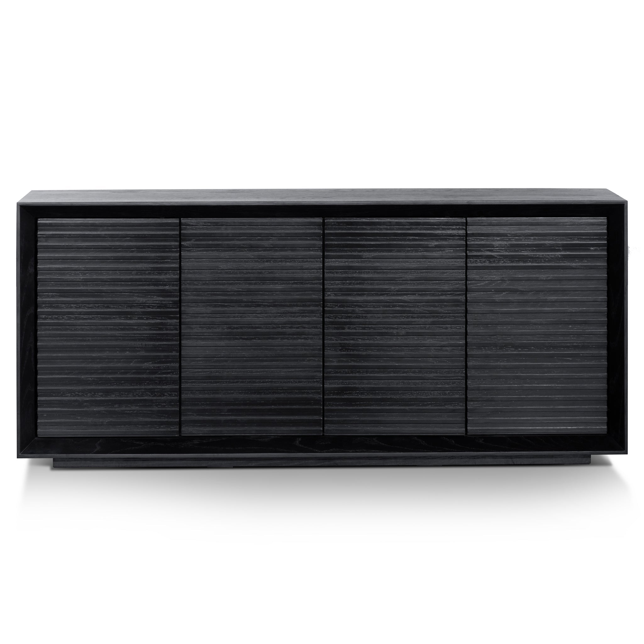 Create a clean and minimal space with the modernist design of 1.9m Wooden Sideboard - Black Oak.Durable oak veneer construction in black finishE1 standard paneling with short wooden baseDoors in vertical wood slat design4x push-to-open doors and 8x compartmentsProduct is fully assembled Create a sense of modern sophistication with a black sideboard. This versatile piece combines storage and style for a sleek dining room upgrade.180cm (W) x 45cm (D) x 79cm (H) Internal Self: 42cm (W) x 39.5cm (D) x 31.8cm (H)Box 1/1: 186.8cmx46.3cmx84.9cm, 99kg, 0.7343cbm