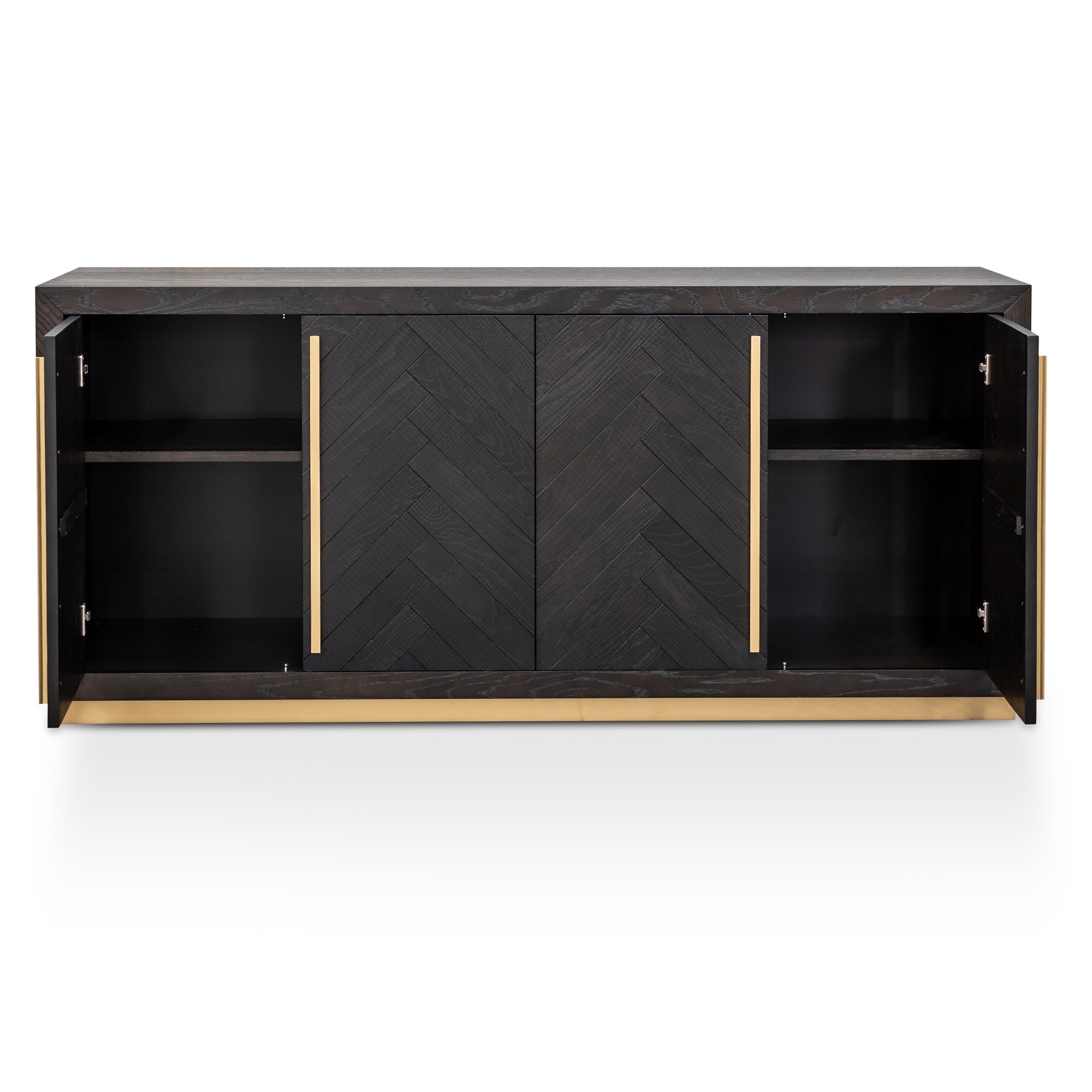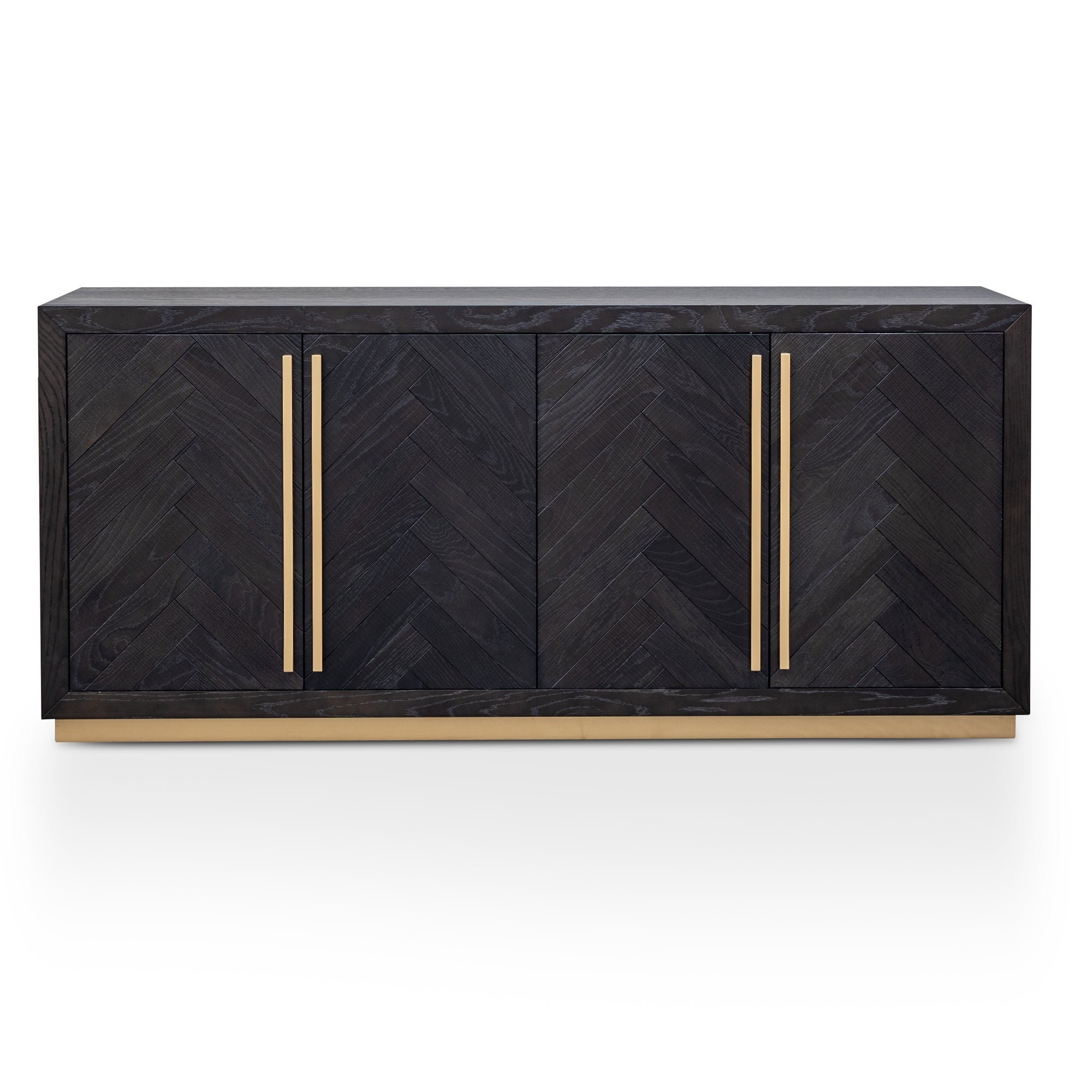 Maximize both style and storage with the Wide Wooden Sideboard - Peppercorn and Brass, a refined solution for modern living.White oak veneer top and sides Painted composite board back, bottom, and partition Solid beech wood handles White oak veneer doors on composite board Adjustable shelf Solid beech wood base in brass color Black peppercorn herringbone wood finish Four cabinet doors Minor Assembly Required179.5cm (W) x 47.5cm (D) x 80cm (H)