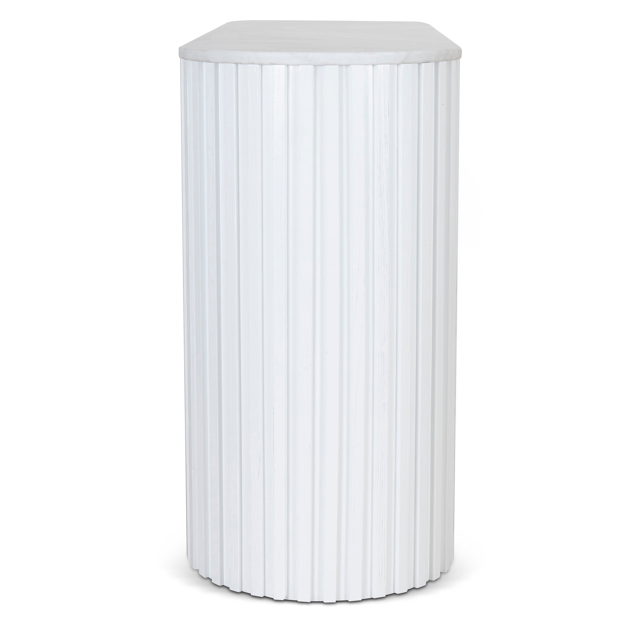 Introducing the 1.5m Marvel Console Table - White, a true reflection of modern luxury for your living space.Marble top surface Solid elm wood legs with plywood natural veneer Bold cylindrical leg design Elegant sculptural feel Ribbed structure for a robust grounded look Stylish and versatile for various styles Weight Capacity: 150 kg Product comes fully assembled Note: Our marble table tops are a natural stone that each have their own unique imperfections and characteristics. Any variations in colour, texture, polish and pattern are not a fault and should be appreciated. Please note that polished marble is porous, so contact with liquids or hot beverages may cause the marble to mark. Make sure to wipe away any spills immediately using water or a mild cleaner. We recommend the use of placemats and coasters to further protect the integrity of the marble.150cm (W) x 45cm (D) x 85cm (H) Leg: 27.5cm (W) x 65.4cm (H) Distance between Legs: 95cmBox 1/1: 156cmx51cmx92cm, 71kg, 0.732cbm