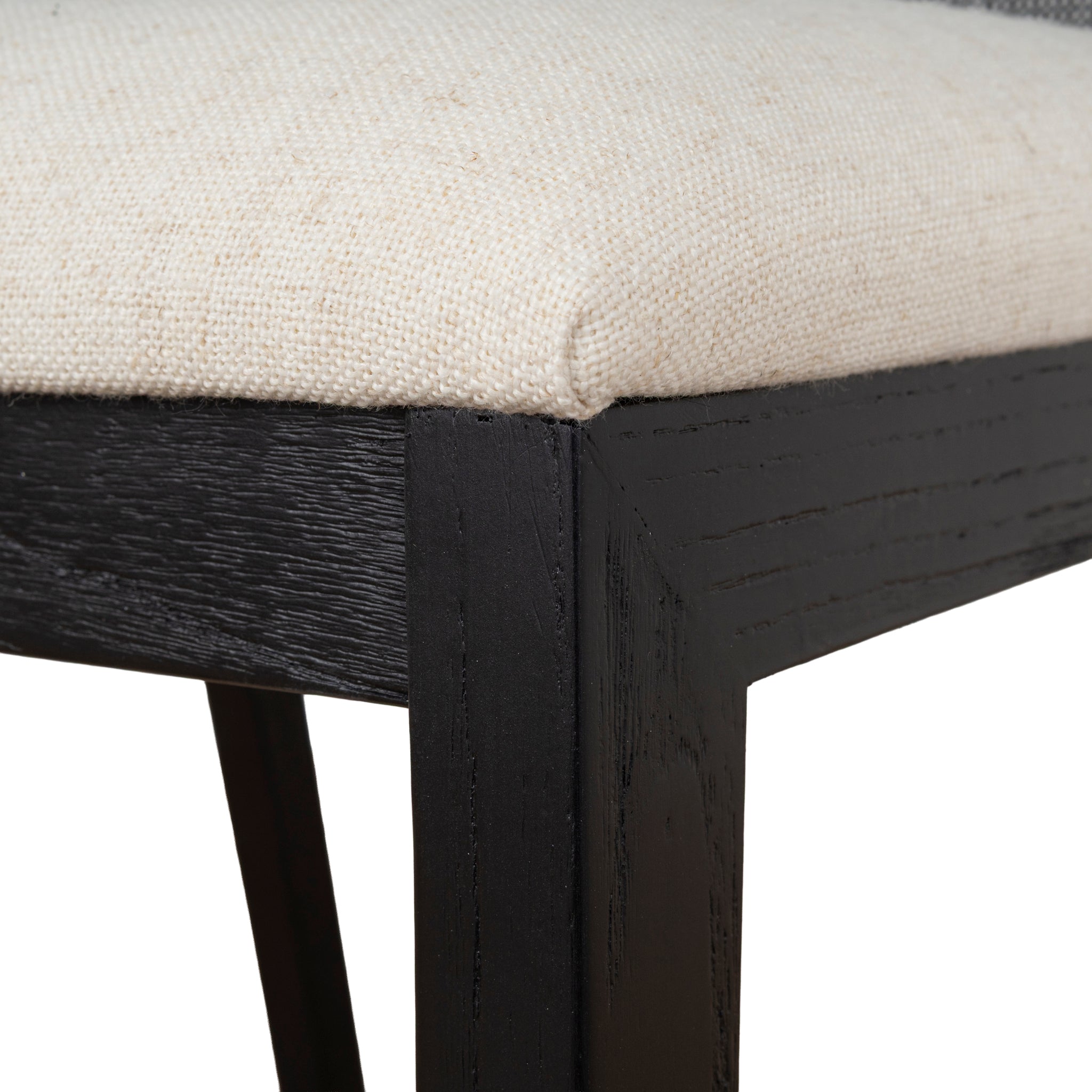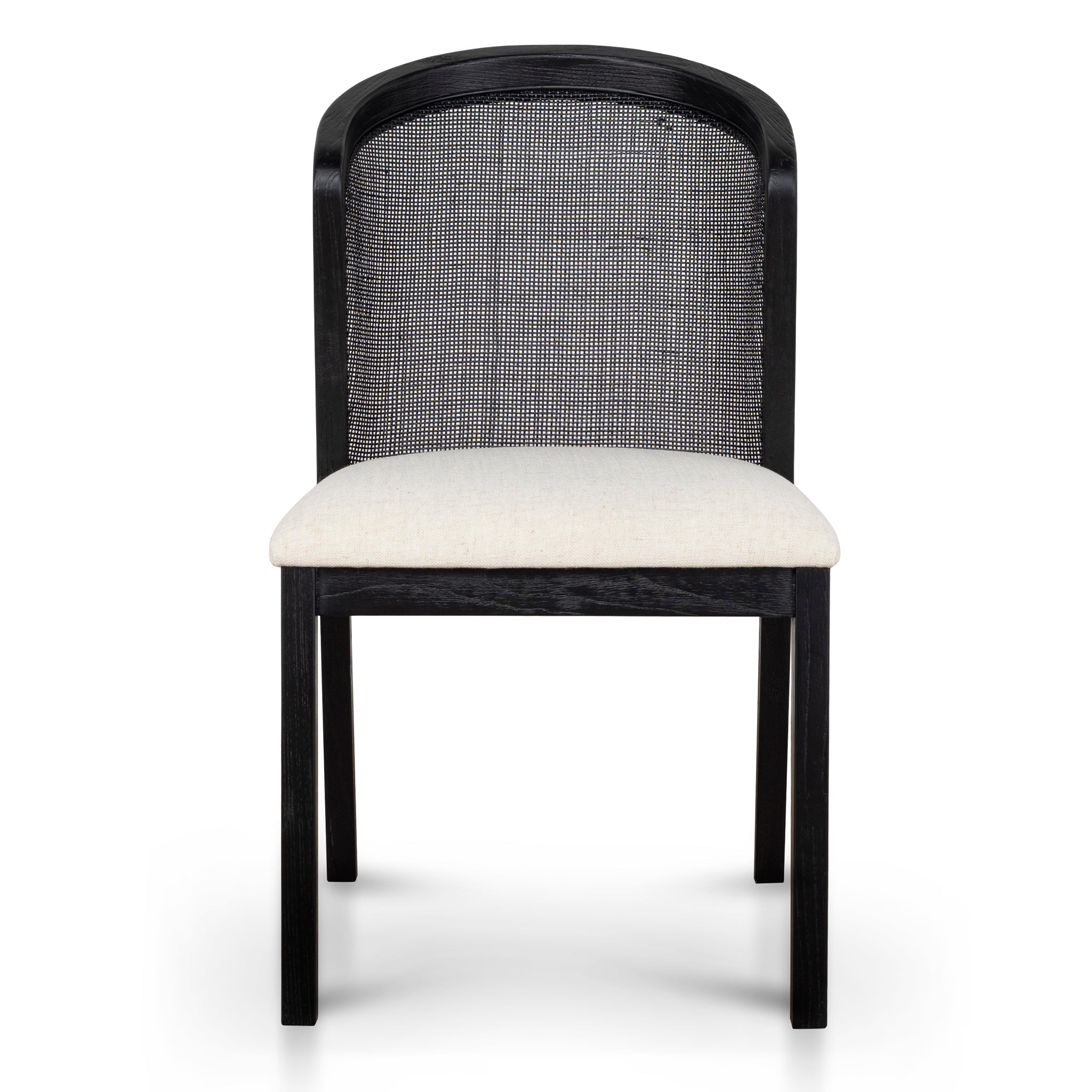 Embrace the harmony of contrast with the Set of 2 - Black ELM Dining ChairSeat is upholstered in 90% polyester and 10% Linen Fabric is finished in Dawn Beige Matte black frame resonating the wood texture 4× square tapered legs made of ELM Curved backrest with perforated weaving 100% Foam filling for soft medium firmness Suitable for commercial use Weight Capacity: 150 kg Product is fully assembled48.5cm (W) x 55cm (D) x 85cm (H) Seat: 48.5cm (W) x 48cm (D) x 48cm (H) Leg Height: 37cmPackaging Note: 2 x chairs per box Box 1/1: 95cmx83cmx50cm, 18.45kg, 0.394cbm