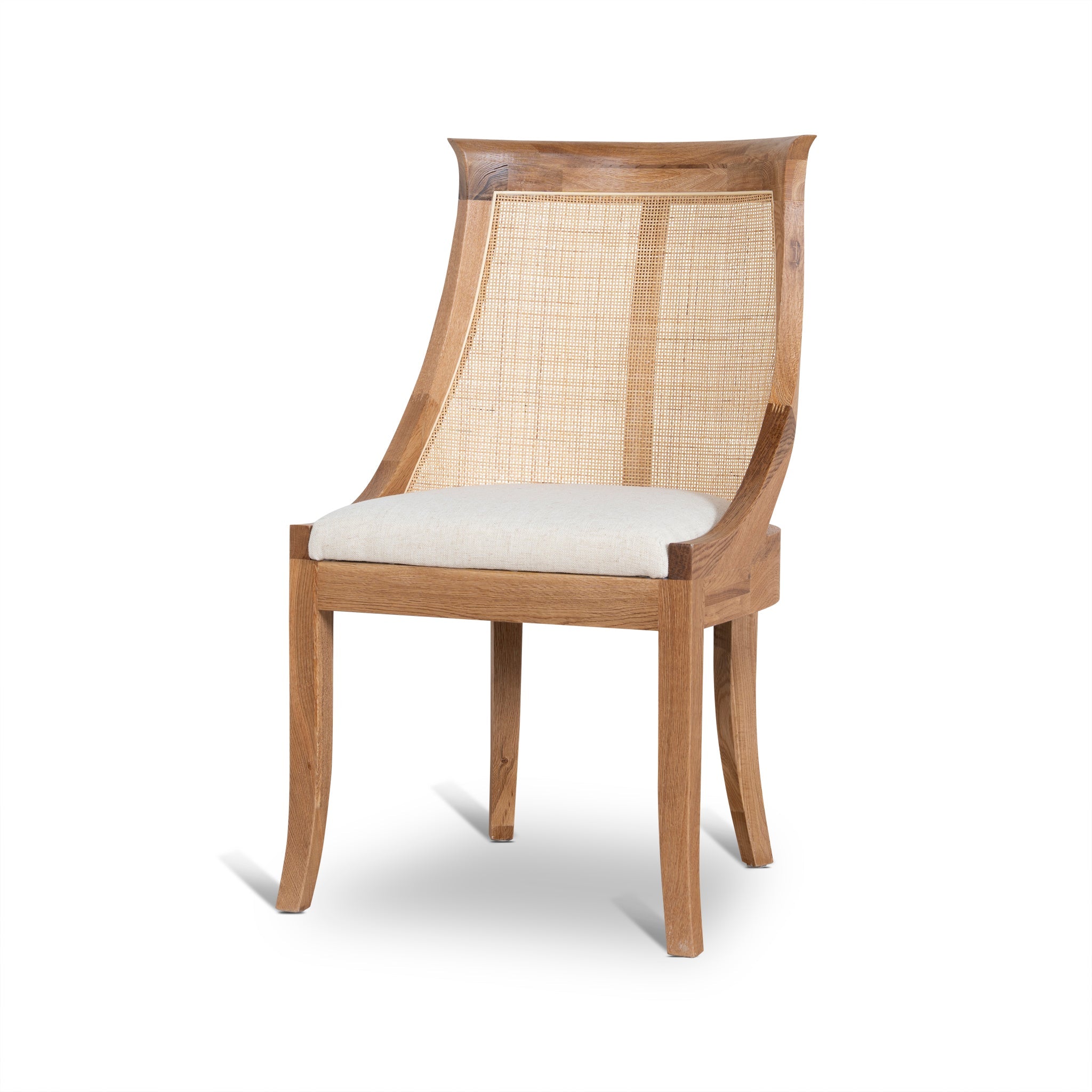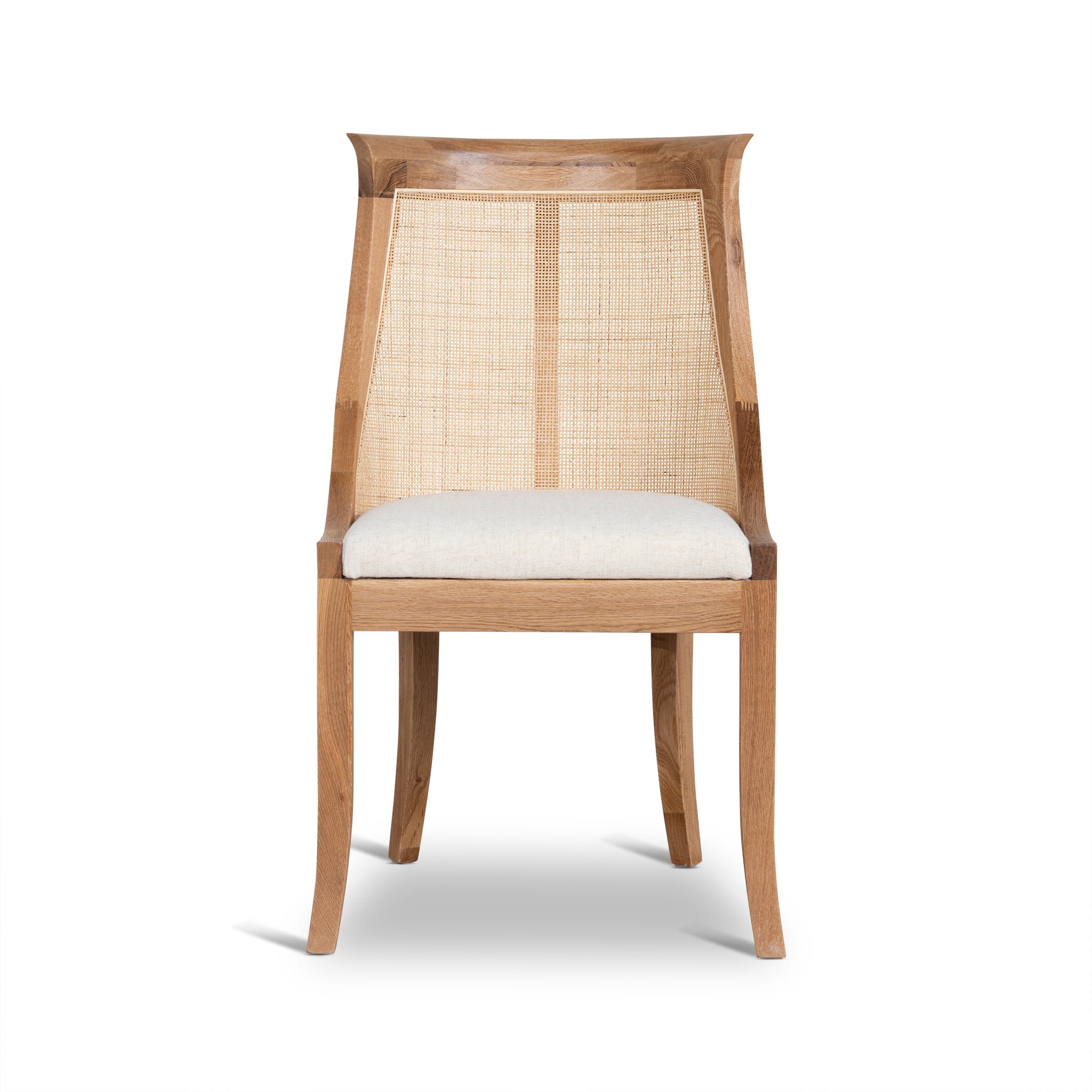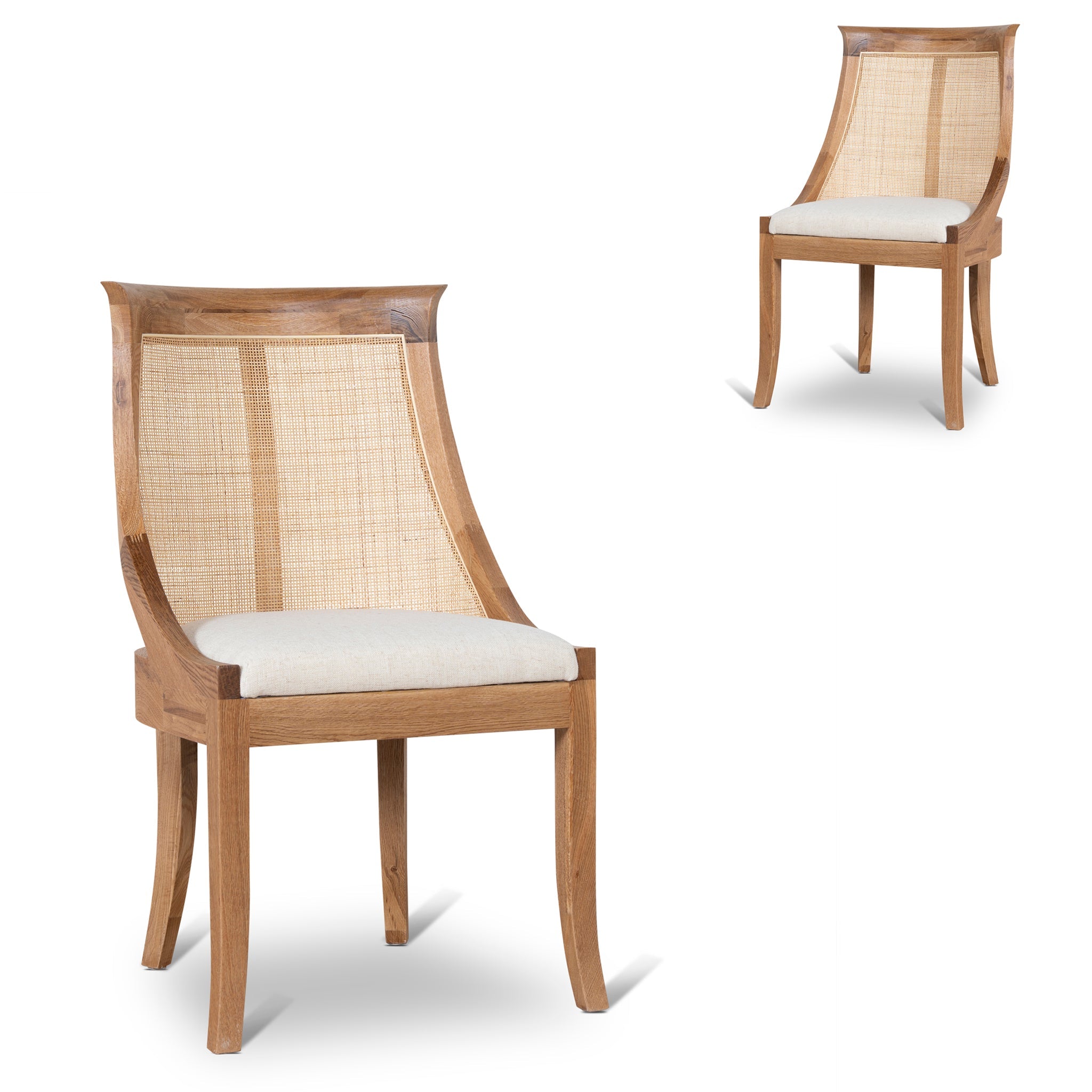 Complete a perfect pairing in your dining set up by introducing the modern coastal build of Dining Chair - Dawn Beige.Seat upholstered with 90% polyester and 10% Linen fabric Frame in a durable pine wood construction Flared legs in rubber wood build Seat rest includes web suspension and foam filling Rattan backrest with exposed frame Backrest curves inwards to create wingback Weight capacity: 150 kg Product is fully assembled58cm (W) x 72cm (D) x 100cm (H) Seat: 46cm (W) x 46cm (D) x 50cm (H)Packaging Note: 2 x chairs per box Box 1/1: 85cmx56cmx104cm, 22kg, 0.495cbm