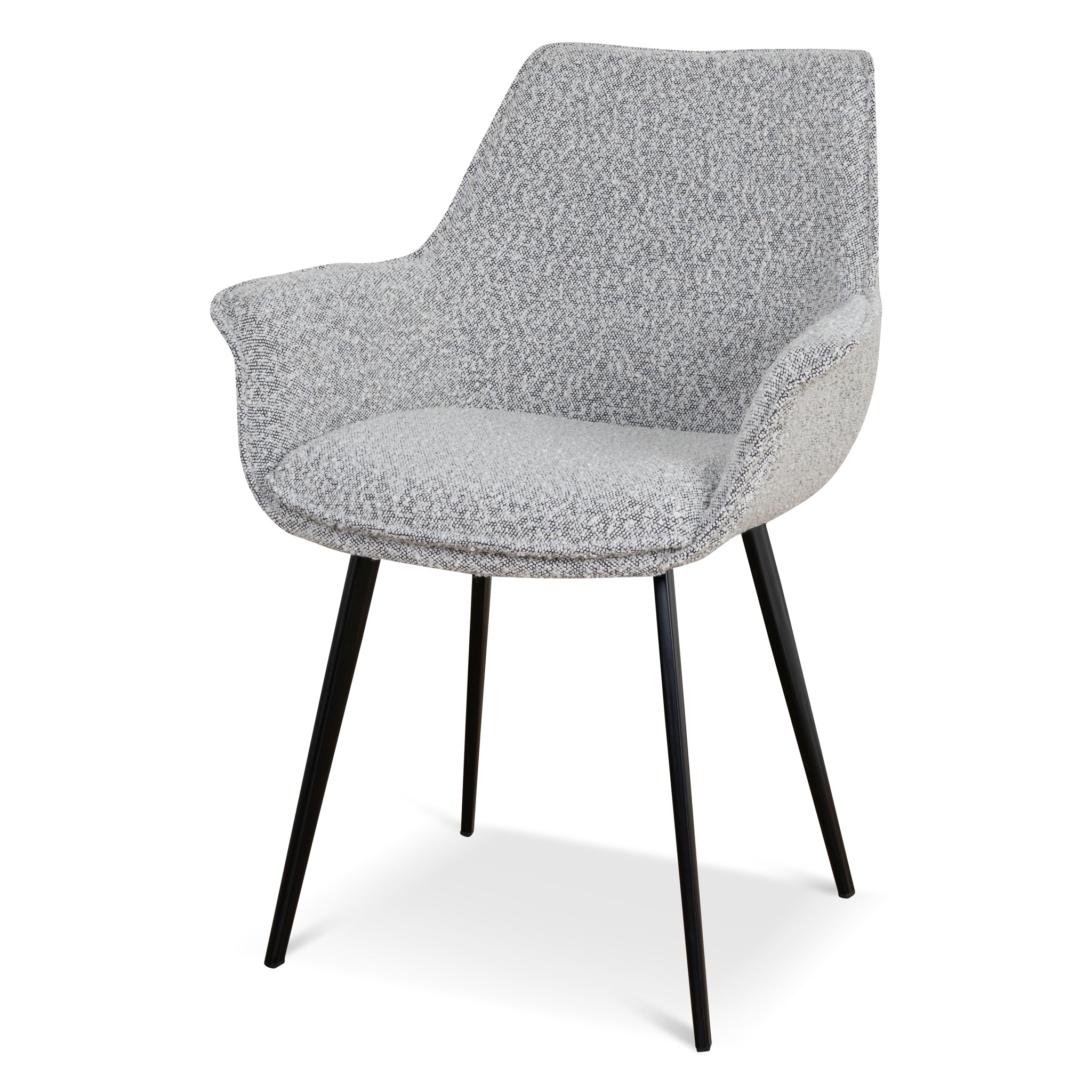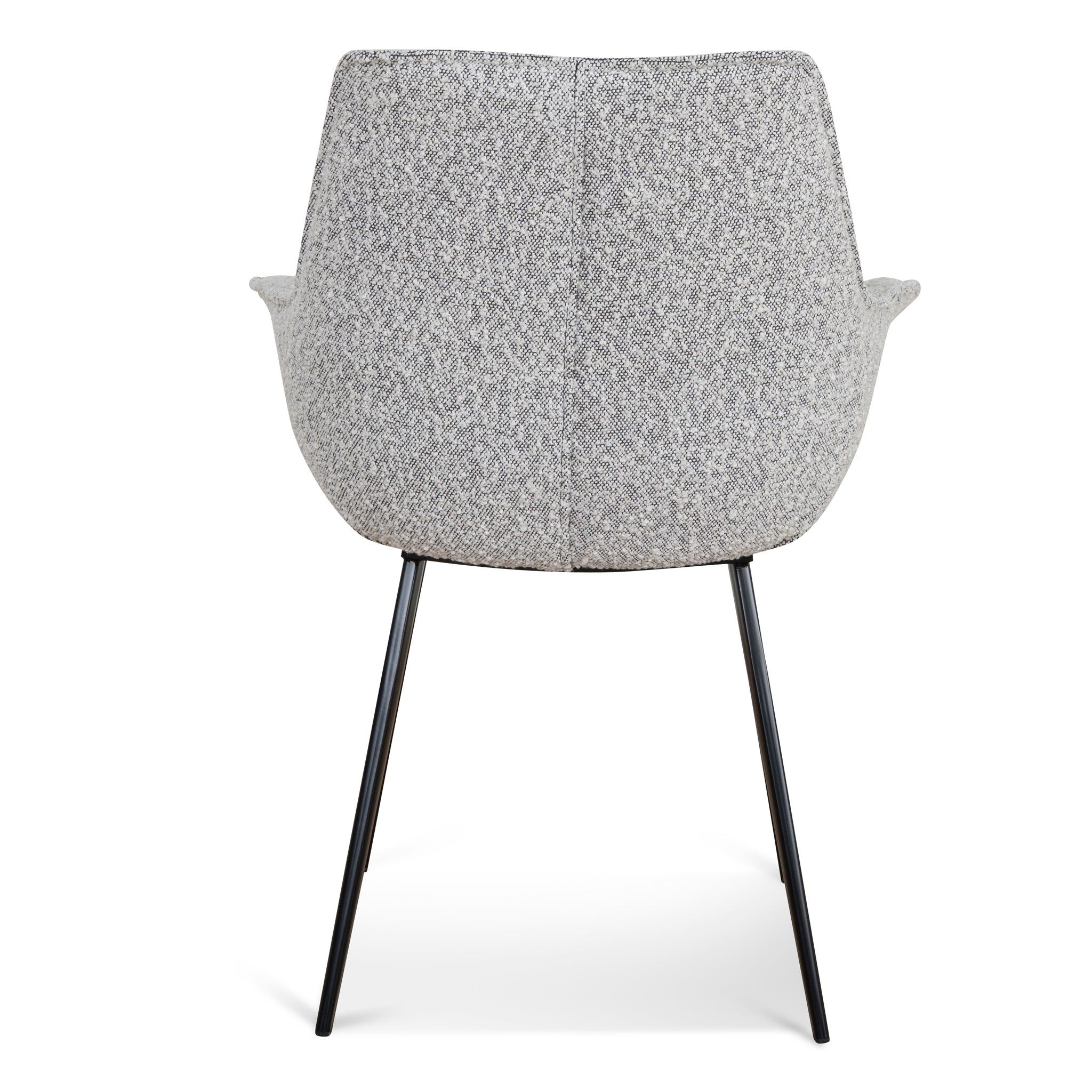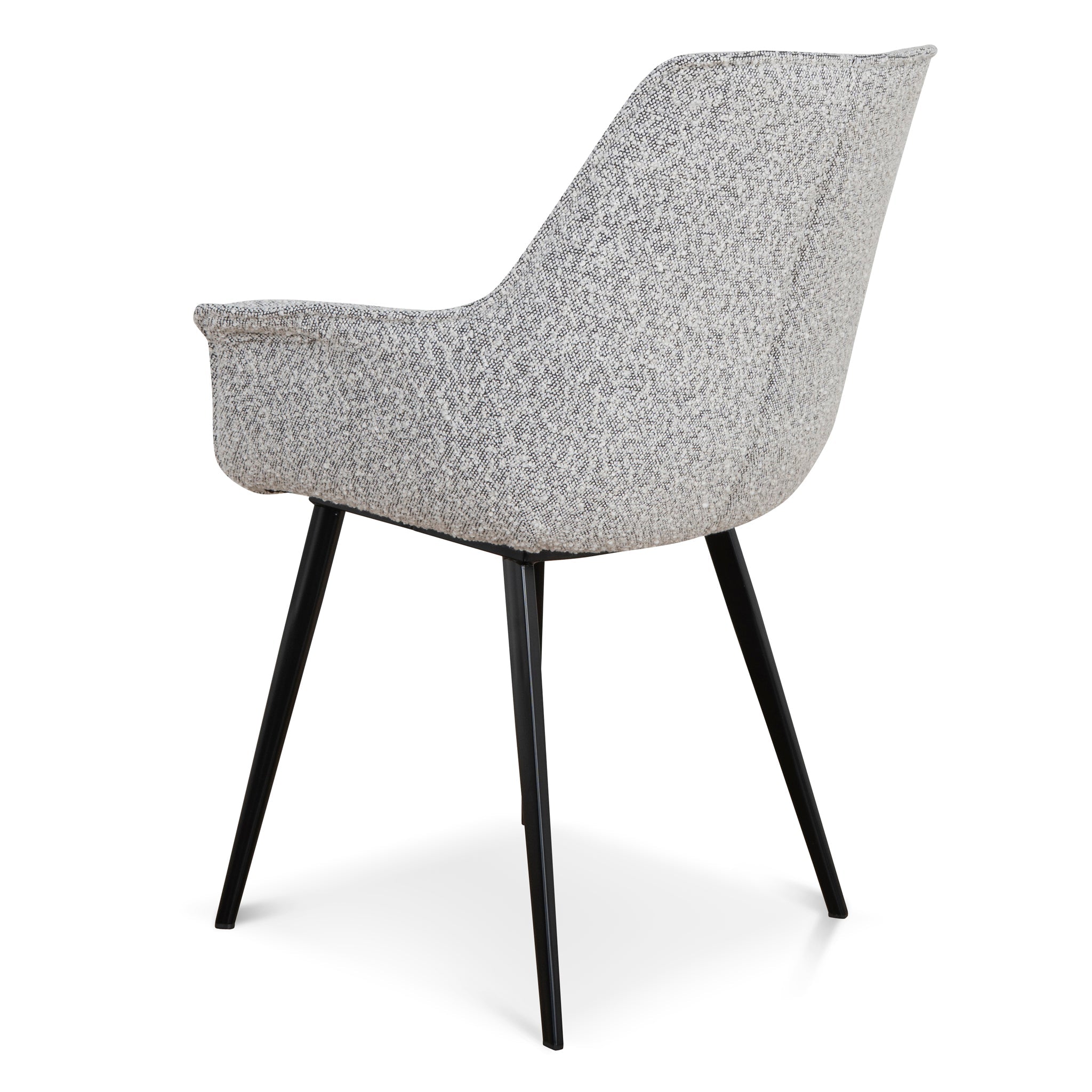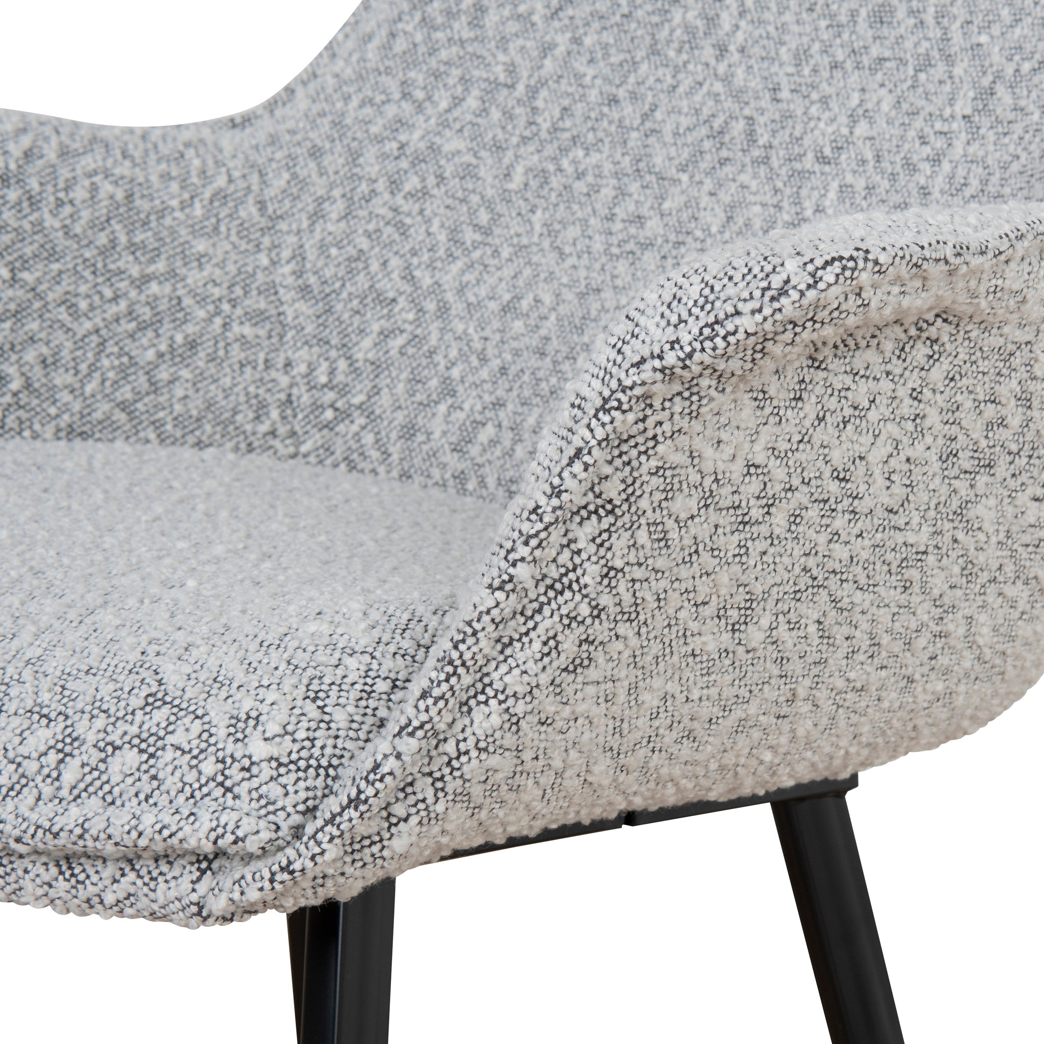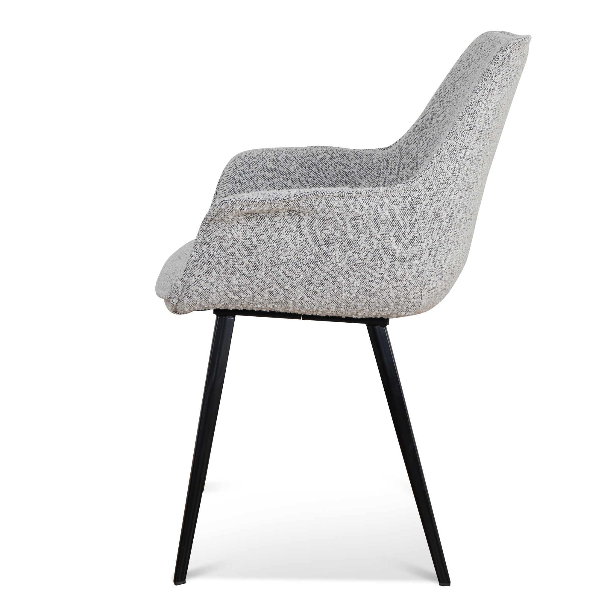 Insert the comforting design of Set of 2 - Fabric Dining Chair - Moonlit Pepper Boucle into the kitchen space.Moonlit Pepper boucle upholsteryPlywood frame constructionFoam filledBlack powder coated metal legsWeight capacity: 130kgProduct comes flat packed and requires minor assembly65cm (W) x 64cm (D) x 88cm (H) Seat Height: 42cm (W) x 49cm (H) Back Height: 45cm Arm Height: 64cmPackaging Note: 2 x Chairs per box Box 1/1: 74cmx72cmx49cm, 19.8kg, 0.2611cbm