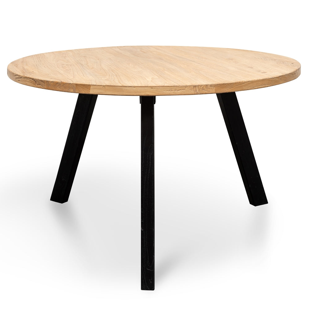 Bring natural rustic vibes to your home using the Reclaimed 1.25m Round Dining Table - Black Legs, a minimalist yet eclectic design whose versatility and functionality juxtapose to offer you a reliable piece of furniture with a timeless look.Reclaimed elm table topBlack metal legsSeats up to 4 peopleProduct comes flat packed and requires a two-person assembly Note: This range uses reclaimed elm timber. Each handmade piece features unique characteristics like cracks, splits, and imperfections. Variations in colour, texture, and pattern are natural and should be appreciated. Differences between shipments are expected.125cm (D) x 73cm (H)
