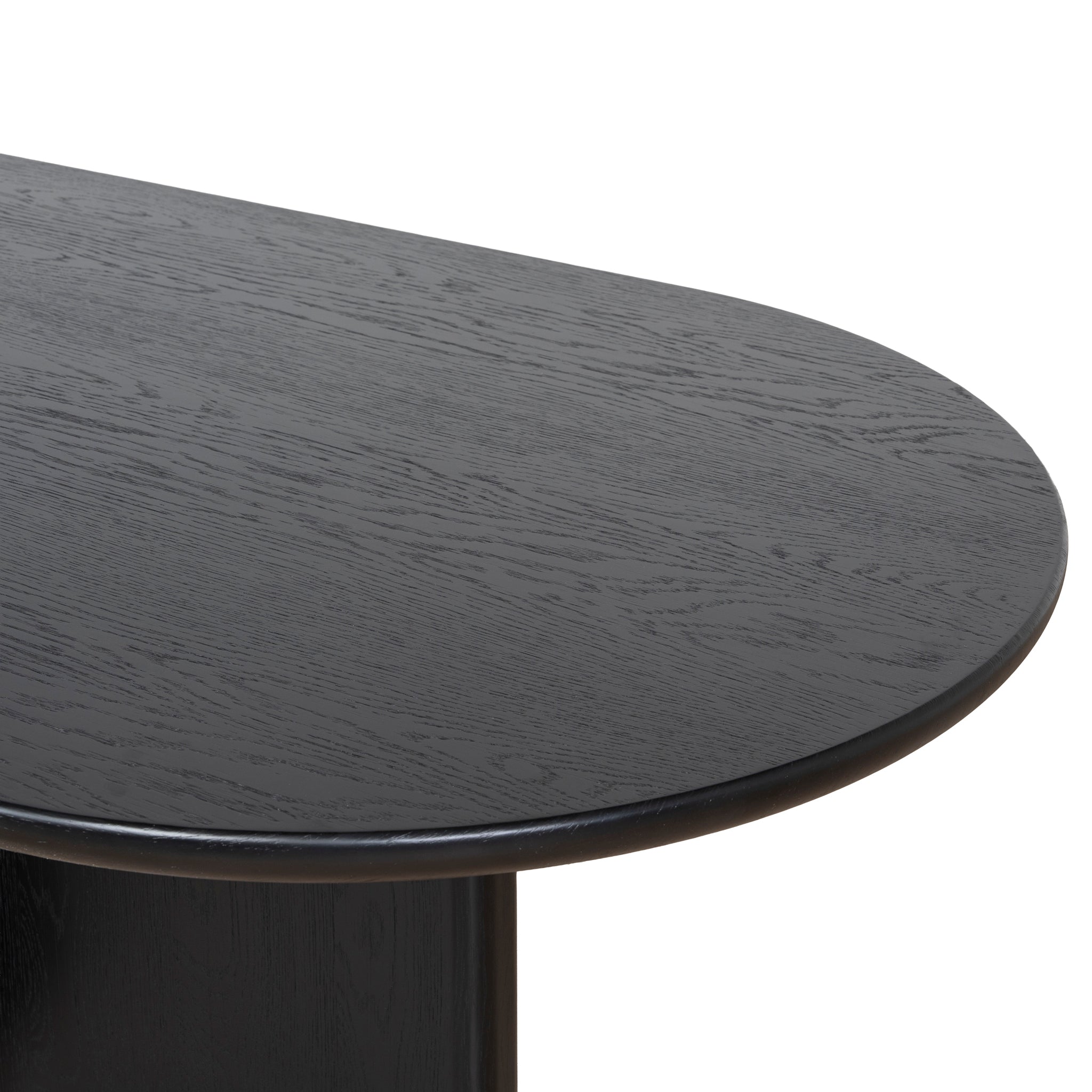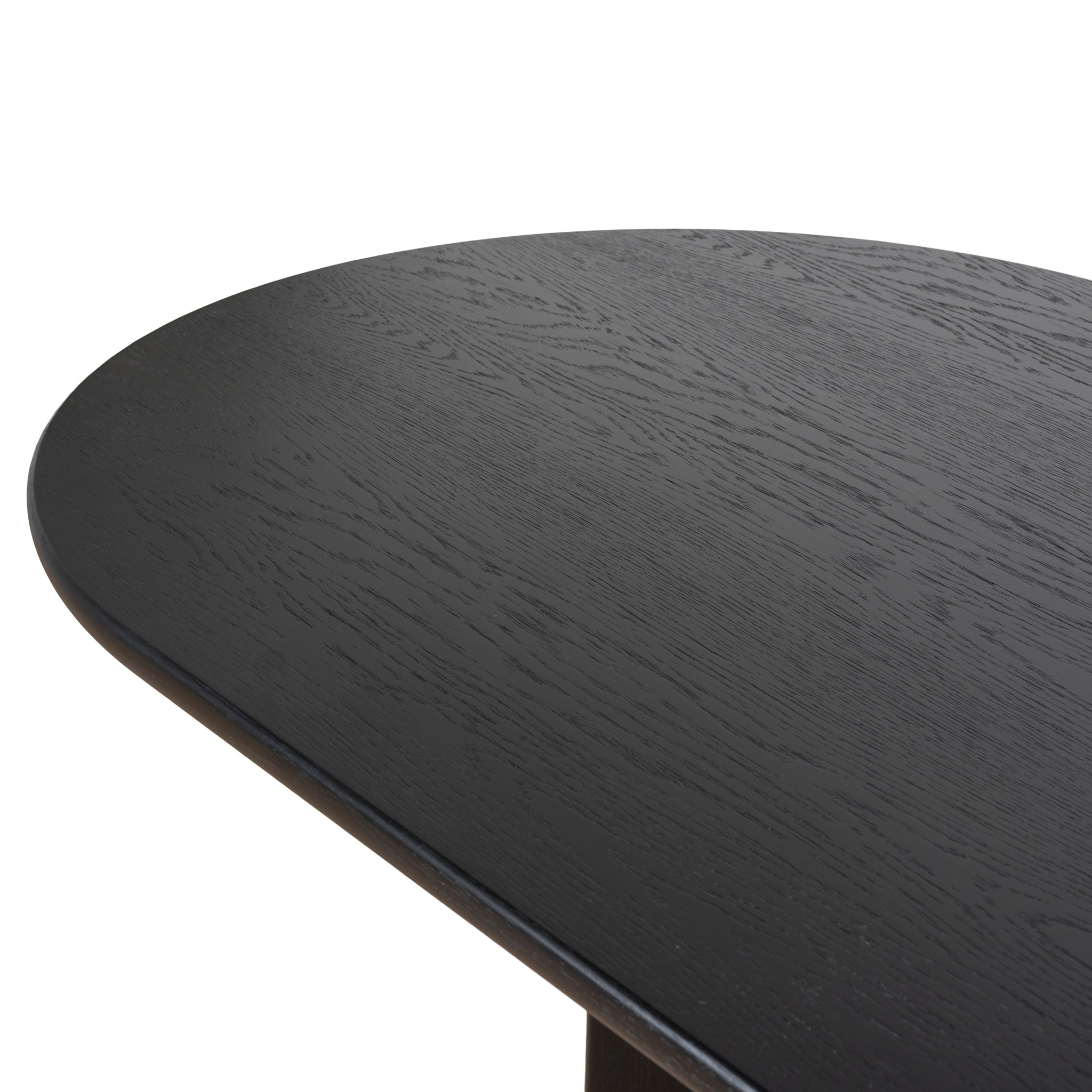 2.4m Dining Table - Full Black is a centrepiece, designed to ground the room while creating a seamless flow of form and function.Engineered wood finished in black oak veneer Full black finish Spacious 2.4m oval tabletop Softly rounded corners Unique dual pedestal-style leg Visible wood grain texture Comfortably seats 6–8 people This product is supplied flat-packed and requires assembly by two people240cm (W) x 110cm (D) x 75cm (H) Table Hanging: 42.2cm Table Thickness: 5cm Base: 65.8cm (W) x 26cm (D) x 70cm (H)Box 1/2: 249cmx119cmx13cm, 82kg, 0.3852cbm Box 2/2: 75cmx67cmx34cm, 58kg, 0.1709cbm