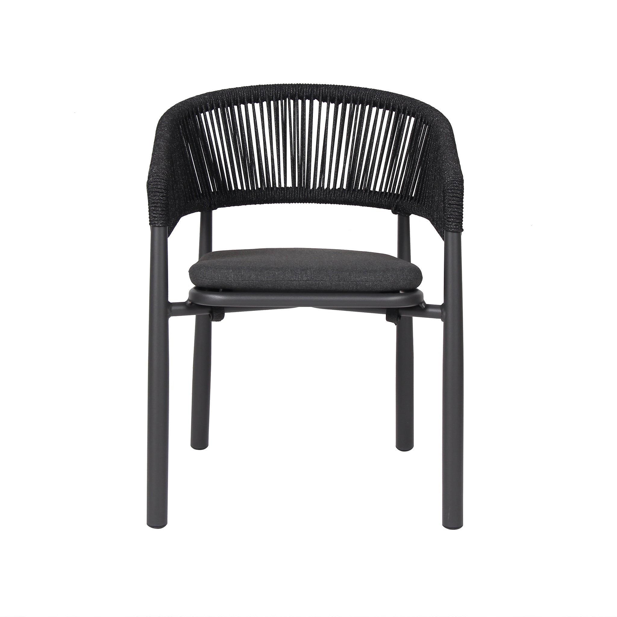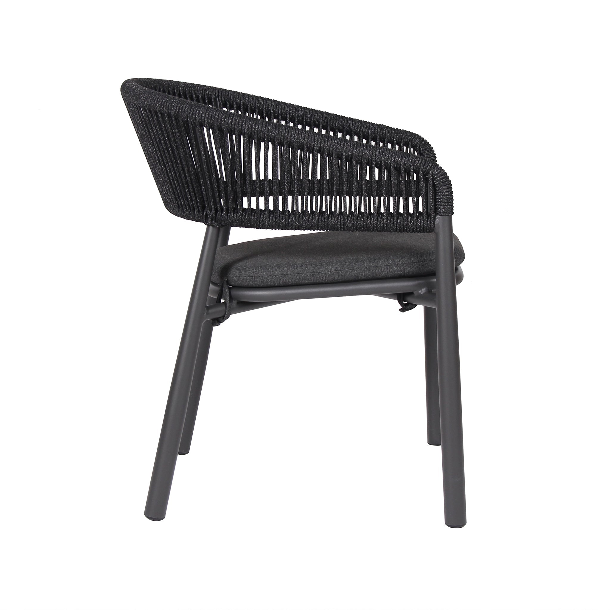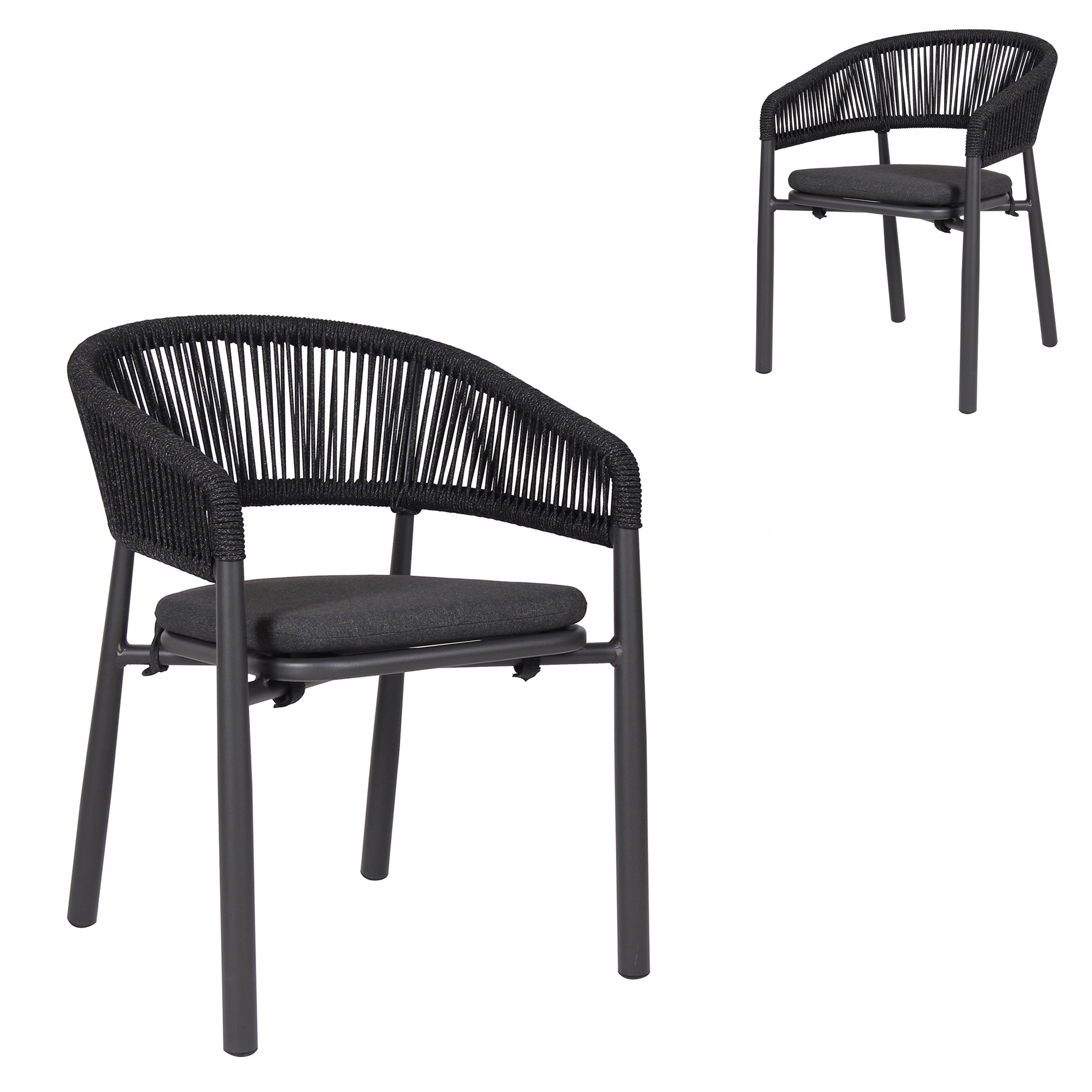 Transform your patio into an elegant oasis with the Set of 2 - Outdoor Dining Chair - Charcoal.Charcoal polyester fabric upholstery Aluminum frame and legs 6mm light grey rope seat Rope with spandex polyester core Outer layer of rope; UV-resistant plastic and high-strength yarn 4cm thick cushioned seat with foam filling Soft-to-medium seat firmness Curved backrest and armrests Versatile tones suit any outdoor decor Weight Capacity: 200 kg Product comes fully assembled57cm (W) x 63cm (D) x 78cm (H) Seat: 41cm (W) x 48cm (D) x 47.5cm (H) Backrest Height: 35cm Distance between Legs (Front): 48.7cm Distance between Legs (Side): 49cm Arm Height: 70cm Leg Height: 41.7cmPackaging Note: 2 x Chairs per box Box 1/1: 74cmx59cmx95cm, 14.2kg, 0.4148cbm