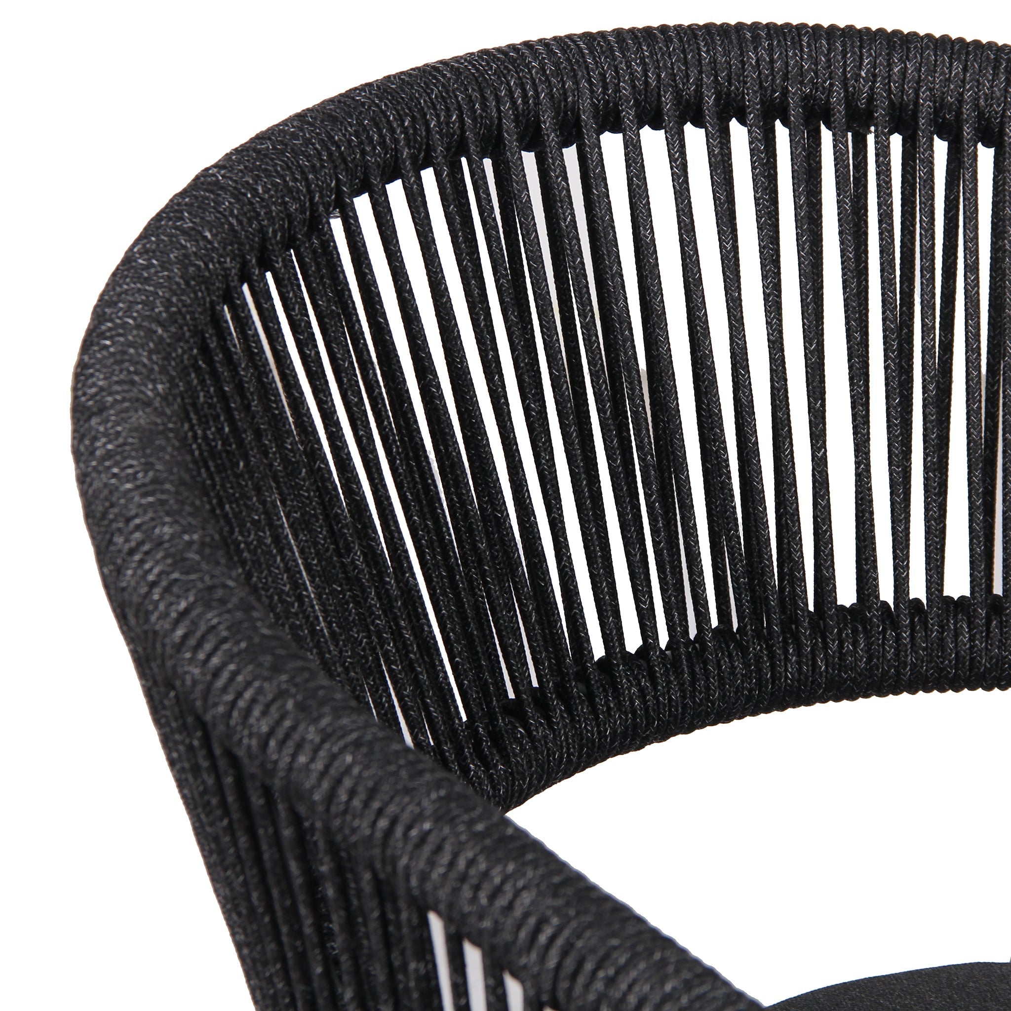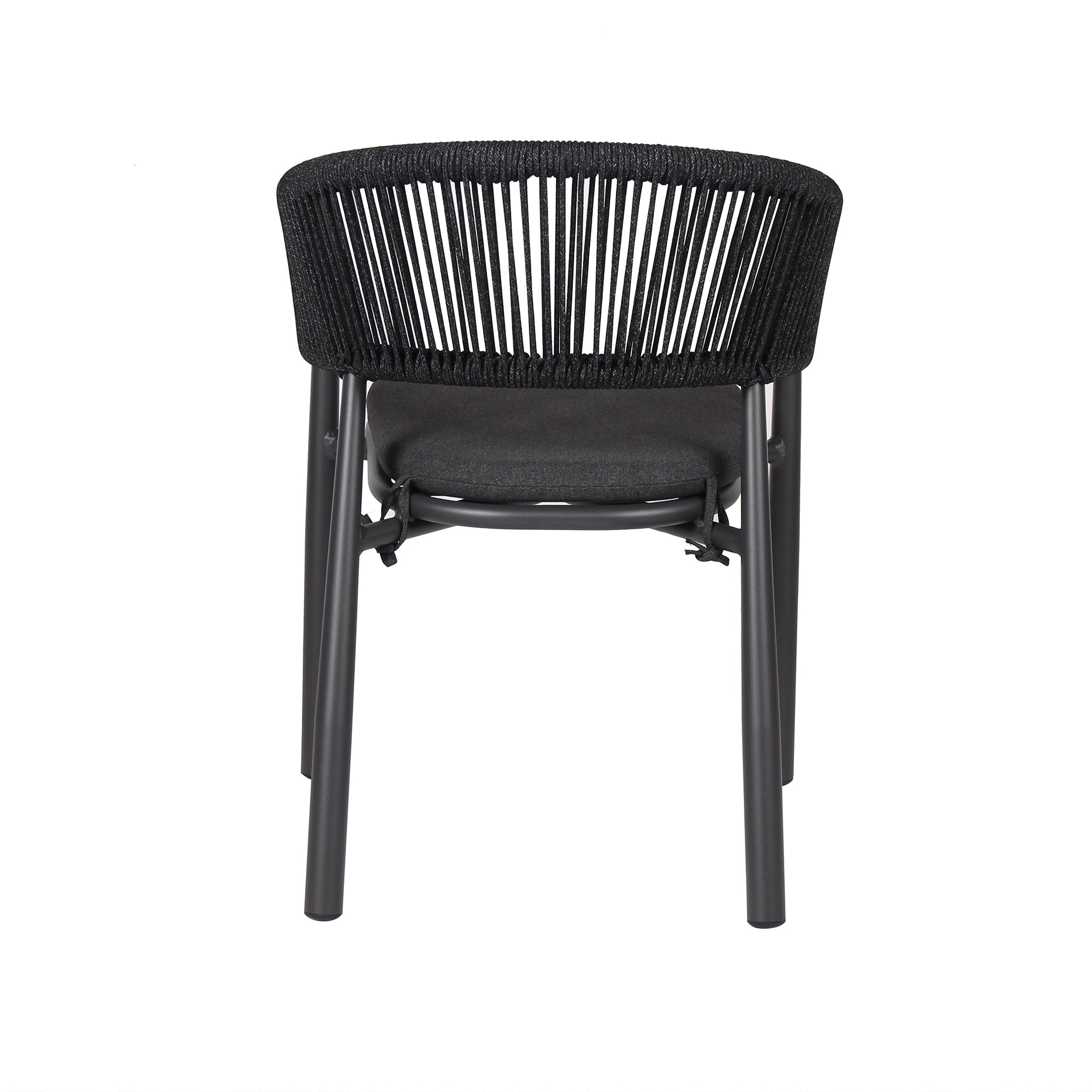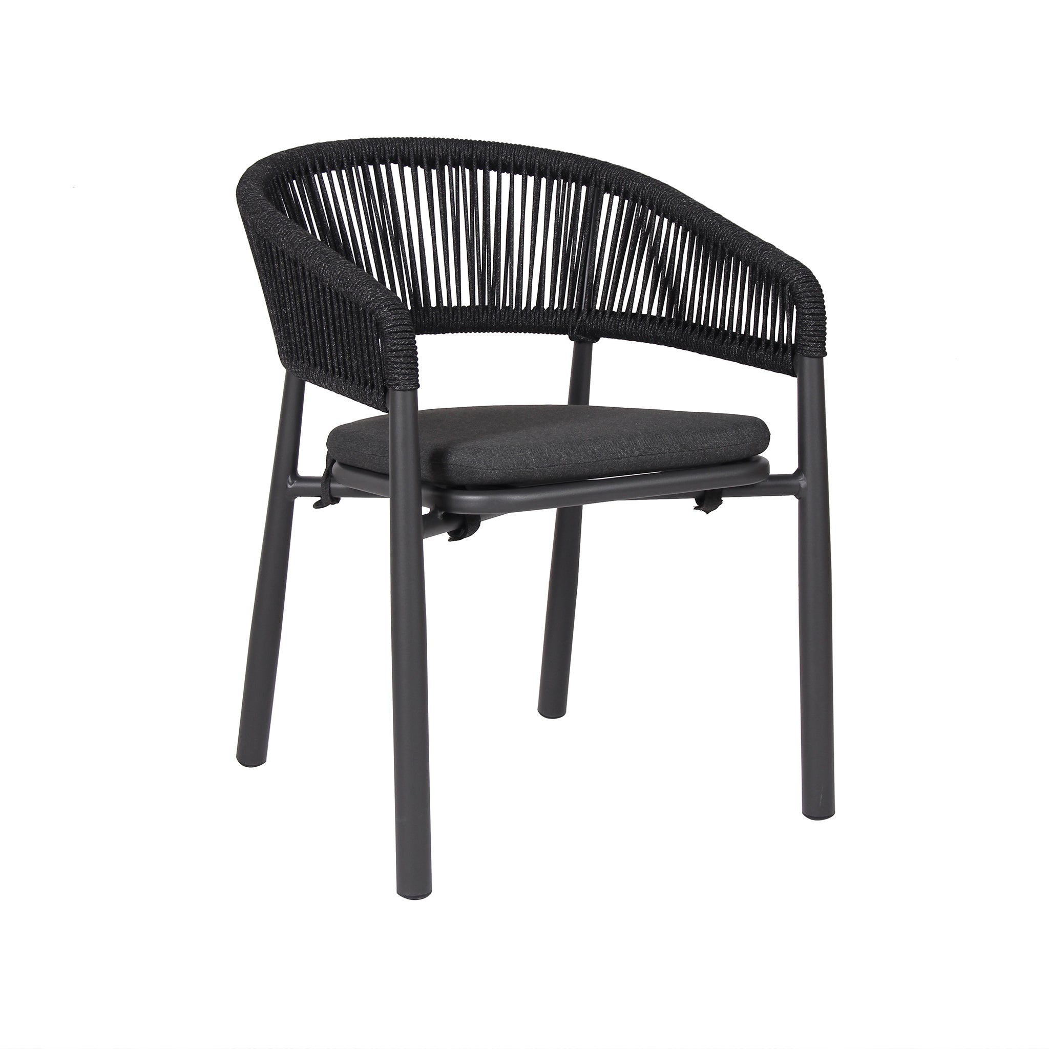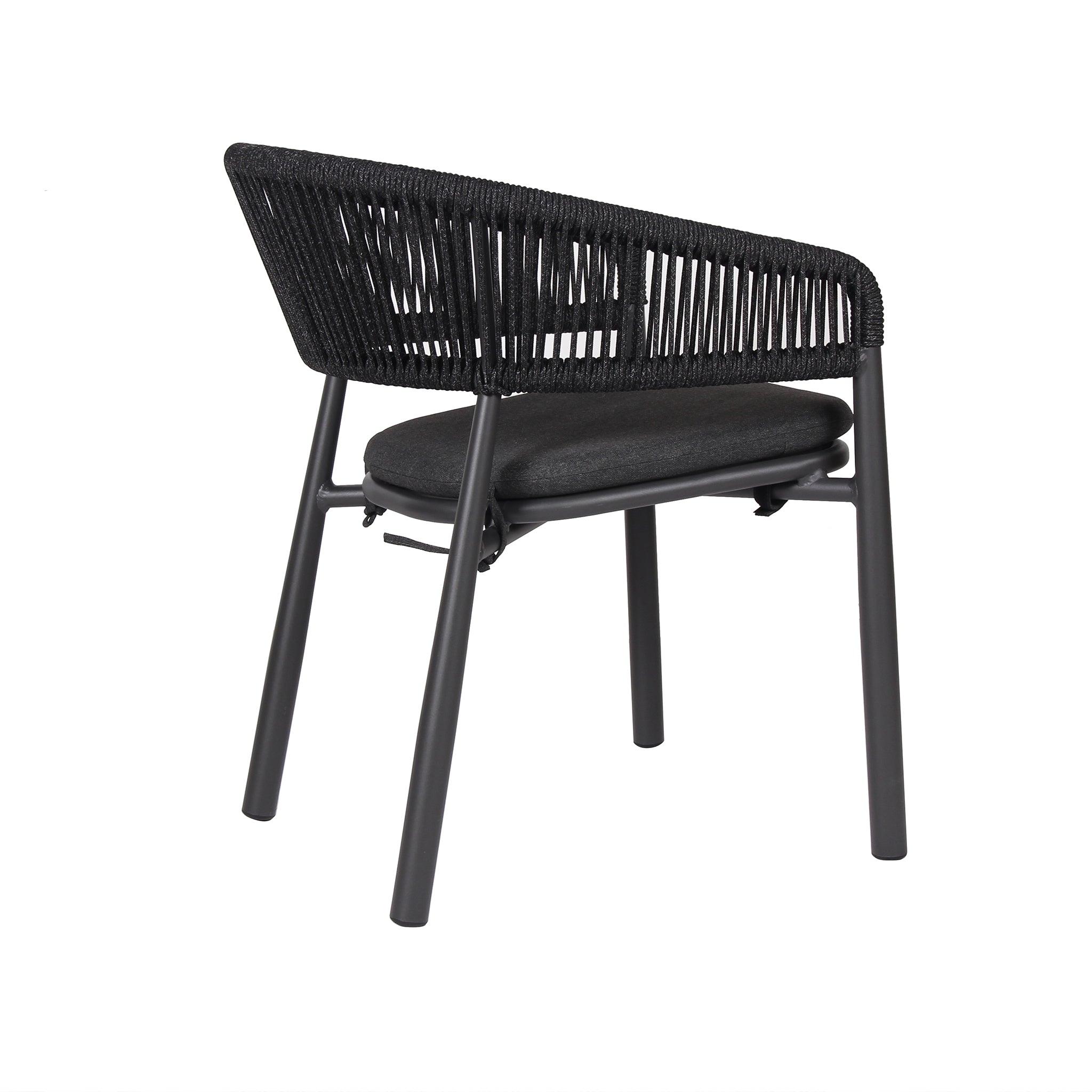 Transform your patio into an elegant oasis with the Set of 2 - Outdoor Dining Chair - Charcoal.Charcoal polyester fabric upholstery Aluminum frame and legs 6mm light grey rope seat Rope with spandex polyester core Outer layer of rope; UV-resistant plastic and high-strength yarn 4cm thick cushioned seat with foam filling Soft-to-medium seat firmness Curved backrest and armrests Versatile tones suit any outdoor decor Weight Capacity: 200 kg Product comes fully assembled57cm (W) x 63cm (D) x 78cm (H) Seat: 41cm (W) x 48cm (D) x 47.5cm (H) Backrest Height: 35cm Distance between Legs (Front): 48.7cm Distance between Legs (Side): 49cm Arm Height: 70cm Leg Height: 41.7cmPackaging Note: 2 x Chairs per box Box 1/1: 74cmx59cmx95cm, 14.2kg, 0.4148cbm