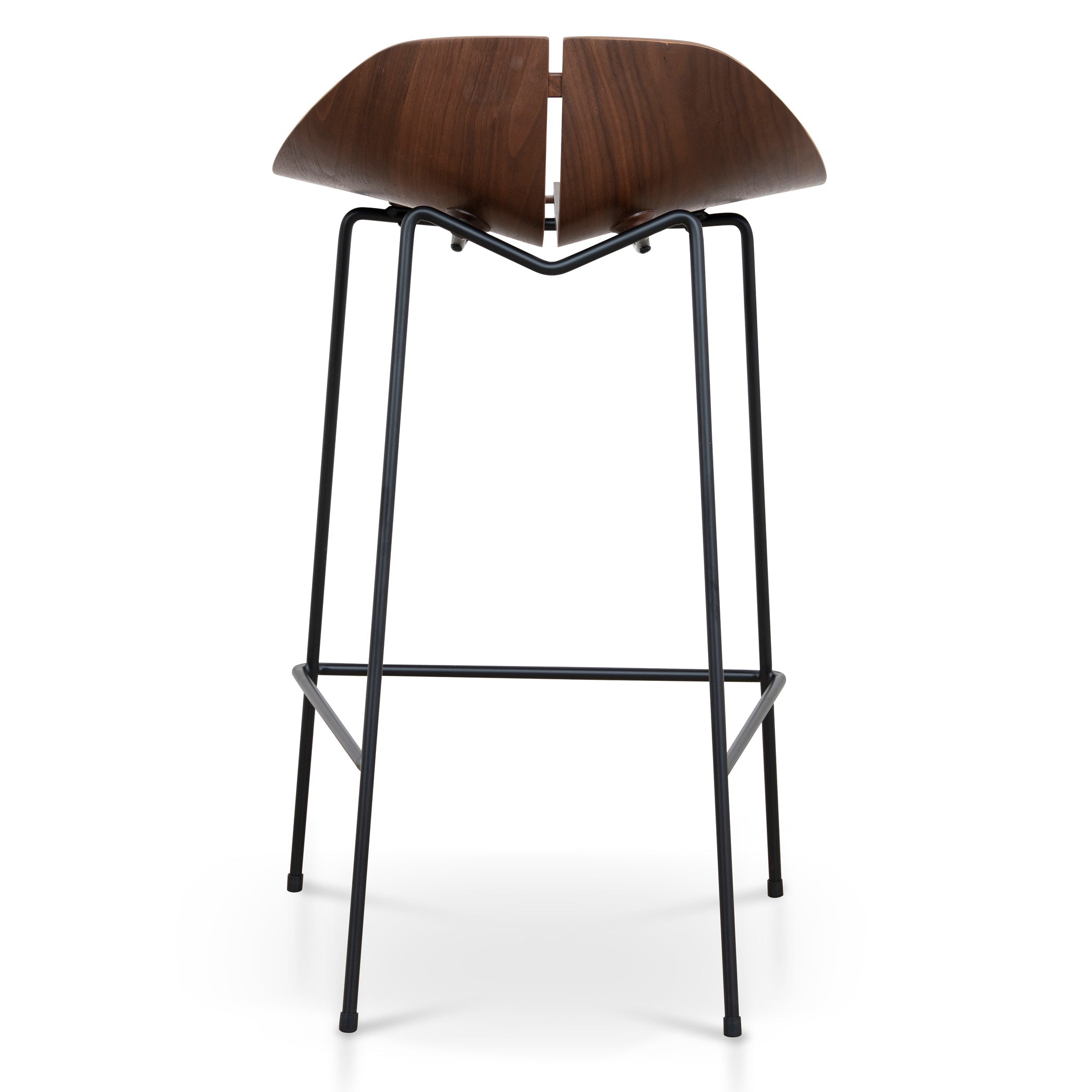 Beyond its visual appeal, the Bar Stool promises durability and practicality.Steel base in matte black finish Curved plywood seat with walnut wood Ergonomic design Open-frame structure Walnut and black palette Weight capacity: 150 kg Fully assembled for convenience46.7cm (W) x 49.5cm (D) x 79.5cm (H) Seat: 46.7cm (W) x 43.2cm (D) x 65cm (H) Footrest Height: 21cm Distance between Legs (Front): 45cm Distance between Legs (Back): 32.2cm Distance between Legs (Side): 47.6cmBox 1/1: 54cmx52cmx91cm, 11kg, 0.2555cbm