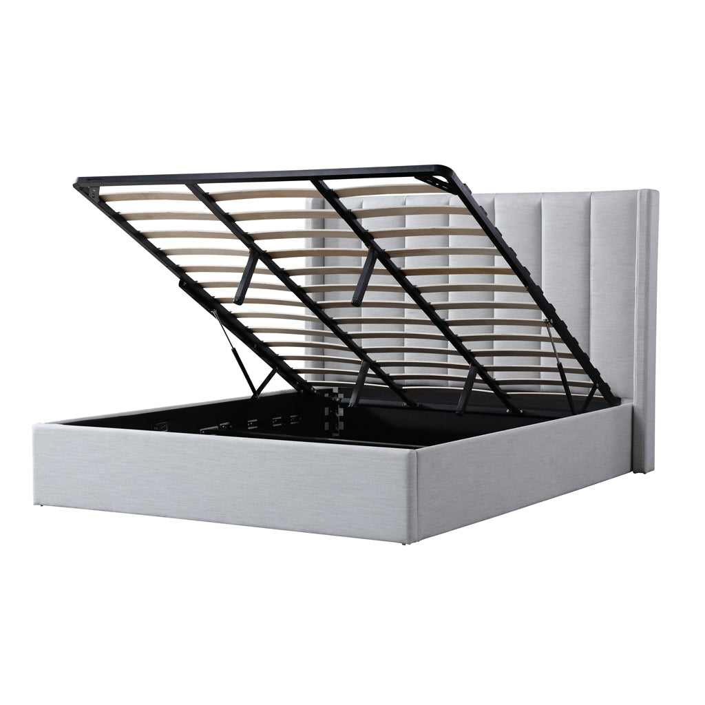 Created to meet all convenience and comfort needs, the Fabric King Bed in Pearl Grey with Storage is a bedroom essential.Pearl grey polyester upholstery Black metal frame with timber slats Gas lift mechanism supports up to 50 kg Weight capacity: 350 kg Accommodates a King mattress Product comes flat packed and requires two-person assembly and a screwdriver Note: Bed mattress not included. Please ensure your mattress is compatible with the provided slat construction of this bed frame.200cm (W) x 215cm (D) x 121cm (H) Height from the floor to the slats: 30cm Distance between the slats: 7.5cm Height of the storage: 28cmBox 1/2: 136cmx220cmx8cm, 35kg, 0.2394cbm Box 2/2: 32cmx206cmx18cm, 45kg, 0.1187cbm