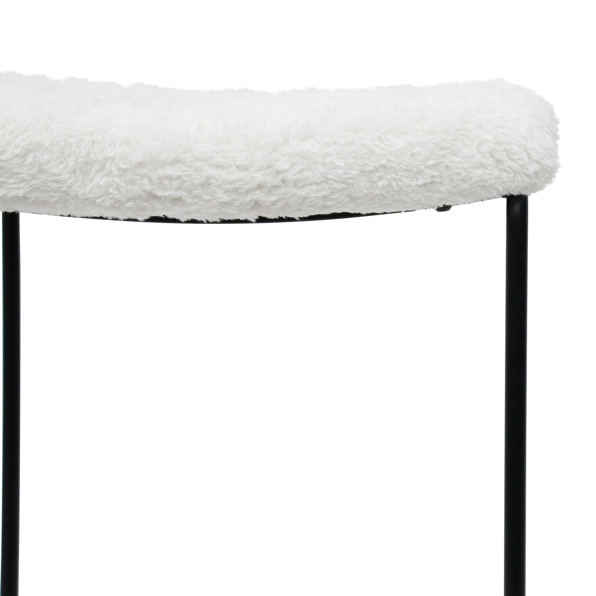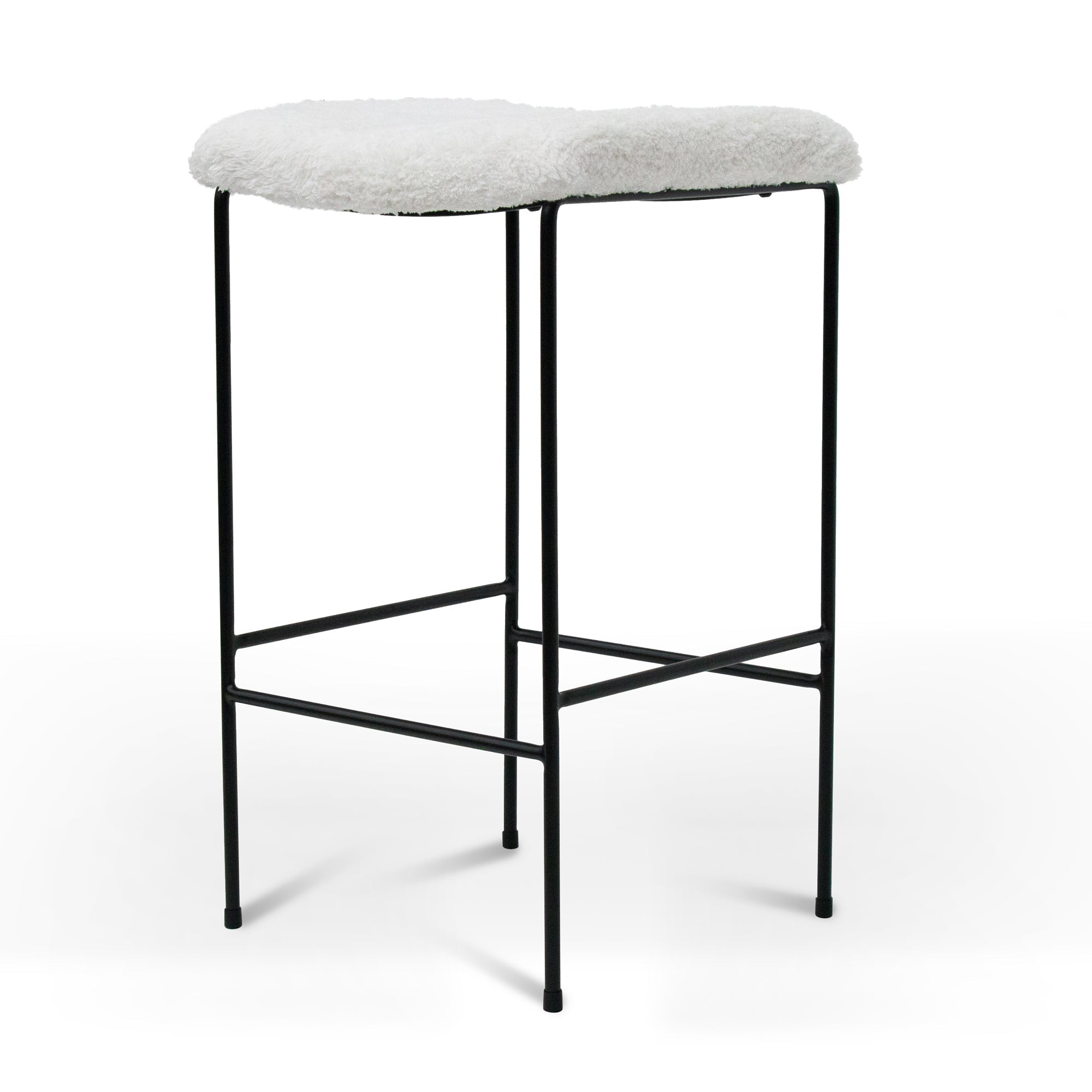 The polyester upholstered seat design of 65cm Bar Stool - White Synthetic Wool provides a smooth, comfortable, and anti-slip texture and legs for prevailing strength.100% white polyester upholstered seat Black Iron frame and footrest Soft-Medium Seat Firmness Simple, elegant, and lightweight Rectangular edges & four-sided footrest Straightly support angle 4 solid-turned lags 150kg weight capacity Product comes fully assembled38cm (W) x 38cm (D) x 65cm (H)Box 1/1: 40cmx40cmx70cm, 6kg, 0.1120cbm