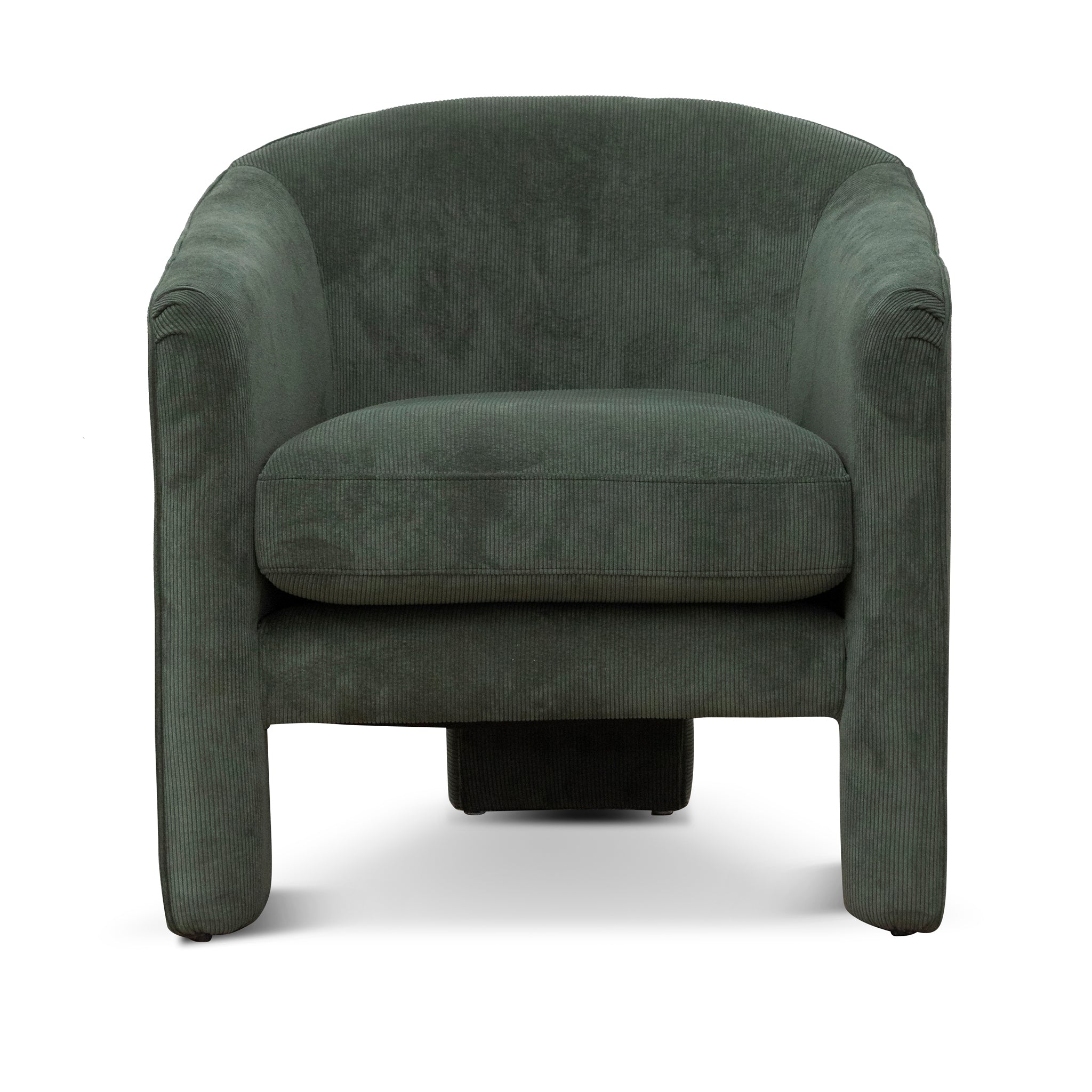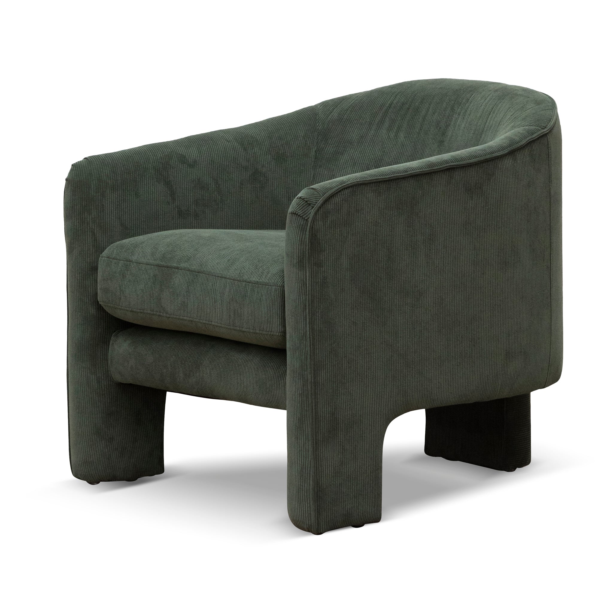 Add a unique presence to your home with the Fabric Armchair - Olive green.Upholstered in an Olive green corduroy fabric54% polyester and 46% acrylic blendPine wood frame and plastic feetThree-legged designFoam-filled cushionSpring suspension systemSoft-medium firmnessSuitable for commercial use.Product comes fully assembled78cm (W) x 82cm (D) x 75cm (H) Seat: 60cm (W) x 58cm (D) x 48cm (H) Arm: 8cm (W) x 68cm (H)Box 1/1: 82cmx84cmx77cm, 45kg, 0.5304cbm