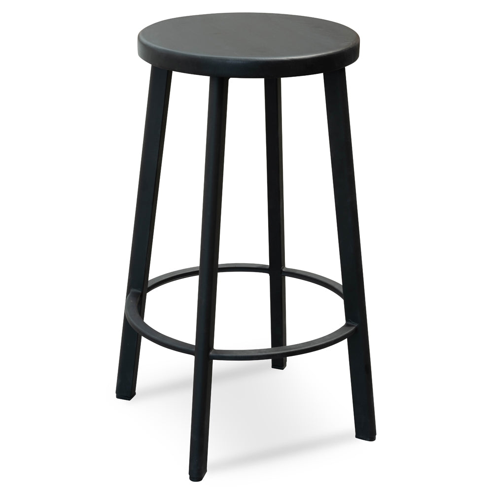 Introduce 65cm Bar Stool With Black Timber Seat - Black Frame to your dining decor, bringing practical seating and visual balance to the space.Thick and flat metal legs and frame in a matte black finish for ultimate stability Durable round timber seat in a black finish Additional round footrest offers support Feet protectors included to prevent slipping and scuffing Weight Capacity: 120 kg Product comes fully assembled Elevate your bar or kitchen with our stylish bar stools. These versatile seating options combine comfort and modern design for a welcoming space.37.5cm (W) x 37.5cm (D) x 65cm (H) Seat Diameter: 34cm Seat Thickness: 3cmPackaging Note: 2 x Stools per box Box 1/1: 115cmx40cmx40cm, 15kg, 0.1840cbm