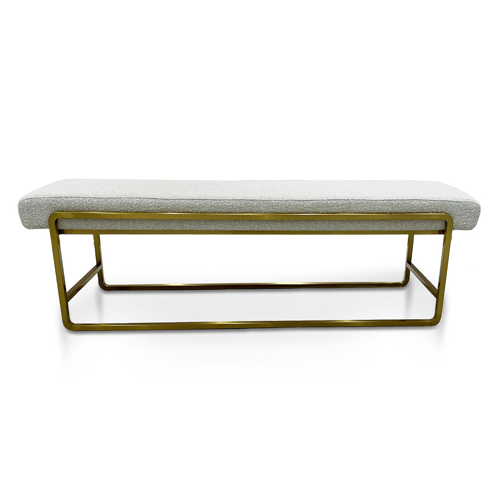 Enhance your living space with this stunning 1.52m Bench and experience the perfect blend of elegance and functionality.Pearl grey boucle polyester upholsteryStainless steel frame in a brushed gold finish with an oil coatingFoam cushion with web suspensionSoft-medium seat firmnessWeight Capacity: 150 kgProduct comes flat packed and requires minor assembly151.5cm (W) x 40.5cm (D) x 48cm (H) Seat: 151.5cm (W) x 37.5cm (D) x 48cm (H) Leg Height: 41.5cmBox 1/1: 154cmx43cmx27cm, 22kg, 0.1788cbm