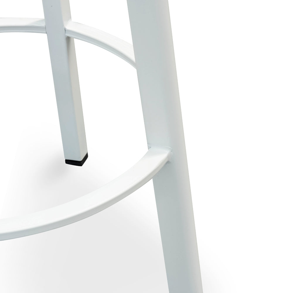 Surround your dining counter with timeless style thanks to the stylish and practical 65cm Bar Stool - Natural Timber Seat - White Frame.Thick and flat metal legs and frame in a white finish for ultimate stability Durable round timber seat in a natural wood veneer finish Additional round footrest offers support Black feet protectors included to prevent slipping and scuffing Weight Capacity: 120 kg Product comes fully assembled37.5cm (W) x 37.5cm (D) x 65cm (H) Seat Diameter: 34cm Seat Thickness: 3cmPackaging Note: 2 x Stools per box Box 1/1: 115cmx40cmx40cm, 15kg, 0.1840cbm