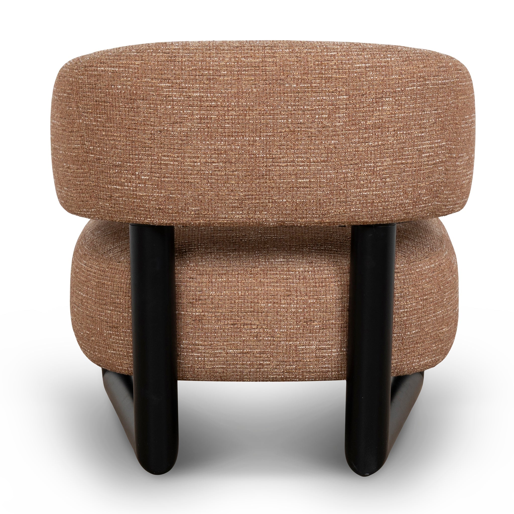 The Armchair - Russet Brown is a refined fusion of sculptural elegance and everyday comfort.Russet brown polyester upholstery Pine wood frame construction Web and spring suspension Ash wood legs Foam filling Soft-to-medium seat firmness Low open-back profile with bold architectural base Gently curved backrest Weight Capacity: 300 kg Product comes fully assembled75cm (W) x 86cm (D) x 73cm (H) Seat: 56cm (W) x 42cm (D) x 64cm (H) Arm Height: 61cm Leg Height: 19cmBox 1/1: 77cmx88cmx75cm, 30kg, 0.5082cbm