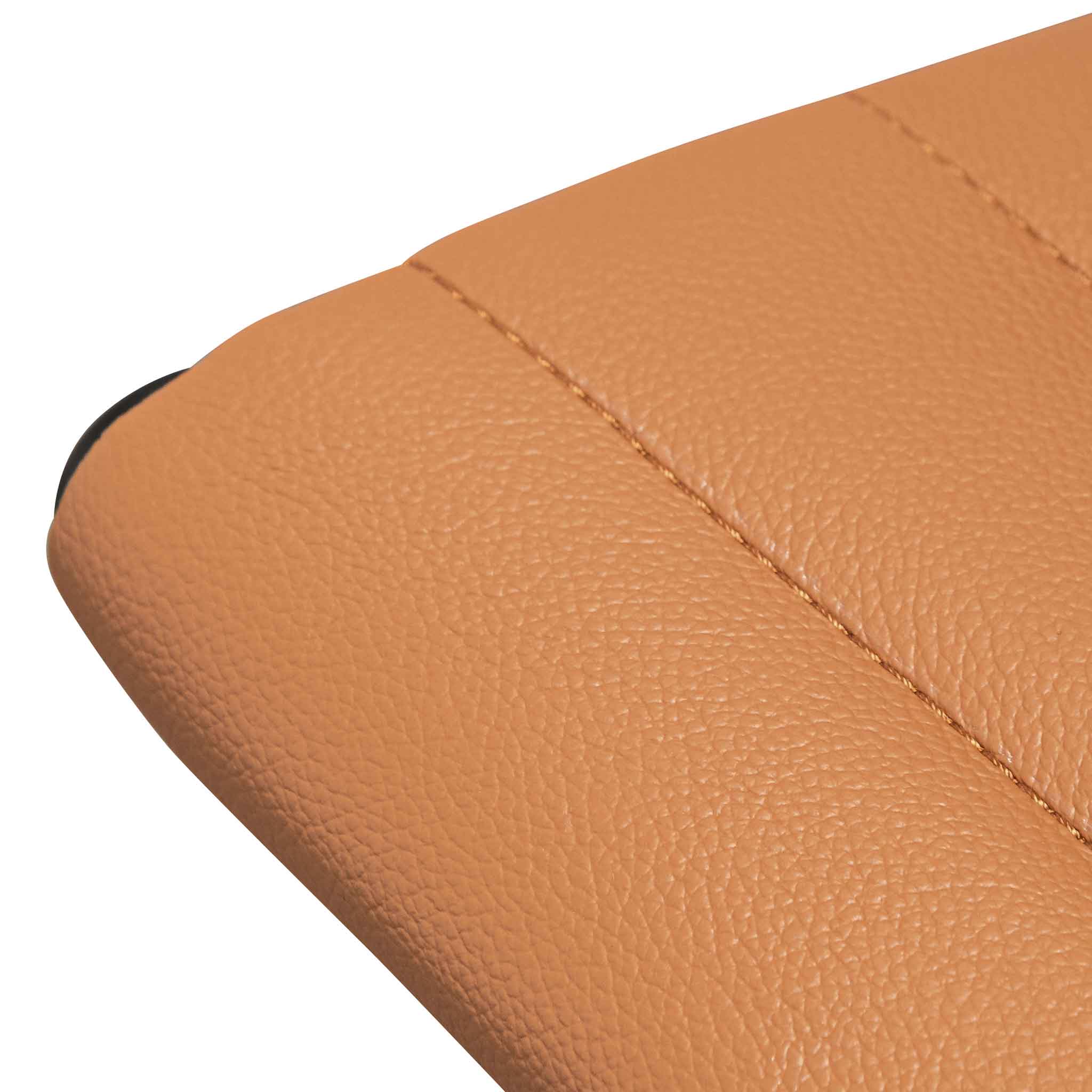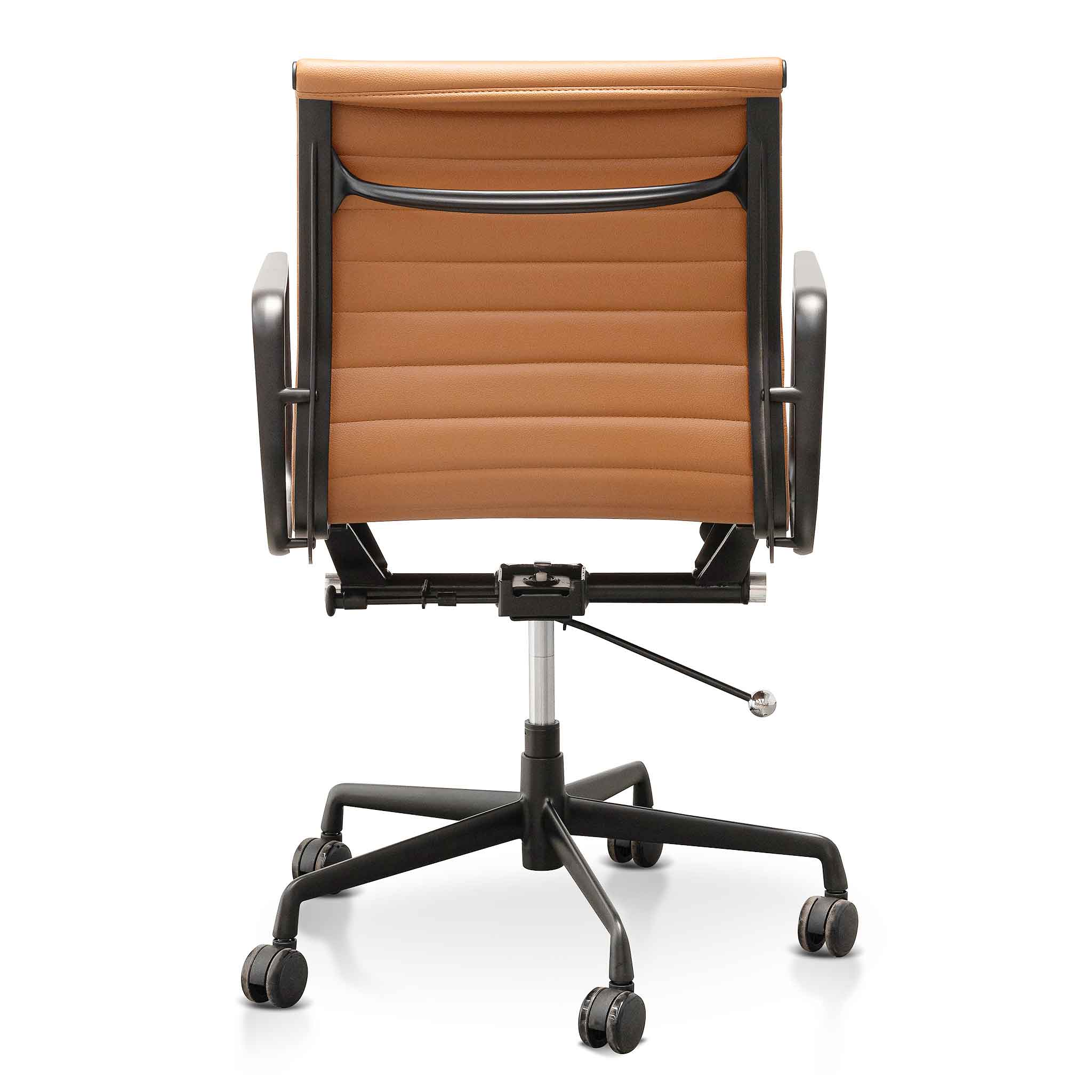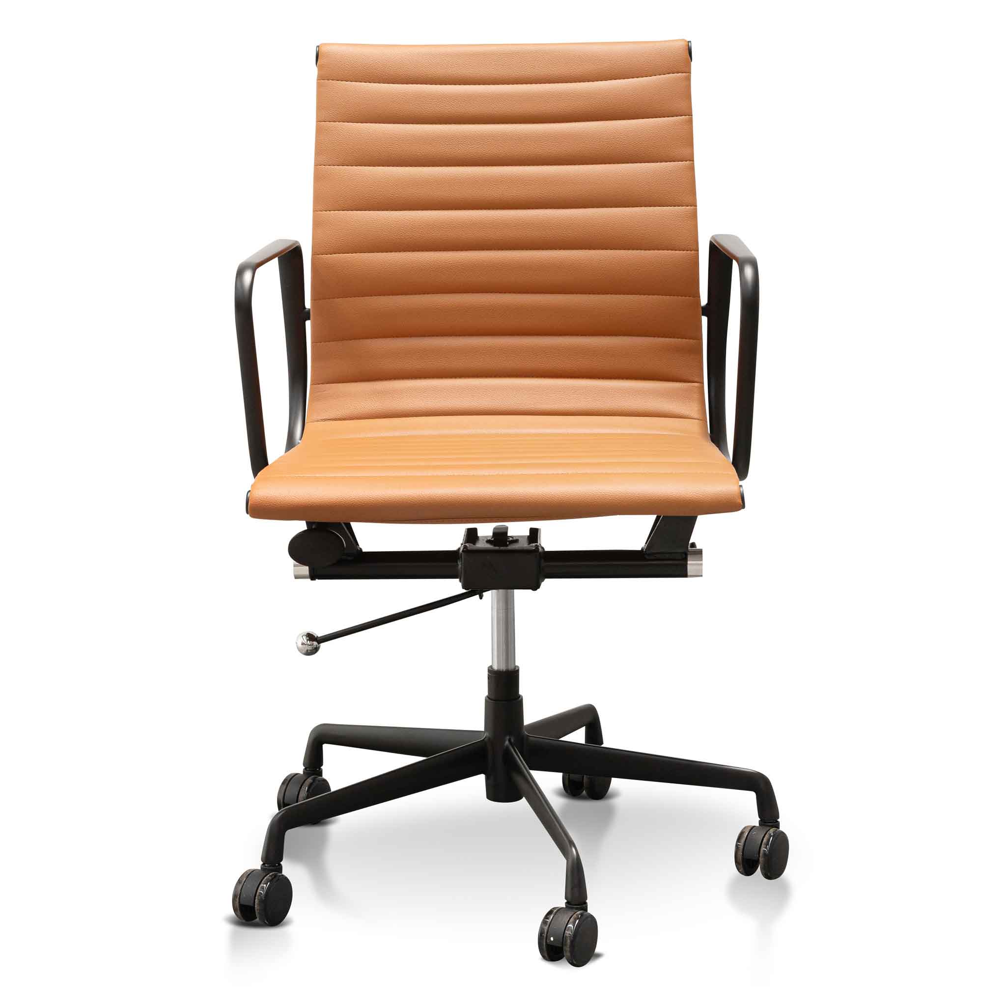 Create an immediately modern and functional office space with the timeless and classic design of Floyd Low Back Office Chair - Saddle Tan in Black Frame.Seat is upholstered in PU leather with a saddle tan finish Modest padding and horizontal channel tufting for a firm seating experience Frame and base constructed of lightweight heavy-duty aluminum Polished die-cast chrome aluminum base, frame, and arms with a mirror-like finish Wide seat for an ergonomic seating and added mobility A set of removable chromed castors 360-degree swivel with back tension tilt control Tilting system with locking mechanism Removable armrests to allow chair to slide under desk One touch gas lift height adjustment Simple assembly required 1-year manufacturers warranty against defects Don't compromise on quality or budget with our range of cheap office chairs. Affordable options that deliver both comfort and style. Note: This product is a thoughtful replica of Charles and Ray Eames' iconic design and is not manufactured or affiliated with the original designer or distributor.64cm (W) x 64cm (D) x 93-98cm (H) , Seat Height: 42-49cm, Arms Height: 64-72cmBox 1/1: 38cmx60cmx78cm, 15kg, 0.1778cbm