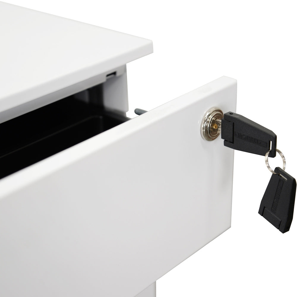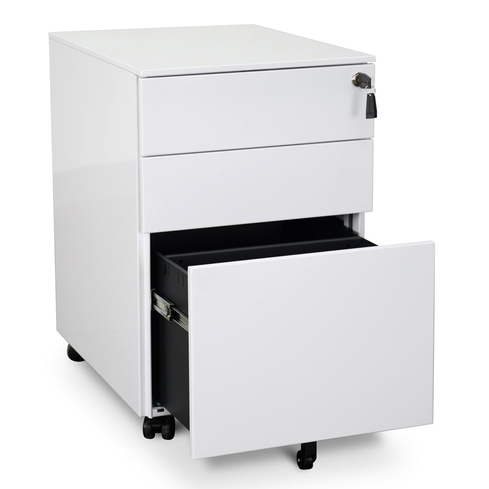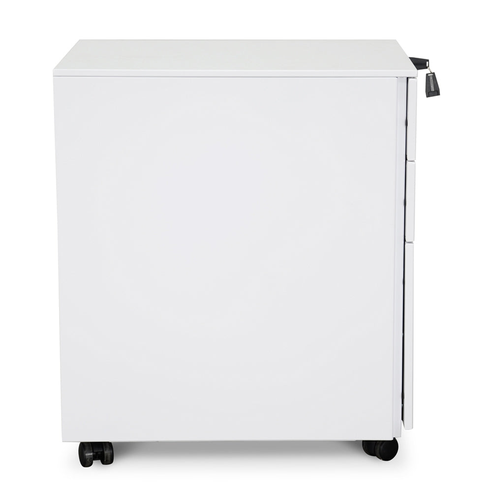 Mobile Pedestal - White is the perfect office storage solution for the workplace or home office, keeping your productivity at a high.Metal body in a white powder coated finish Lockable drawers Five caster wheels 2 x drawers and 1 x filing cabinet Pen tray included Also available in black and walnut Fully assembled Commercial grade Note: 5- years manufacturer's warranty against defects39cm (W) x 52cm (D) x 60cm (H)Box 1/1: 69cmx48cmx61cm, 20.5kg, 0.2020cbm
