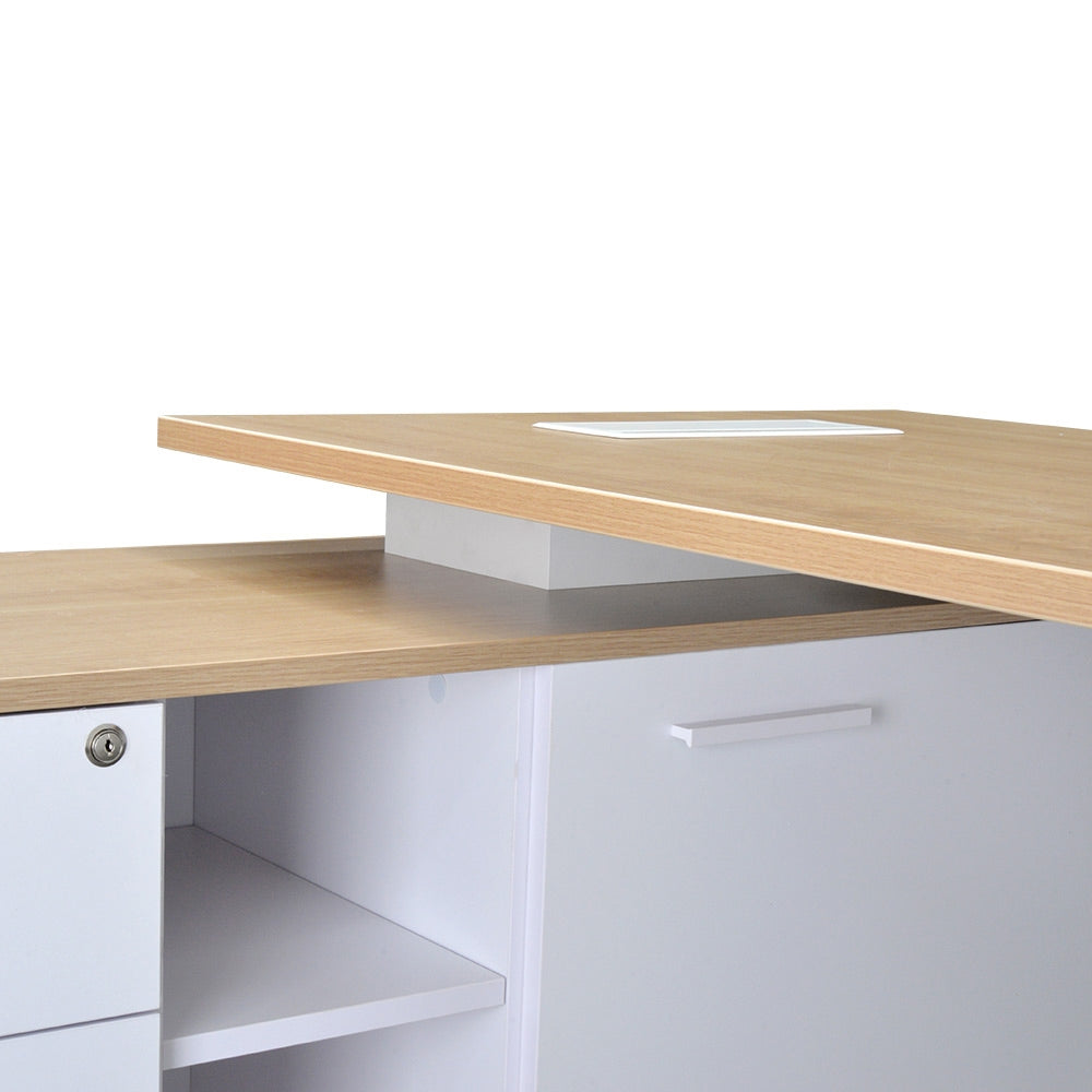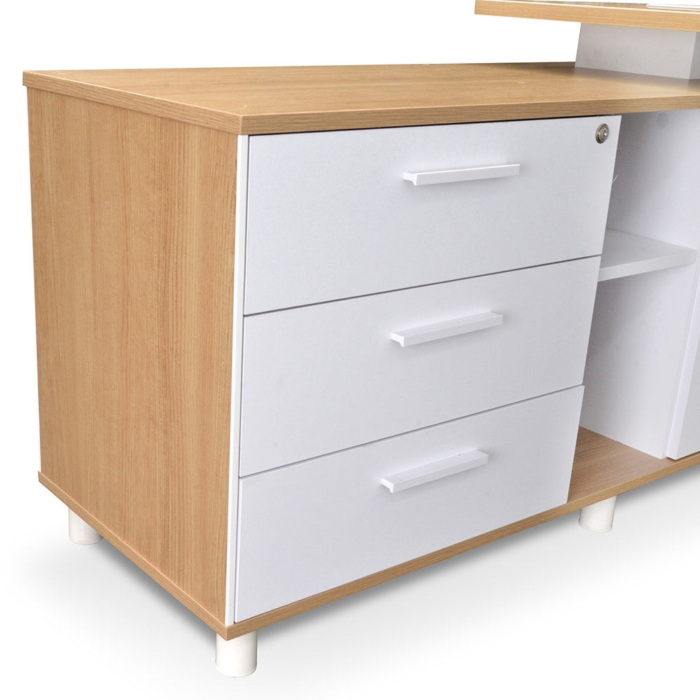 Always have a bit of nature with you with the 180cm Executive Office Desk with Left Return - Natural, featuring its classic contemporary blend of wood and white details.Natural timber veneer tabletop and return section body Steel base in a white finish Removable modesty panel 3 x lockable drawers, 1 x cupboard and a two-tiered shelf Available in left or right return Flat packed Note: 5- years manufacturer's warranty against defects Commercial grade Two-person assembly with furniture experience and an electrical drill requiredDesk: 180cm (W) x 80cm (D) x 75cm (H) Cabinet: 146cm (W) x 45cm (D) x 65cm (H) Top open compartments : 56.1cm (W) x 40.5cm (D) x 20cm (H) Bottom open compartment : 56.1cm (W) x 40.5cm (D) x 36.3cm (H) 3 Drawers: 54.5cm (W) x 40.5cm (D) x 18.5cm (H) Cupboard: 56.1cm (W) 40.5cm (D) x56.3cm (H)Box 1/5: 10cmx69cmx29.5cm, 3.2kg, 0.0204cbm Box 2/5: 6cmx188cmx88cm, 15.2kg, 0.0993cbm Box 3/5: 5cmx154cmx7.5cm, 1.1kg, 0.0058cbm Box 4/5: 61cmx150.5cmx53cm, 57.2kg, 0.4866cbm Box 5/5: 9cmx83cmx76cm, 6.2kg, 0.0568cbm