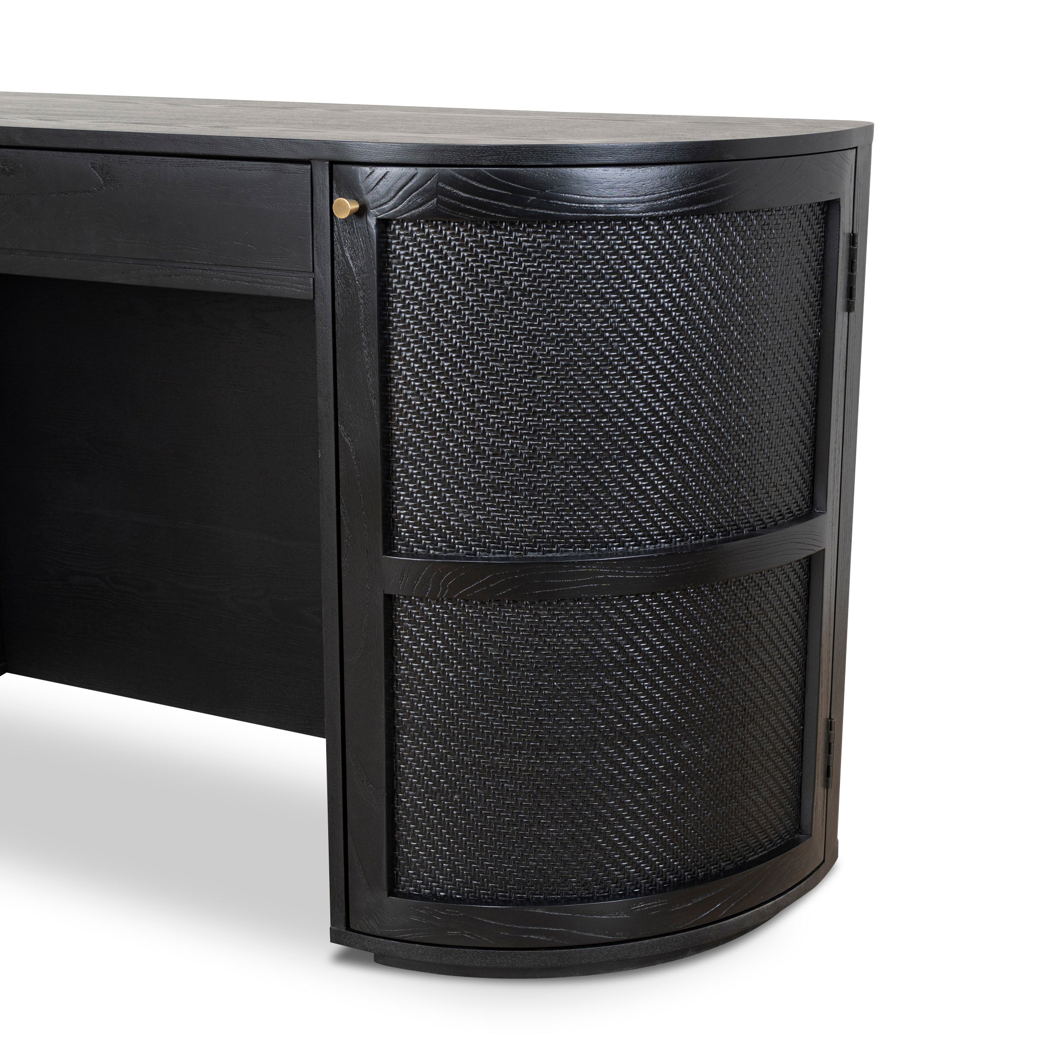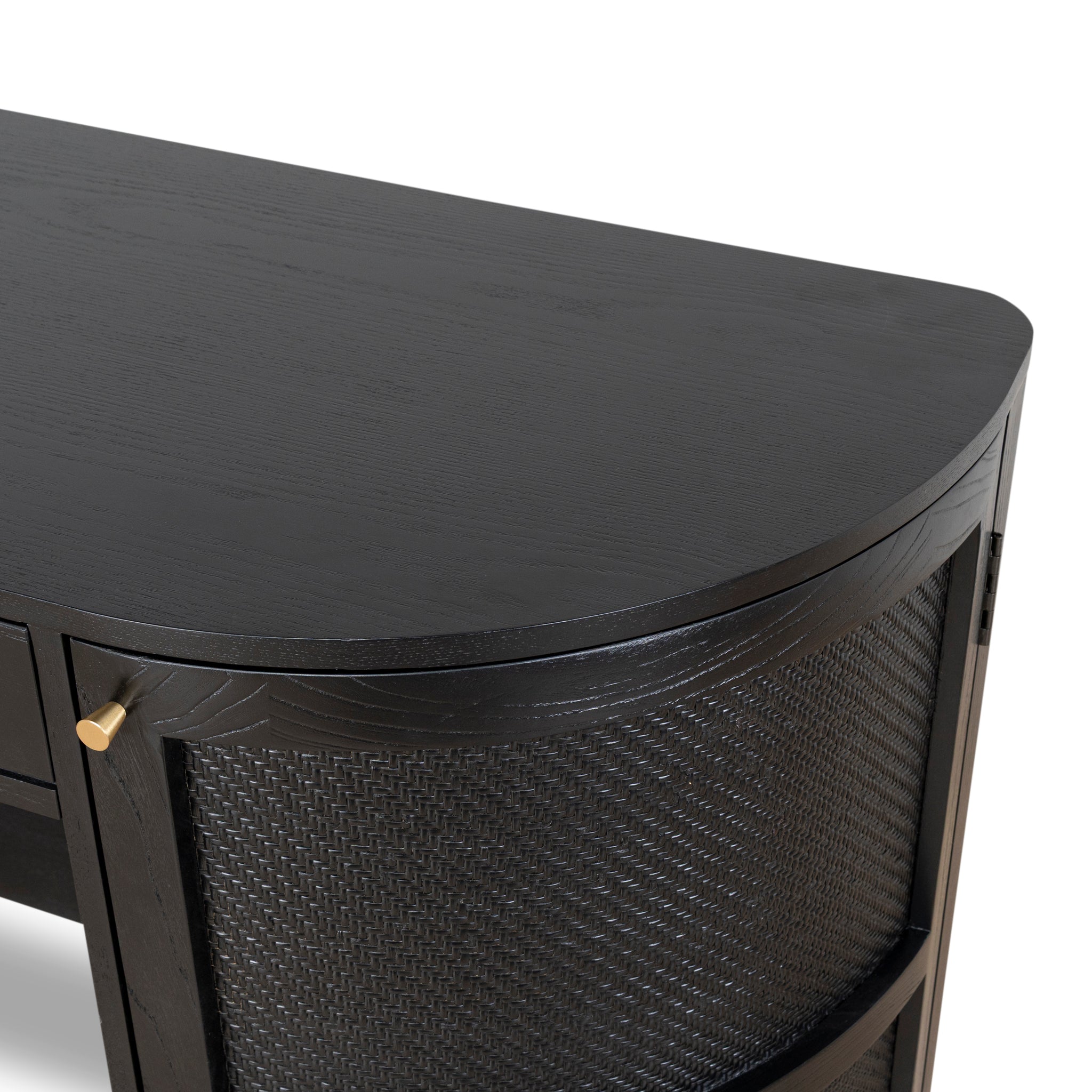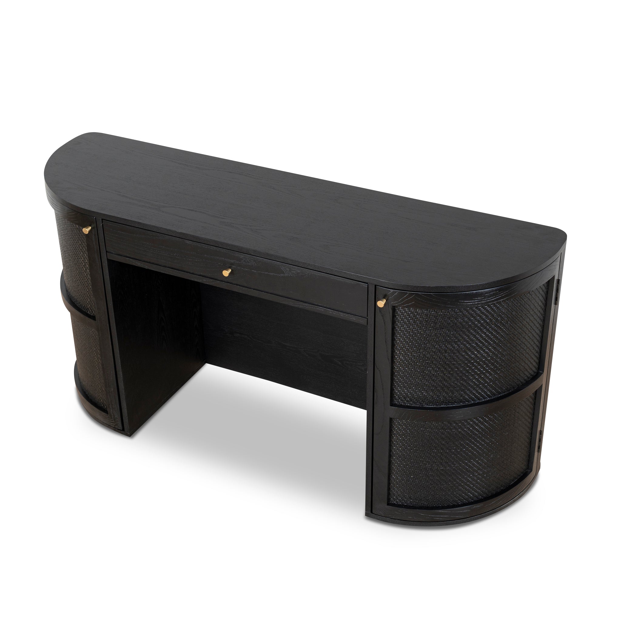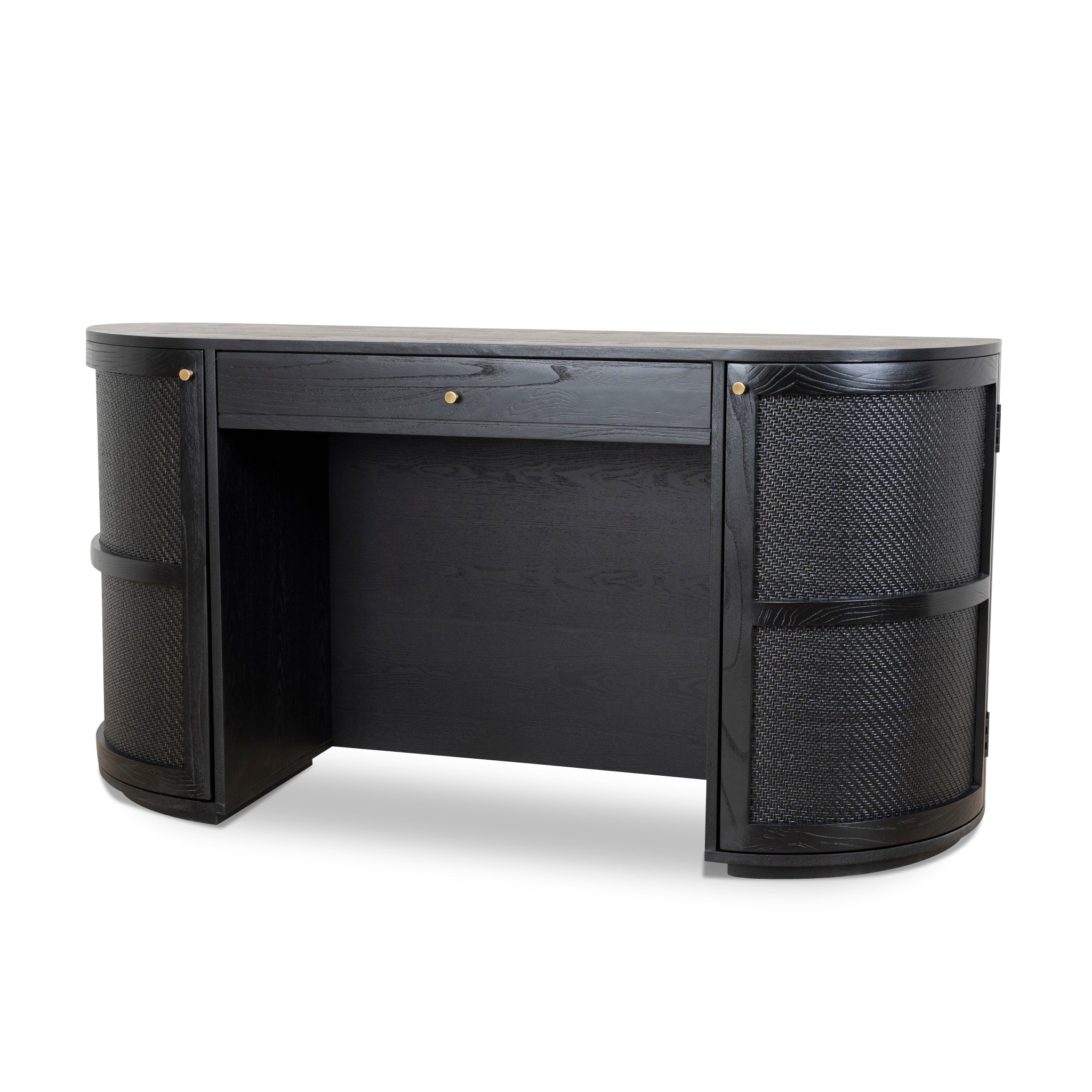 Redefine your living or dining area with the 1.55m Rattan Home Office Desk - Full Black, where elegant organization meets modern design sensibility.Solid elm wood with plywood in natural veneer finish Natural rattan detailing on cabinet doors Distinctive rounded design Bold full black finish Dual-door cabinets with internal shelving Smooth-glide central drawer Discreet brass knobs Weight Capacity: 150 kg Product comes fully assembled155cm (W) x 45cm (D) x 80cm (H) Internal Drawer: 76cm (W) x 33.5cm (D) x 9.5cm (H) Each shelf: 40.5cm (W) x 40.5cm (D) x 30.25cm (H) Distance between Legs: 79cmBox 1/1: 161cmx51cmx85cm, 58kg, 0.6979cbm