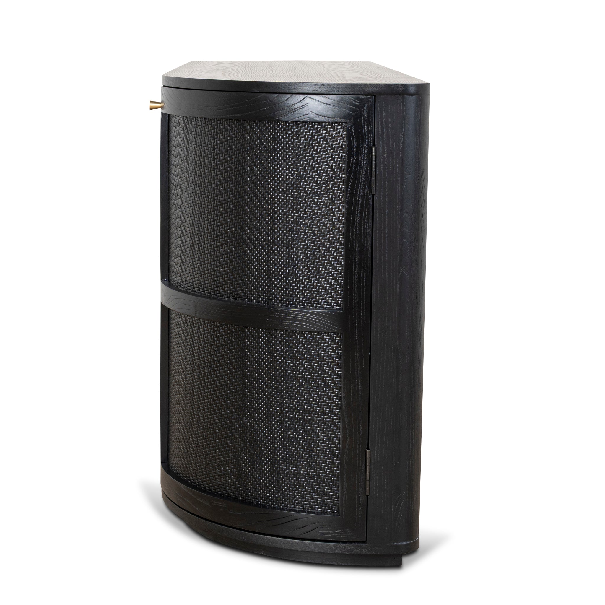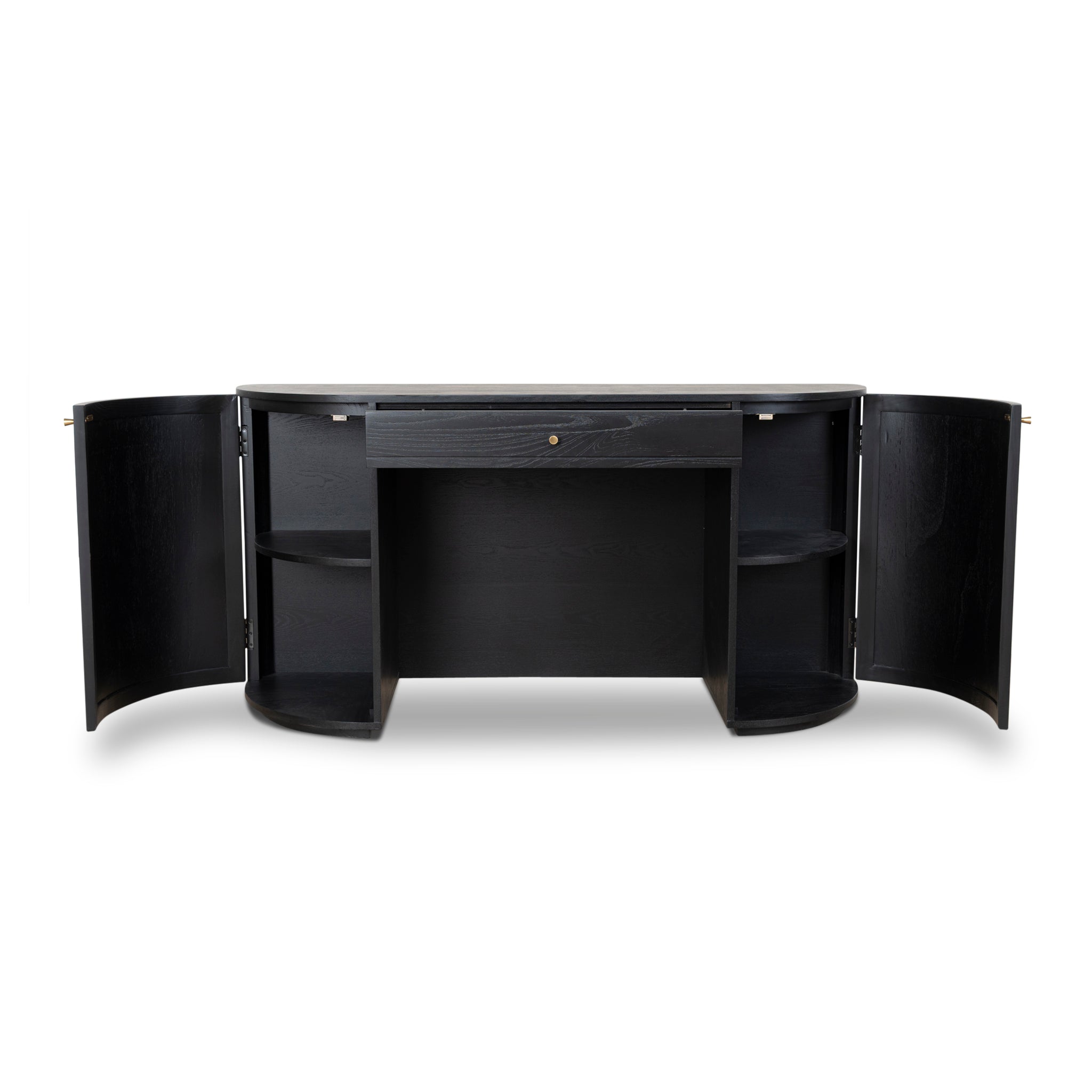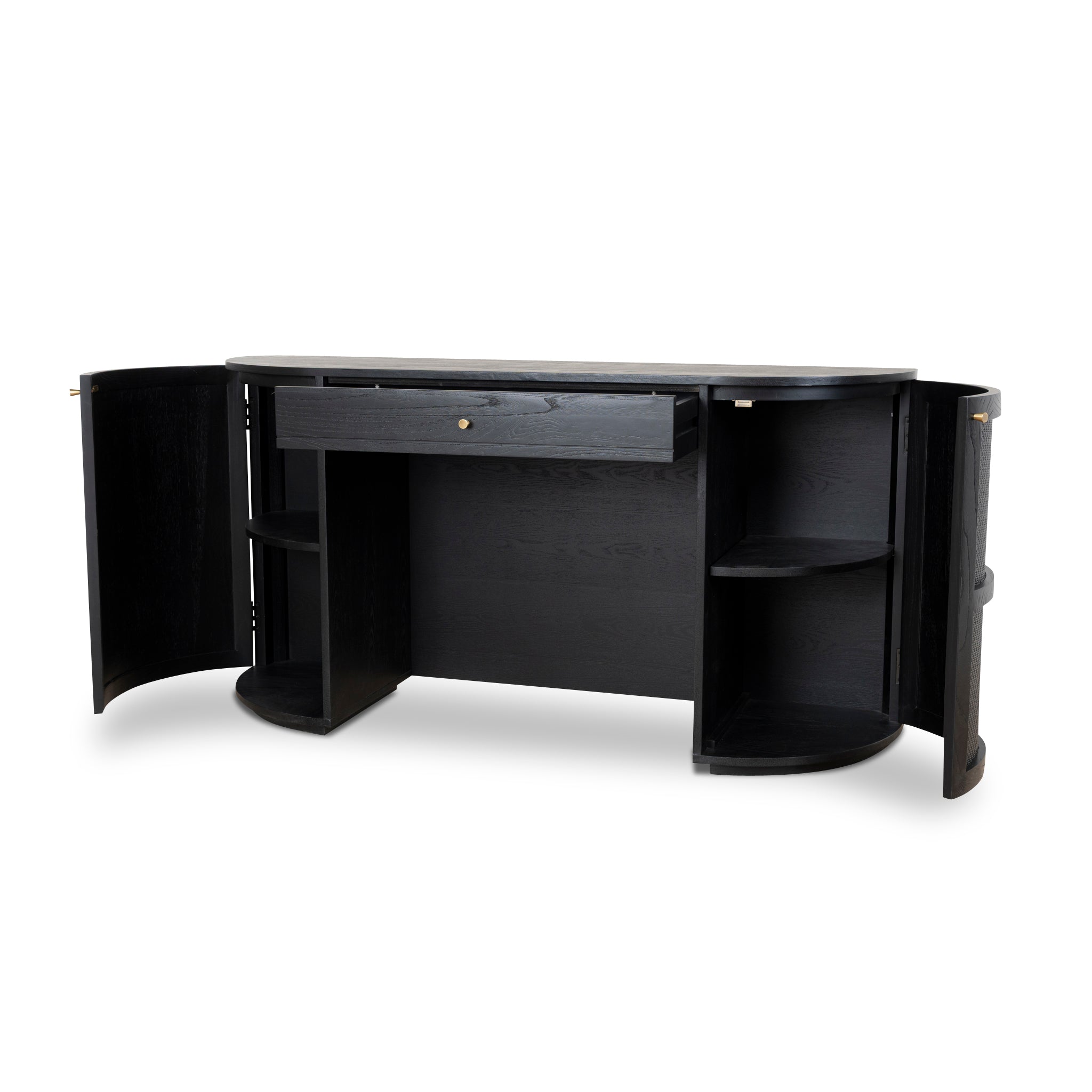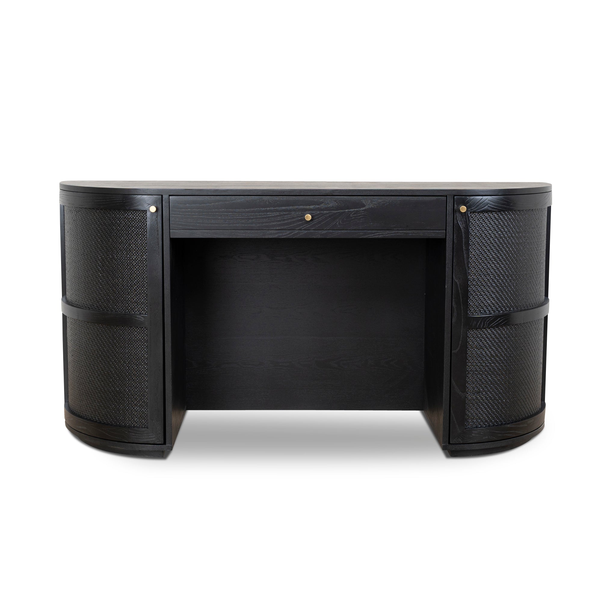 Redefine your living or dining area with the 1.55m Rattan Home Office Desk - Full Black, where elegant organization meets modern design sensibility.Solid elm wood with plywood in natural veneer finish Natural rattan detailing on cabinet doors Distinctive rounded design Bold full black finish Dual-door cabinets with internal shelving Smooth-glide central drawer Discreet brass knobs Weight Capacity: 150 kg Product comes fully assembled155cm (W) x 45cm (D) x 80cm (H) Internal Drawer: 76cm (W) x 33.5cm (D) x 9.5cm (H) Each shelf: 40.5cm (W) x 40.5cm (D) x 30.25cm (H) Distance between Legs: 79cmBox 1/1: 161cmx51cmx85cm, 58kg, 0.6979cbm