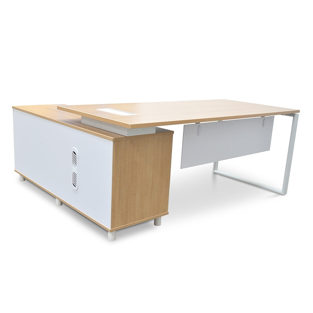 180cm Executive Office Desk Right Return With Upgraded Legs - Natural - White blends simple design with office functionality to give your space the professional workstation.Steel base in a white finish Natural timber veneer tabletop and body with white accent Removable modesty panel Return section has 3 x drawers, 1 x cupboard and a two-tiered shelf Lockable drawers Available in left or right return Note: 5- years manufacturer's warranty against defects Commercial grade Return section partially assembled Two-person assembly with furniture assembly experience and an electric drill is requiredDesk: 180cm (W) x 80cm (D) x 75cm (H) Cabinet: 146cm (W) x 45cm (D) x 65cm (H) 3 Drawers: 49cm (W) x 38cm (D) x 10cm (H) Top open compartments : 56.1cm (W) x 40.5cm (D) x 20cm (H) Bottom open compartment : 56.1cm (W) x 40.5cm (D) x 36.3cm (H) 3 Drawers: 54.5cm (W) x 40.5cm (D) x 18.5cm (H) Cupboard: 56.1cm (W) 40.5cm (D) x56.3cm (H)Box 1/5: 10cmx69cmx29.5cm, 3.2kg, 0.0204cbm Box 2/5: 6cmx188cmx88cm, 15.2kg, 0.0993cbm Box 3/5: 5cmx154cmx7.5cm, 1.1kg, 0.0058cbm Box 4/5: 61cmx150.5cmx53cm, 57.2kg, 0.4866cbm Box 5/5: 9cmx83cmx76cm, 6.2kg, 0.0568cbm