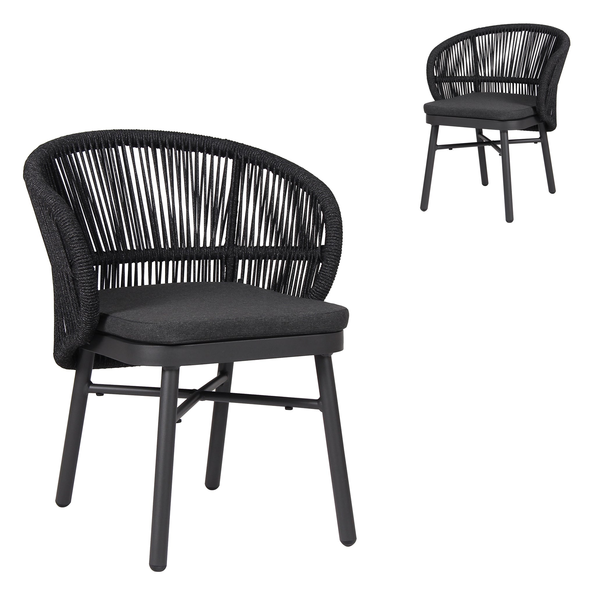 Upgrade your al fresco dining experience with these stunning Set of 2 - Outdoor Dining Chairs in Charcoal.Charcoal polyester fabric upholstery Aluminum frame and legs 6mm rope detailing with 4cm thick cushion Rope with spandex polyester core Outer layer of rope; UV-resistant plastic and high-strength yarn Removable cushion with foam filling Gently rounded backrest Soft-to-medium seat firmness Cross-brace support Ergonomic design Weight Capacity: 200 kg Product comes fully assembled60cm (W) x 65cm (D) x 80cm (H) Seat: 42.5cm (W) x 46cm (D) x 45cm (H) Backrest Height: 35cm Distance between Legs (Front): 43cm Distance between Legs (Side): 52cm Arm Height: 68cm Leg Height: 37cmPackaging Note: 2 x Chairs per box Box 1/1: 73cmx63cmx92cm, 14.5kg, 0.4231cbm
