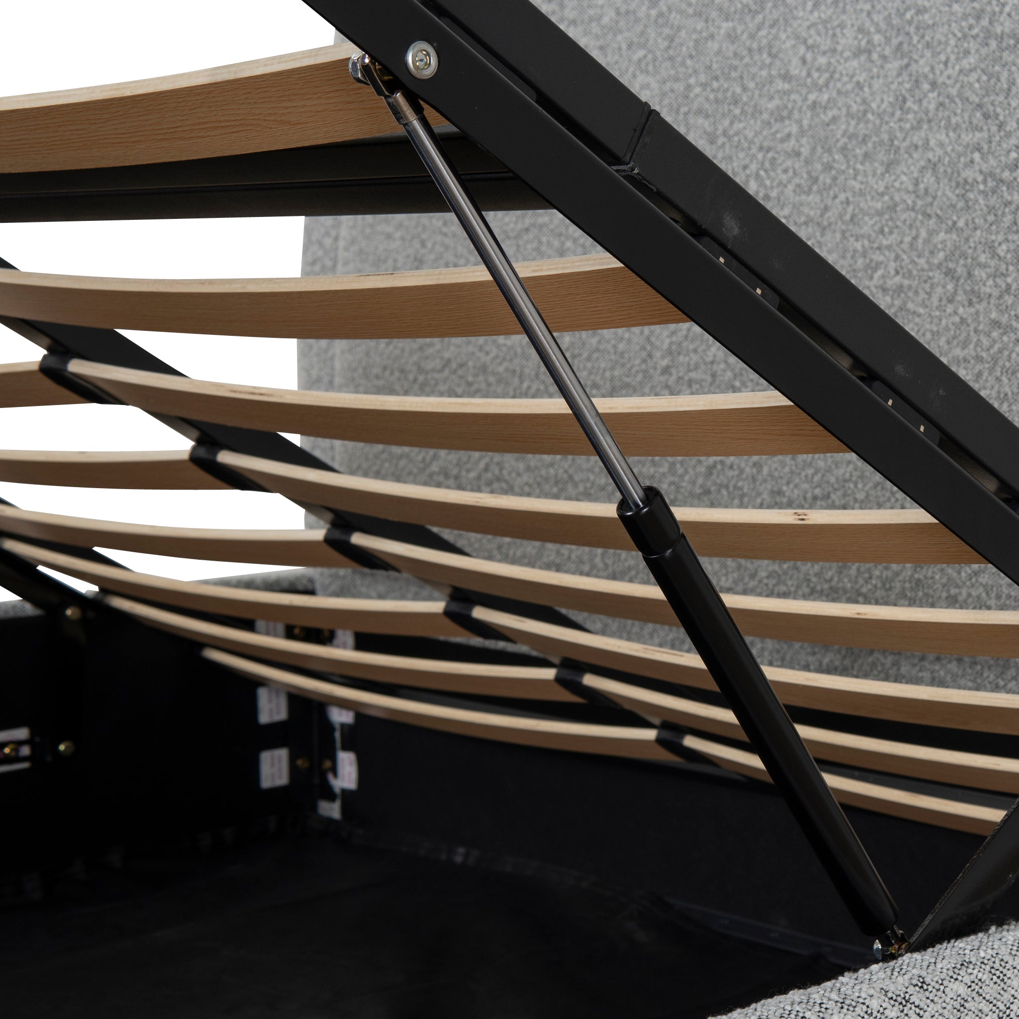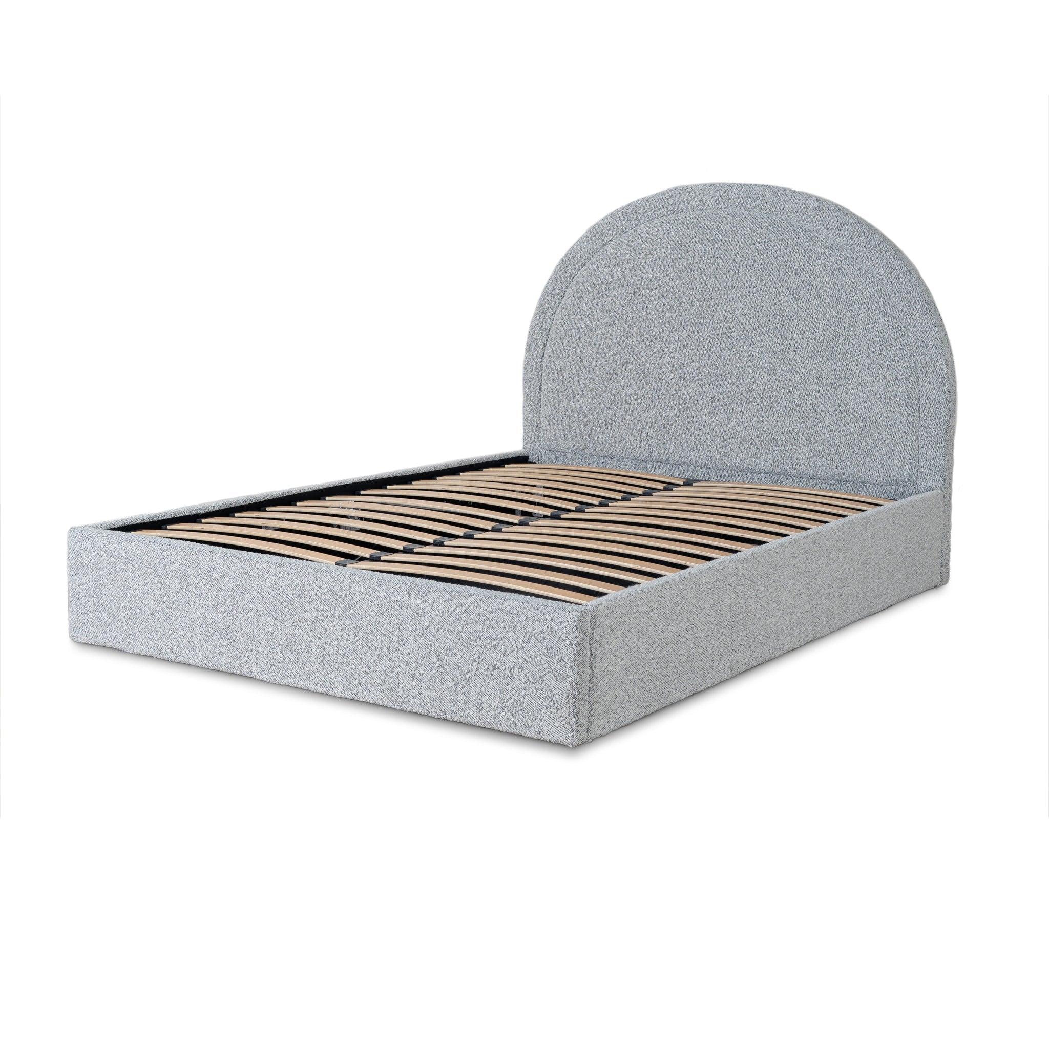 The Queen Bed Frame in Pepper Boucle offers a luxurious retreat after your busiest days.Cloudy pepper boucle polyester/acrylic upholsteryMDF constructionFoam filledBlack metal frame with timber slatsGas lift mechanism supports up to 50kgsAccommodates a Queen mattressWeight capacity: 350kgProduct comes flat packed and requires two-person assembly and a screwdriver Note: Please ensure your mattress is compatible with the provided slat construction of this bed frame.164cm (W) x 216cm (D) x 125cm (H) Bedhead: 164cm (W) x 10cm (D) x 134cm (H) Sideboard: 205cm (W) x 3cm (D) x 30cm (H)Box 1/2: 166cmx7cmx140cm, 27kg, 0.1627cbm Box 2/2: 210cmx18cmx32cm, 41kg, 0.1210cbm