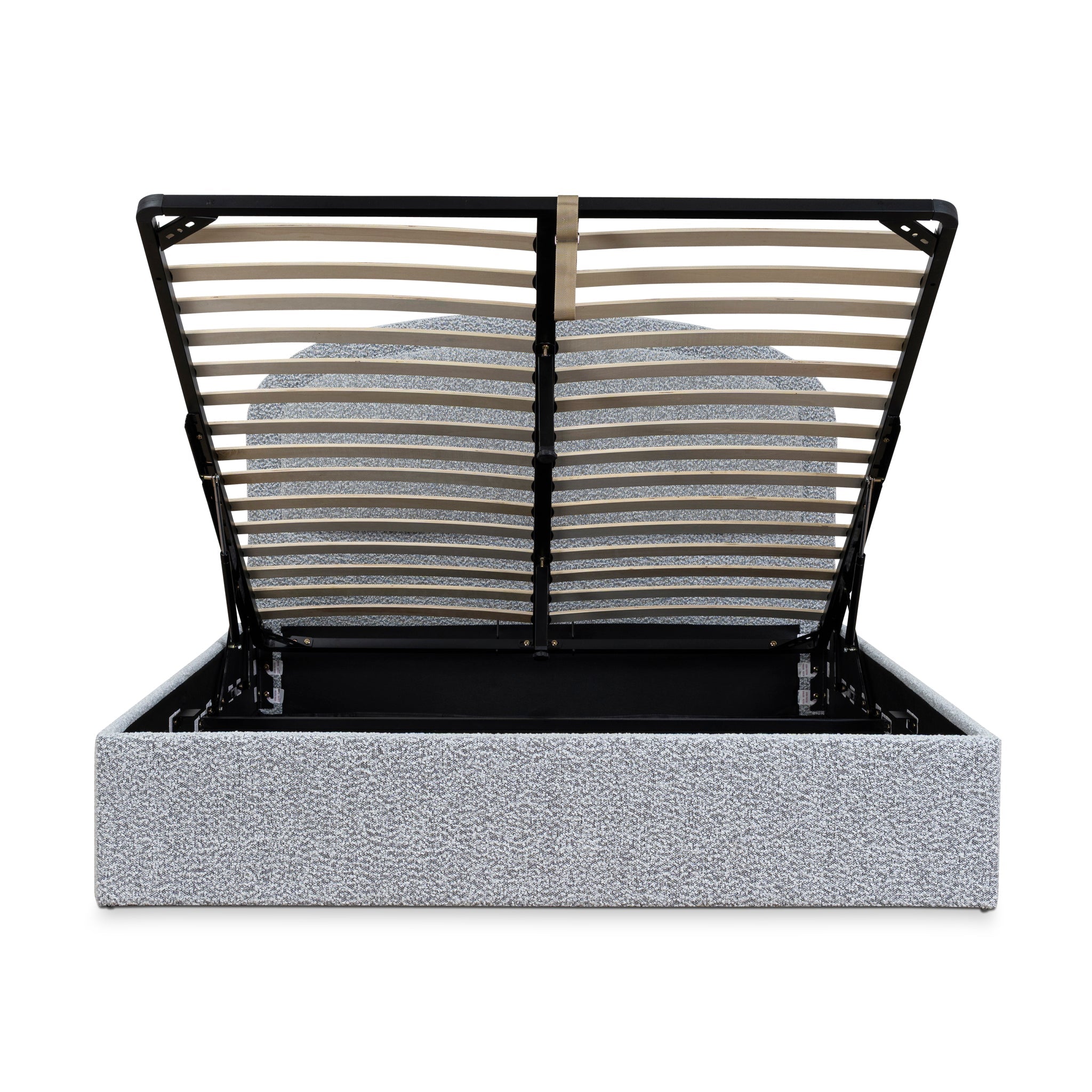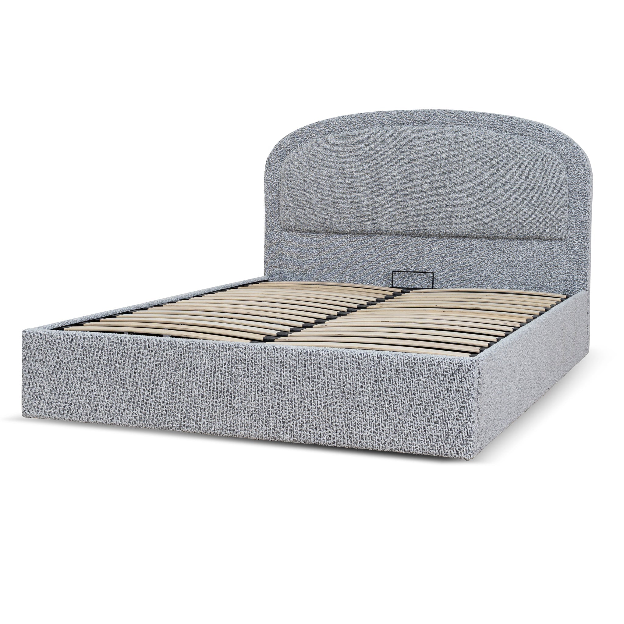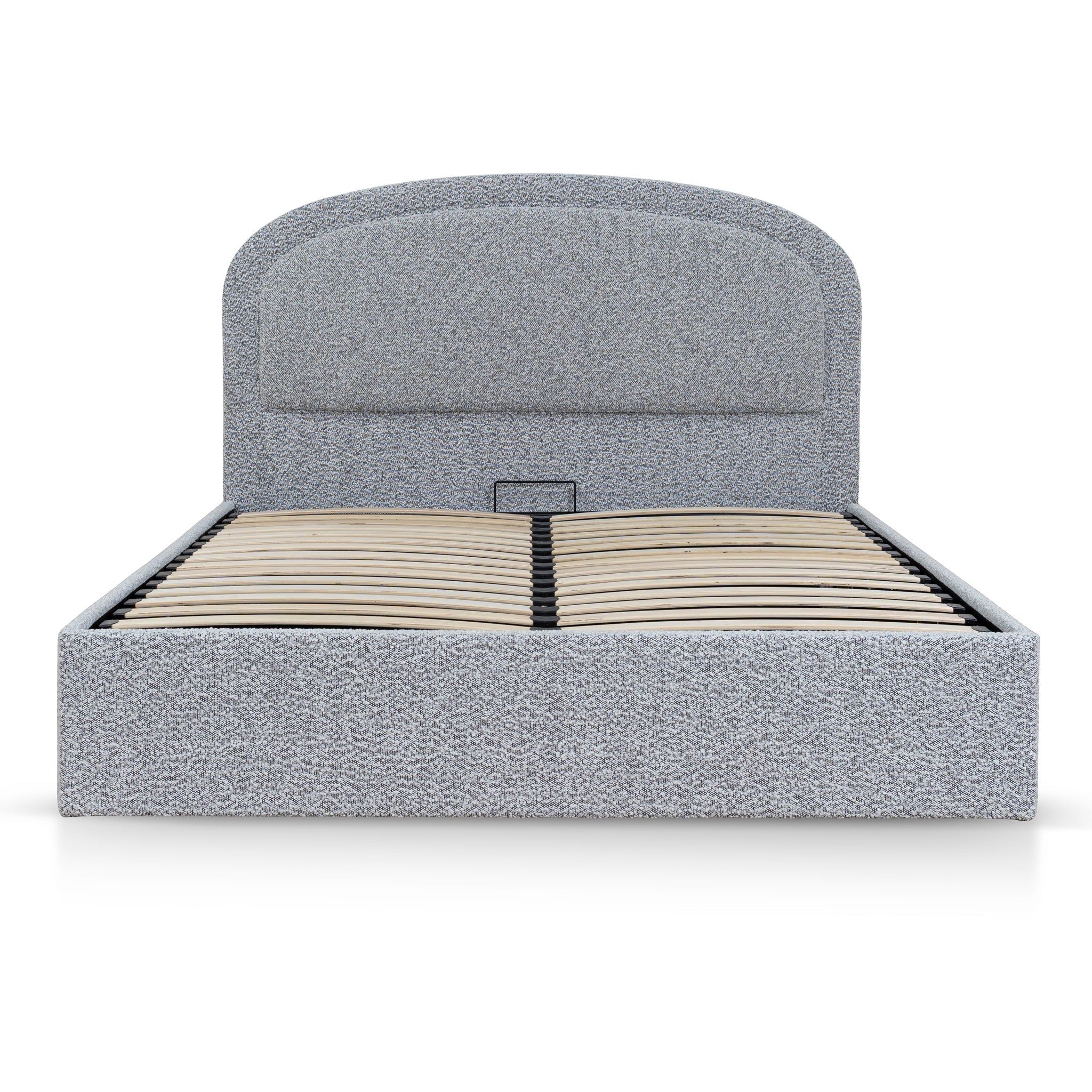 Redefine your sleep space with the Queen Bed Frame - Pepper Boucle with Storage, a harmonious fusion of style and practicality.Pepper Boucle polyester upholstery Engineered wood frame Foam filling Curved panel-stitched headboard Integrated gas-lift storage Fully padded frame Low-set profile Weight Capacity: 350 kg Minor Assembly Required Note: Bed mattress not included Please ensure your mattress is compatible with the provided slat construction of this bed frame.164cm (W) x 216cm (D) x 110cm (H) Bedhead: 164cm (W) x 11cm (D) x 110cm (H) Sideboard: 205cm (W) x 3cm (D) x 32cm (H)Box 1/2: 166cmx12mx126cm, 28kg, 0.2510cbm Box 2/2: 210cmx18cmx32cm, 41kg, 0.1210cbm