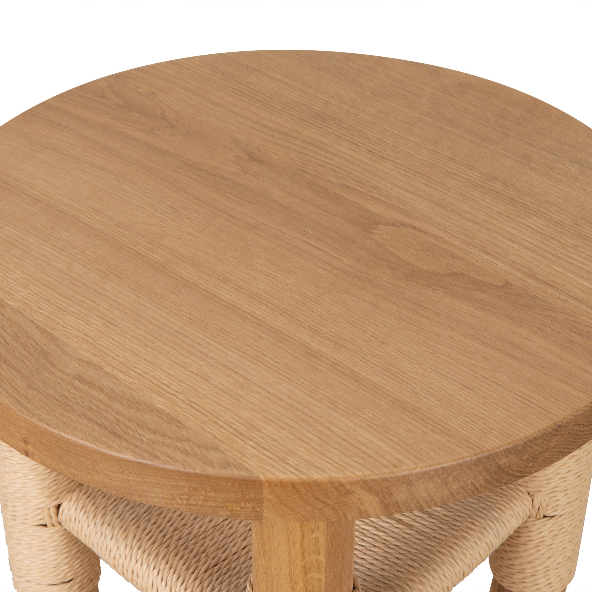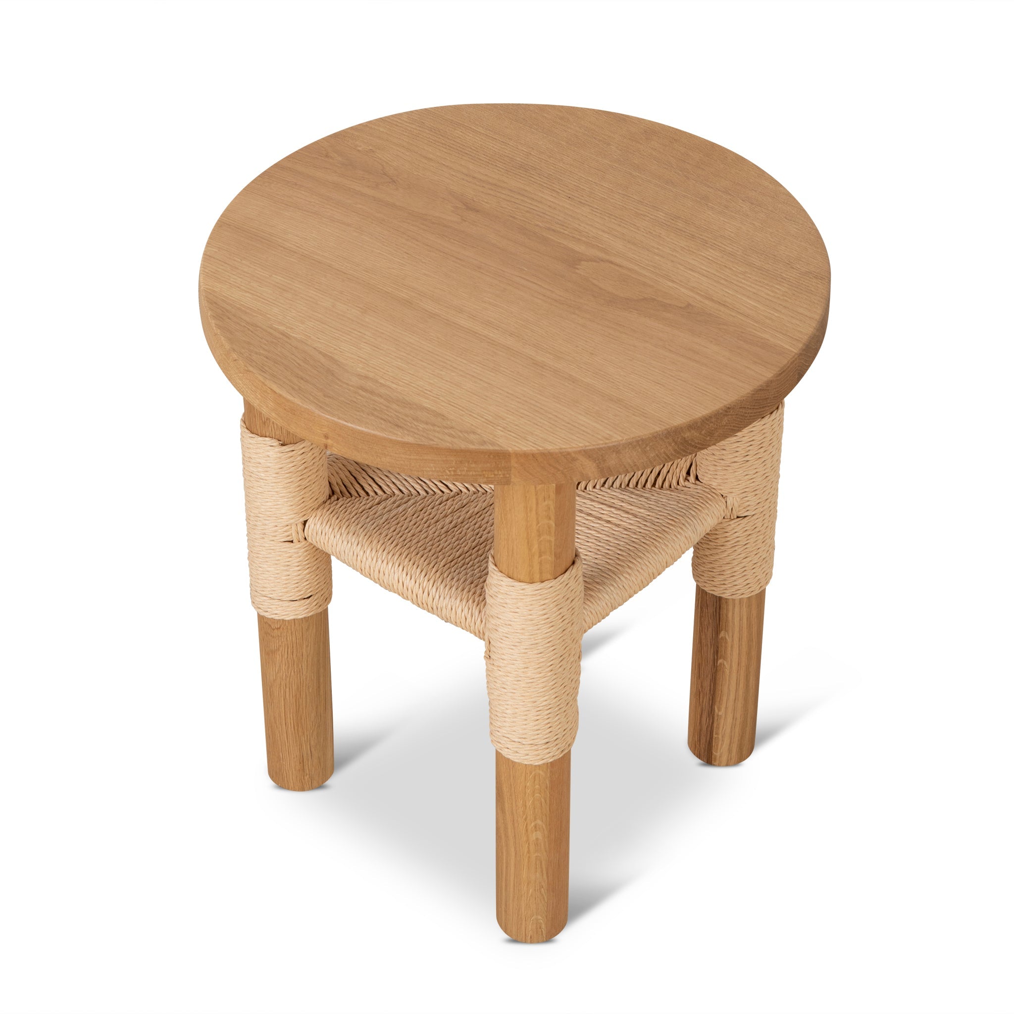 Add an elegant touch to your living space with the 42cm Round Side Table - Natural.American white oak frame Natural finish Solid timber with woven cord seat Timber legs Handwoven rope accents Minimalist circular top Weight Capacity: 10 kg Product comes fully assembled42cm (D) x 45cm (H) Leg Height: 42.2cm Distance between Legs: 17.6cm Table Thickness: 2.8cm Leg Thickness: 5cmBox 1/1: 47cmx47cmx50cm, 7.75kg, 0.1105cbm