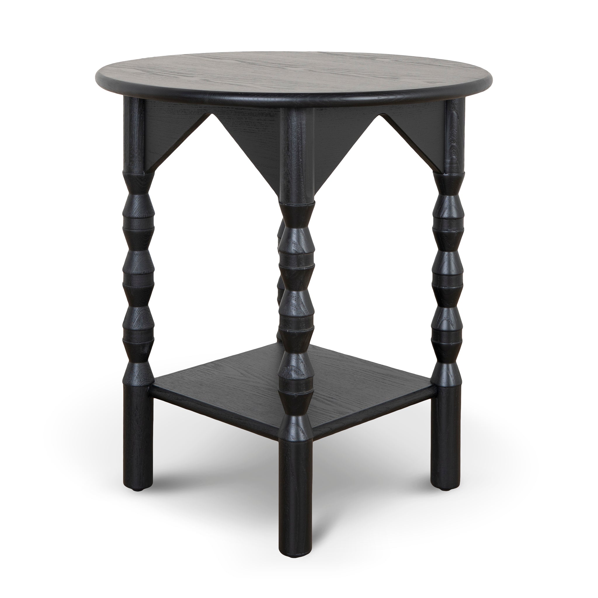Discover the elegant 52cm Side Table - Full Black a sophisticated addition to any modern living space.Solid ash wood frame and legs Plywood tabletop with natural veneer Black finish Lower shelf for extra storage Carved legs with unique patterns Weight Capacity: 50 kg Product comes fully assembled52cm (W) x 52cm (D) x 56cm (H) Table Hanging: 9.5cm Leg Height: 54.2cm Shelf to Base Height: 12.2cm Distance between Legs: 25cmBox 1/1: 58cmx58cmx61cm, 16kg, 0.2052cbm