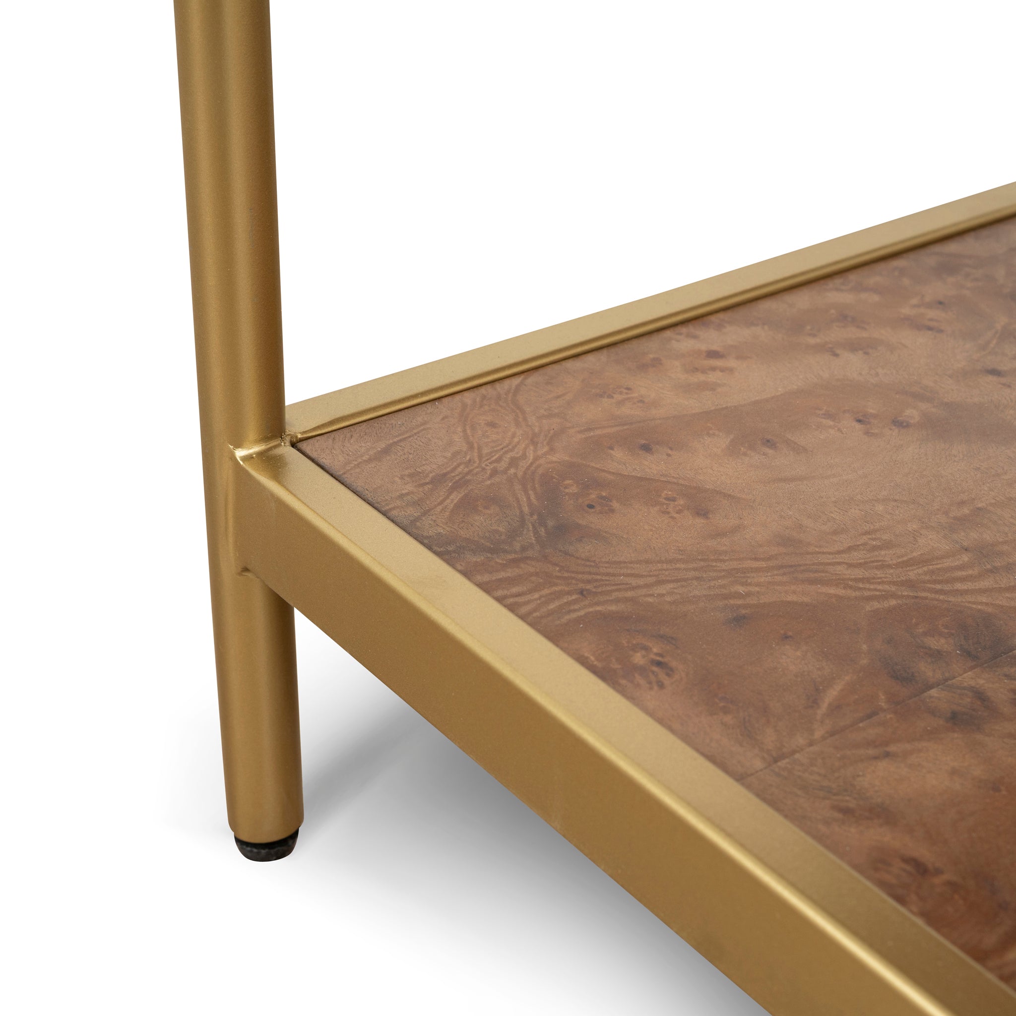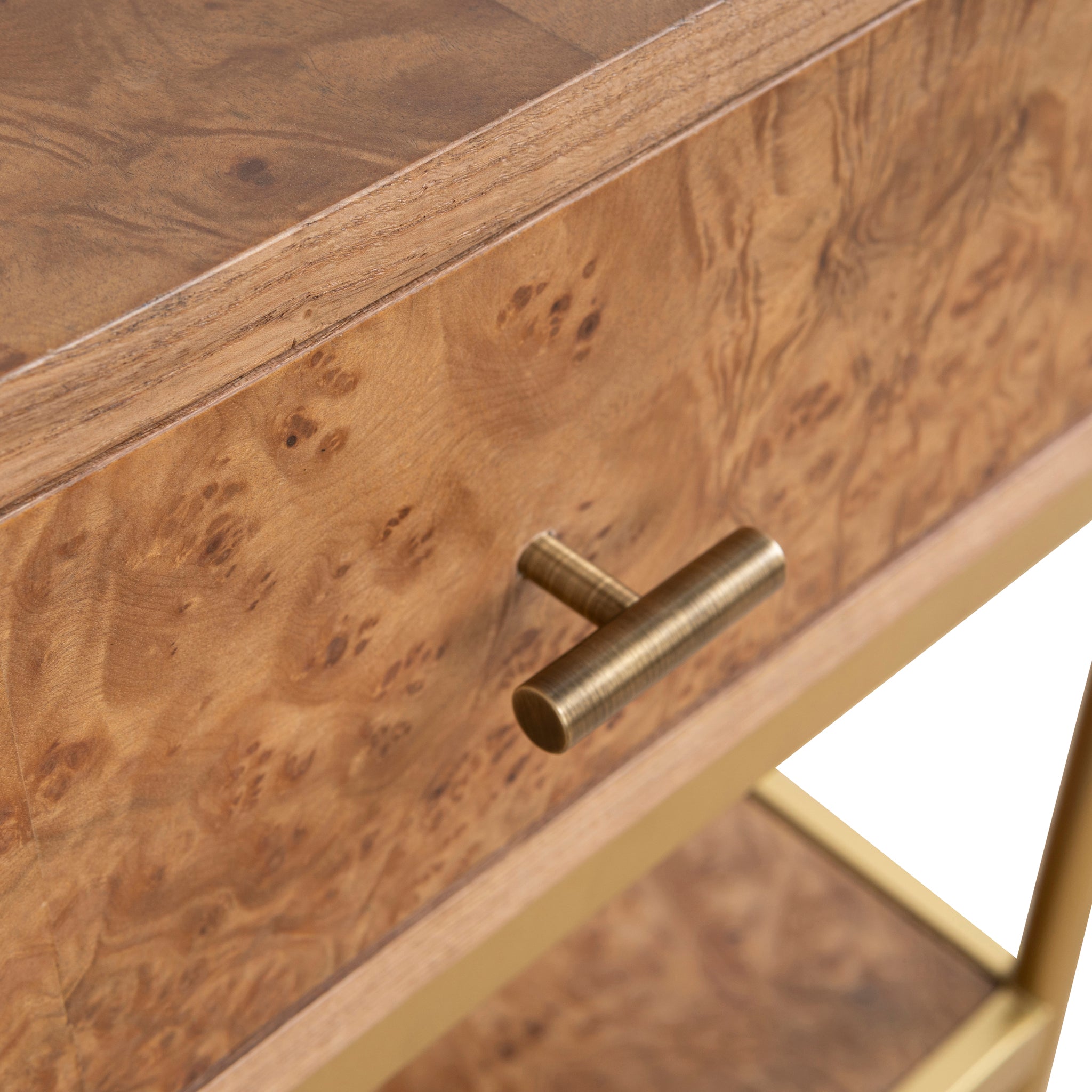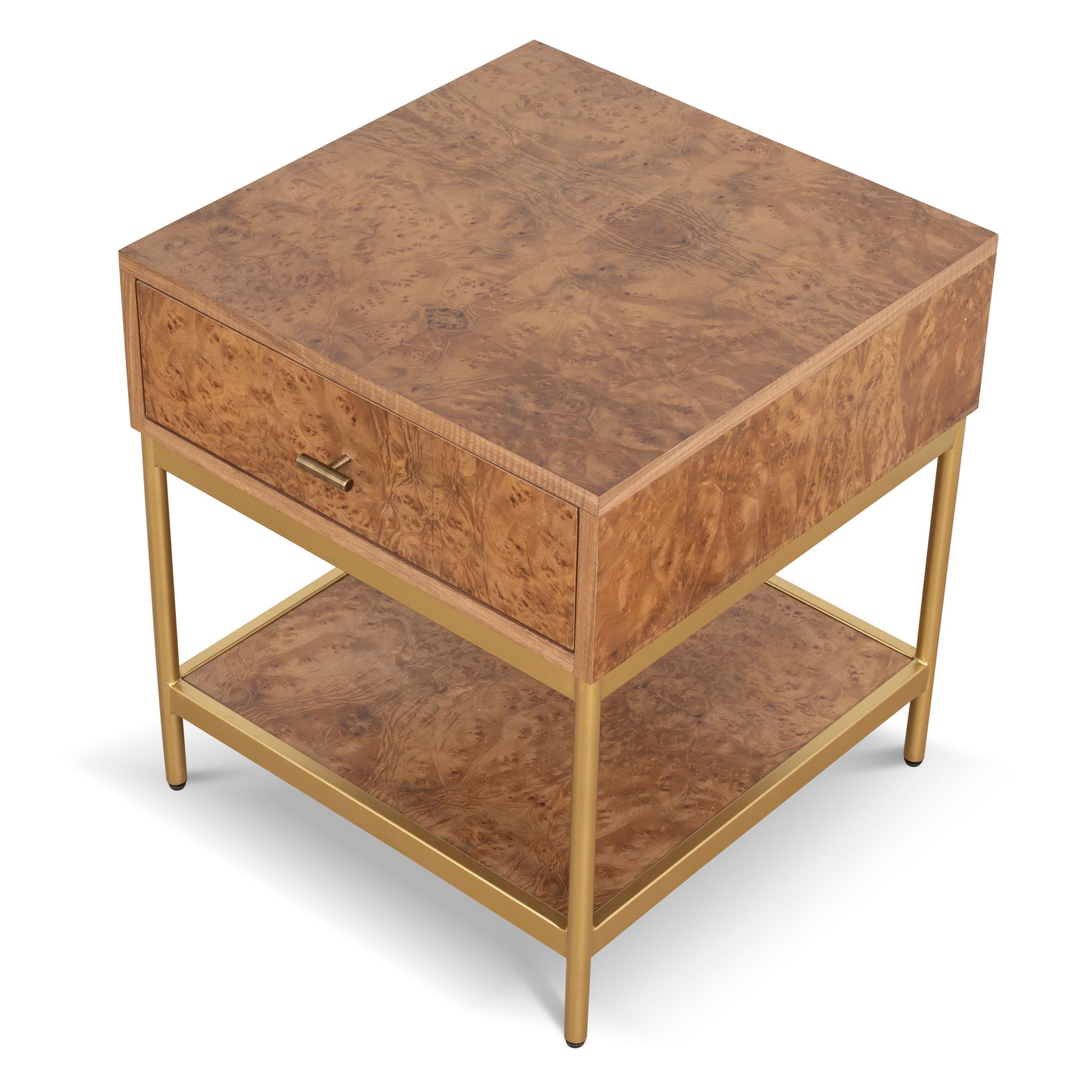 The 50cm Square Bedside Table - Natural brings understated elegance and modern structure to your bedroom.Plywood construction with natural burl veneer Sturdy metal base with iron legs Organic wood grain patterns Brushed gold legs Smooth-glide drawer with brass handle Open bottom shelf Elevated airy silhouette Weight Capacity: 150 kg Product comes fully assembled50cm (W) x 50cm (D) x 55cm (H) Internal Drawer: 40cm (W) x 39cm (D) x 9.5cm (H) Leg Height: 38cm Distance between Legs: 45.7cmBox 1/1: 56cmx56cmx60cm, 32kg, 0.1882cbm