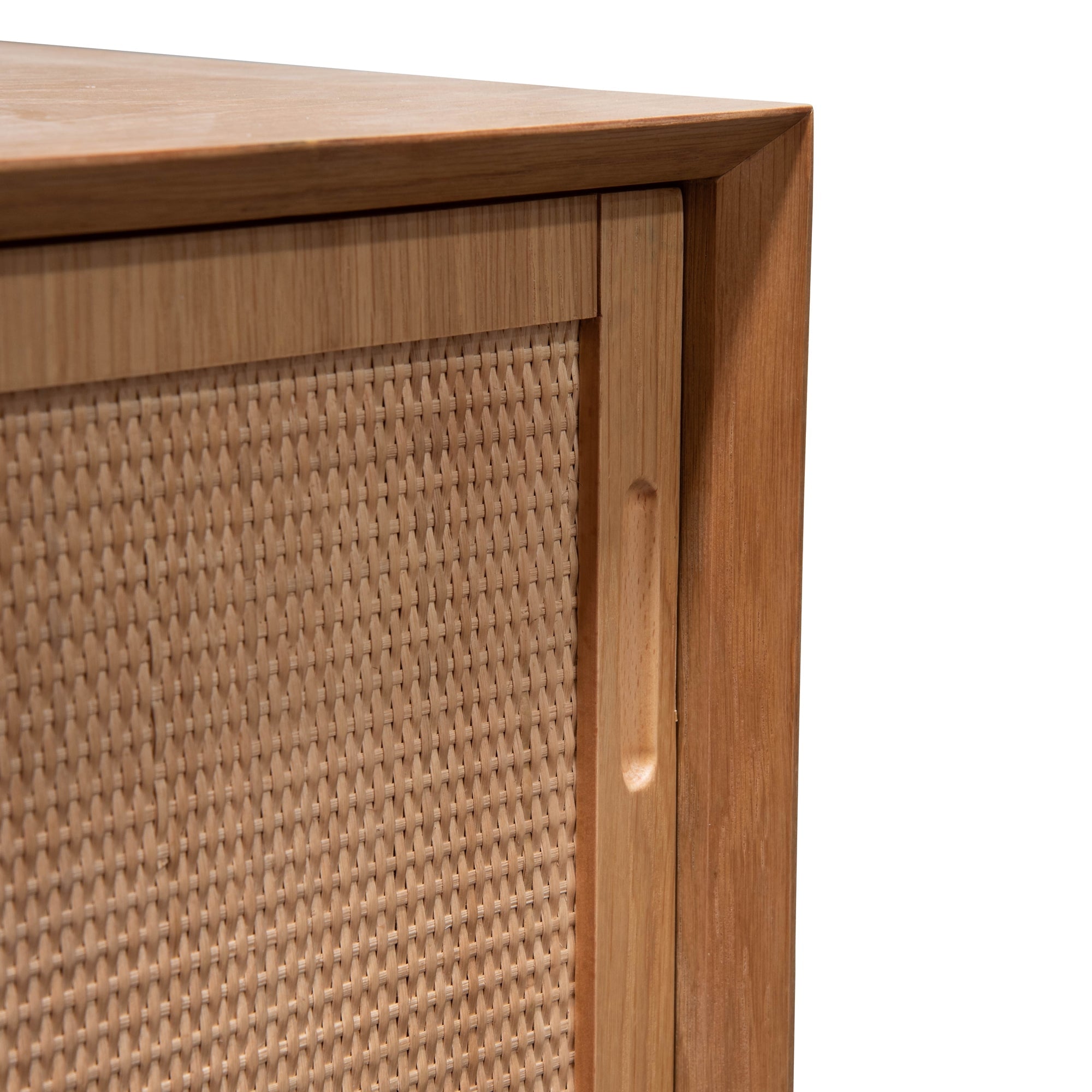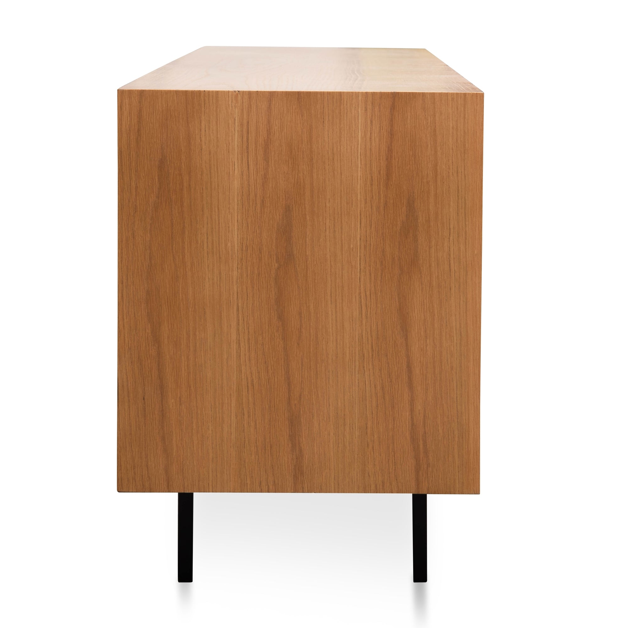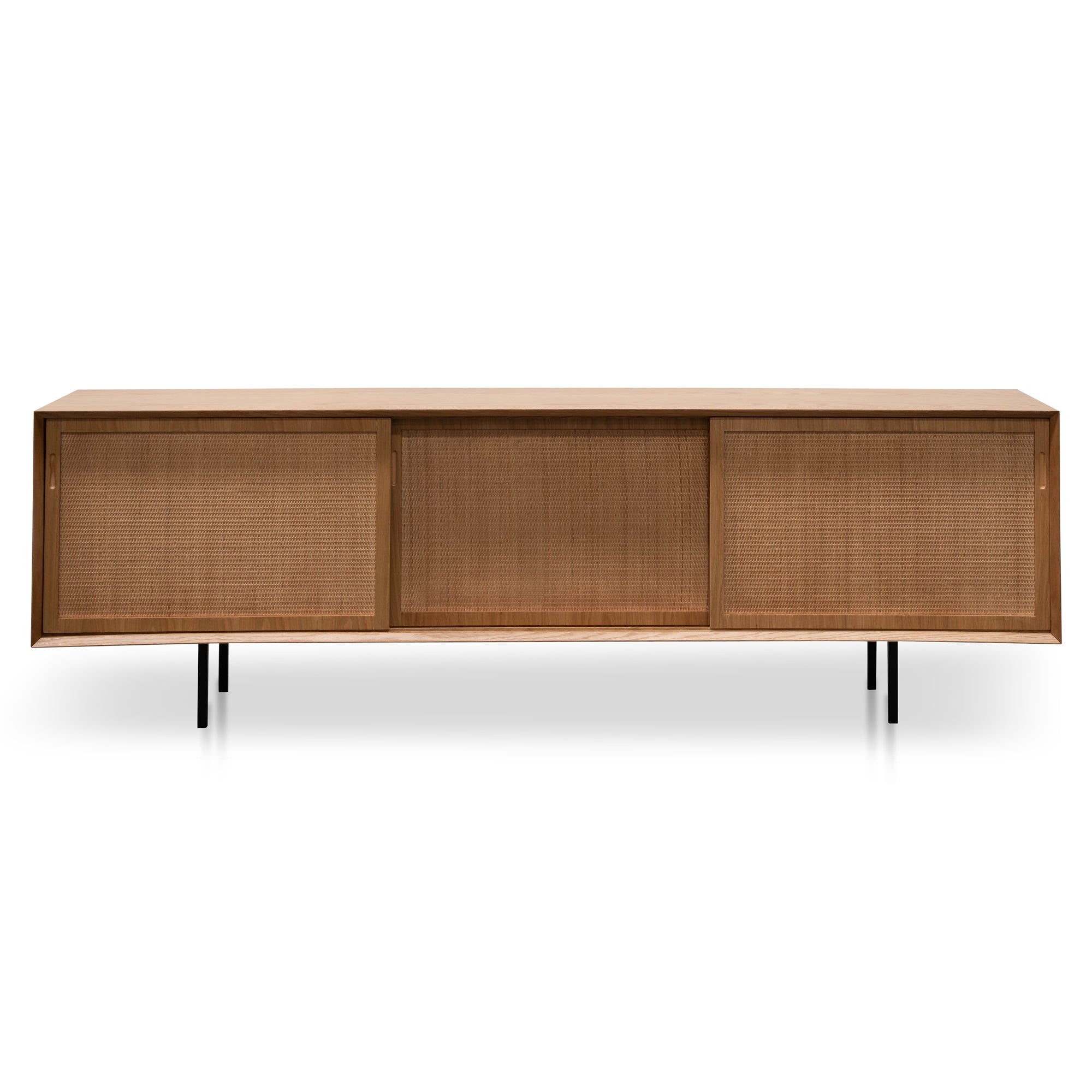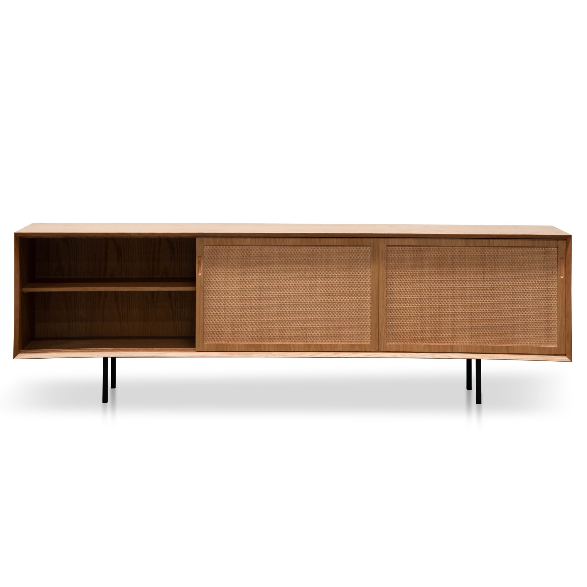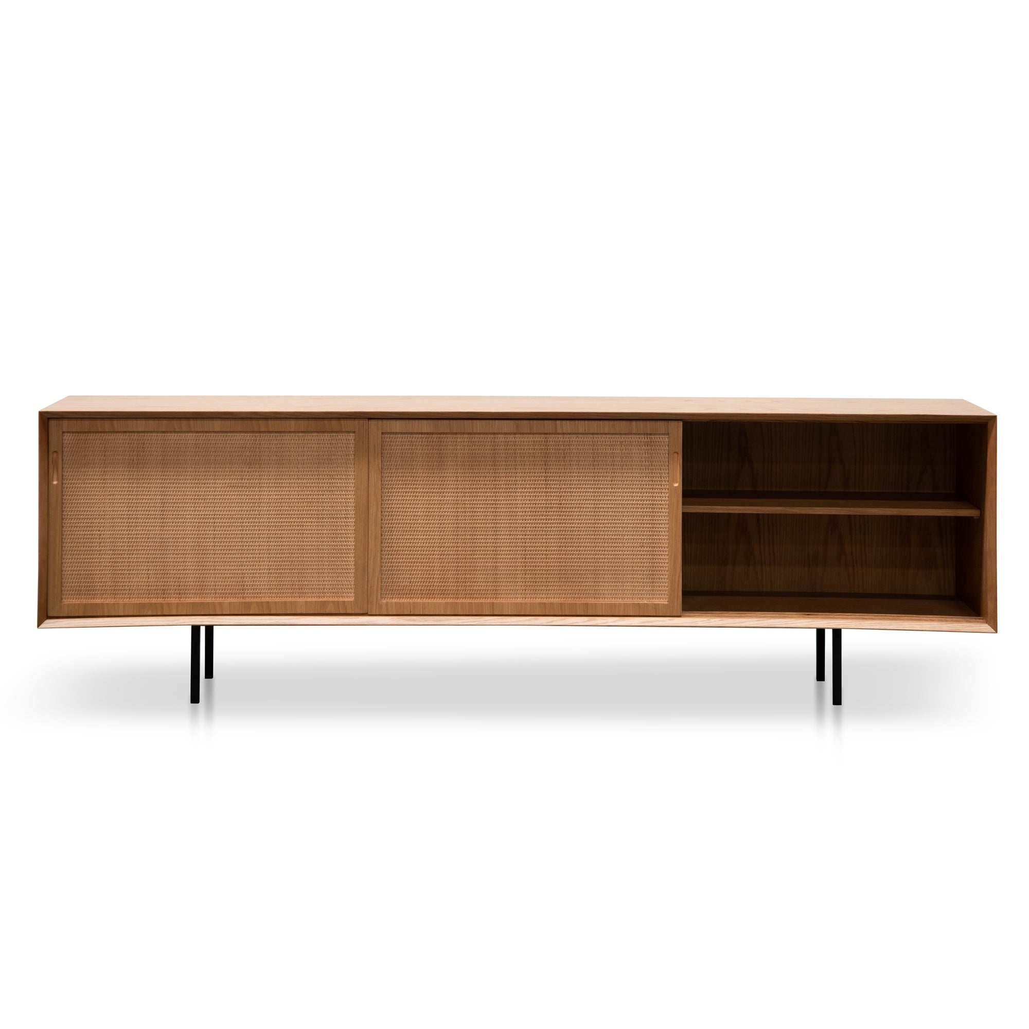 Ground your living space with the natural beauty of 2.2m TV Unit - Natural, a beautiful oak piece for your contemporary decor.Features 3x slide doors with two-tiered shelving for storage Rattan doors add subtle texture for visual interest Durable oak wood with a natural finish Strong steel legs in a black powder coat finish Note: Product requires two-person assembly and furniture assembly experience.220cm (W) x 45cm (D) x 69cm (H)Box 1/2: 225cmx49cmx58cm, 78kg, 0.6395cbm Box 2/2: 23cmx13.5cmx16.5cm, 2.5kg, 0.0051cbm