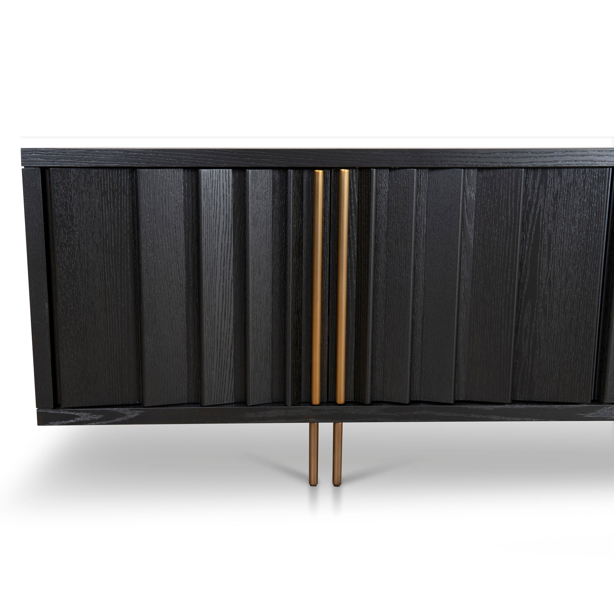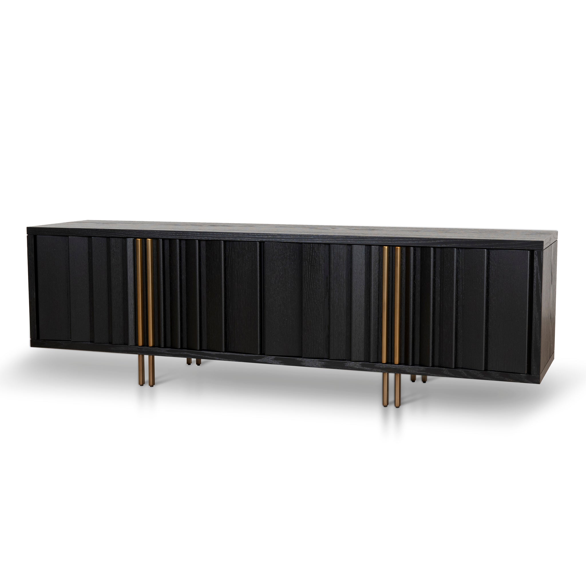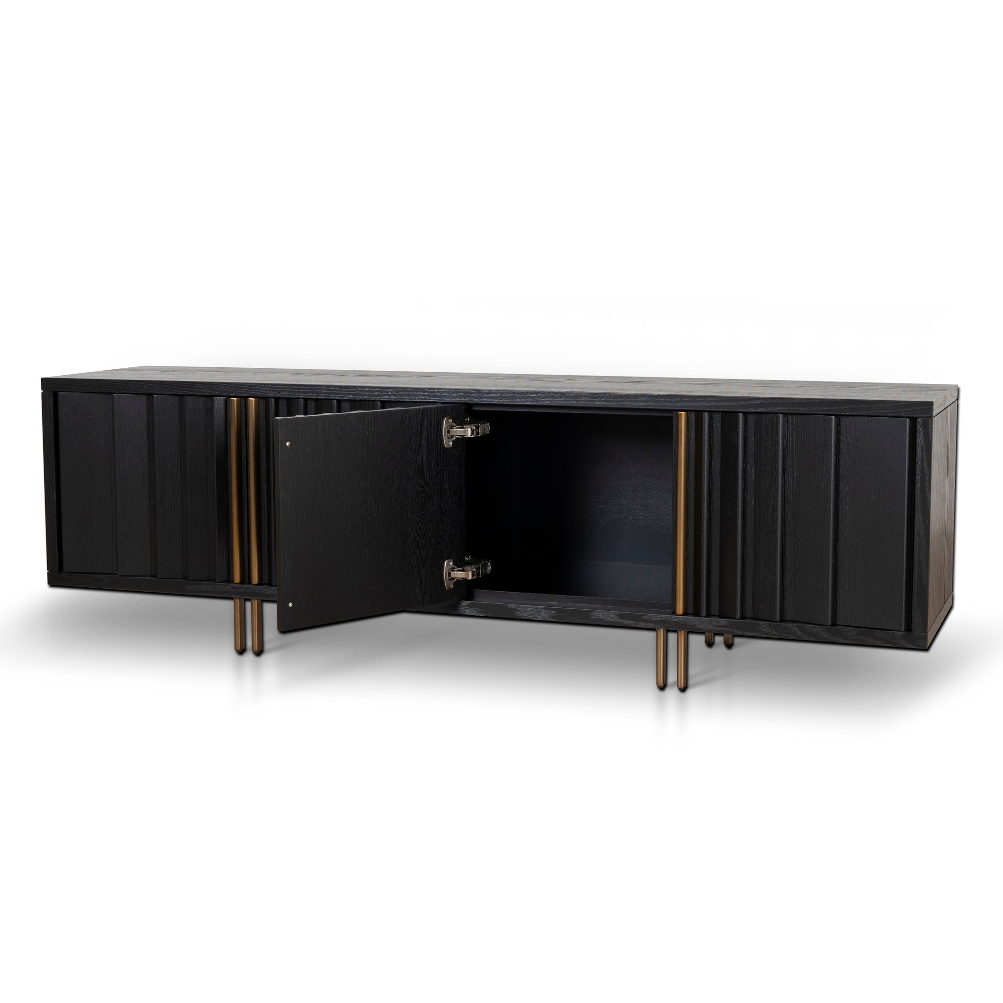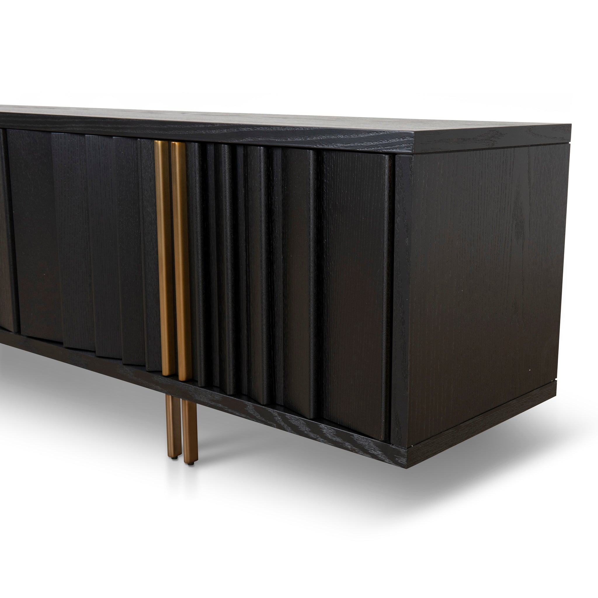 Whether you're watching your favorite movie or entertaining guests, the 2m TV Entertainment Unit is the ideal choice for those looking to elevate their living room decor.Engineered wood with oak veneer Textured Espresso Black finish Wood lining accentuates front doors Wood grain patterns Bronze metal door handle and legs Spacious top for versatile display Pull-to-open mechanism Ample storage compartments Product comes fully assembled200cm (W) x 45cm (D) x 60cm (H) Internal Shelf: 96cm (W) x 40.5cm (D) x 35.5cm (H) Distance between Legs: 90.5cm Leg Height: 12cmBox 1/1: 205cmx50cmx53cm, 58kg, 0.5433cbm