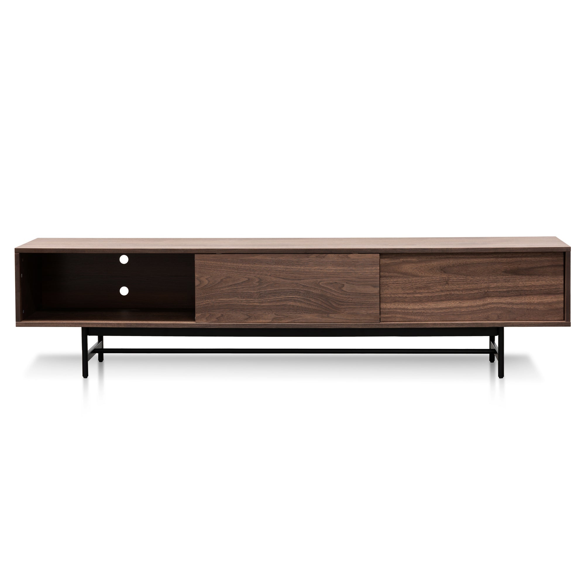 Revive and revamp your entertainment space with the laid-back appeal of the 2.1m Walnut Wooden Entertainment TV Unit - Black legs.18mm MDF construction with a walnut veneer finishBlack powder coated metal legsThree sliding doors6 x cable management holesProduct comes flat packed and requires two-person assembly and a screwdriver210cm (W) x 40cm (D) x 50.5cm (H) Compartments: 67.5cm (W) x 33.5cm (D) x 26cm (H) Height Without Legs: 30.5cm Leg Height: 20cmBox 1/1: 17cmx220cmx49cm, 49.85kg, 0.1833cbm