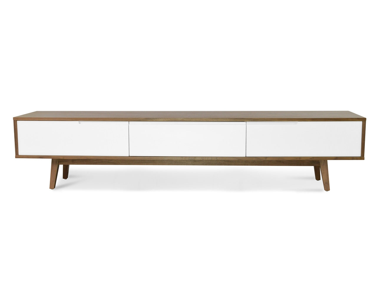Iconic Danish design fuses with enduring construction in the Marc 2.1m Scandinavian Entertainment TV Unit – Walnut.Crafted from long-lasting MDF resulting in a strong and reliable body and frame Durable ash veneer surfaces with walnut tones, resistant and requiring zero maintenance Beautiful white matt finish for a clean and minimalist look on the drawers Units sits atop of sturdy and robust ash wood legs Angled leg design supports a boxy yet streamlined structure reflecting trendy Scandinavian style with a retro dynamic Three spacious drawers offer generous space for books, magazines and all sorts of media devices210cm (W) x 45cm (D) x 45cm (H) Middle Compartment: 68cm (W) x 41cm (D) x 21cm (H)Box 1/1: 36cmx216cmx50cm, 55kg, 0.3888cbm