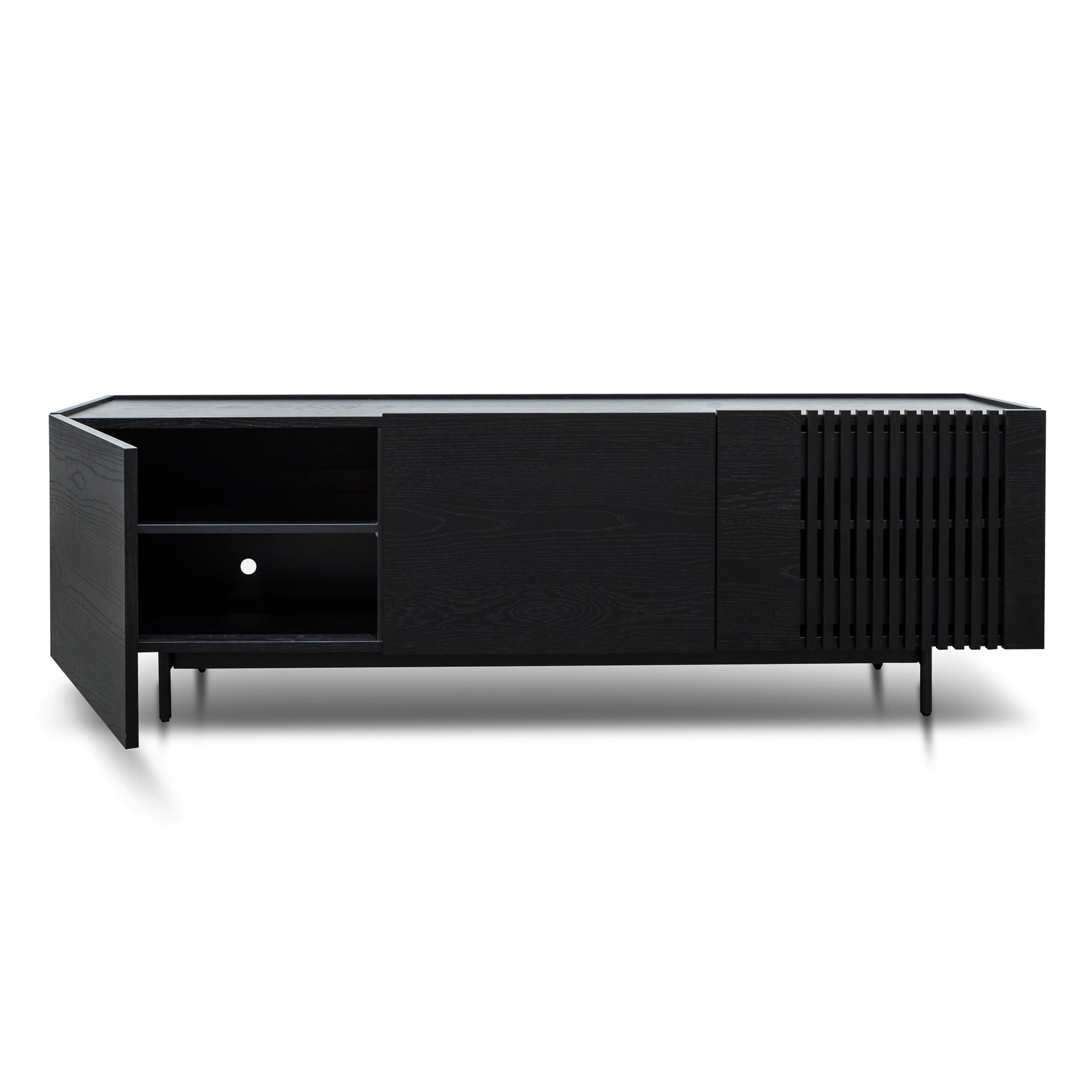 Update your TV area with the Entertainment TV Unit – Full Black and add aesthetic functionality back to your space.18mm MDF construction with a black oak veneer finish Black powder-coated metal legs 1 x door panel with solid wood strips Three pull-to-open doors Adjustable shelves Product comes flat packed and requires two-person assembly and a screwdriver180cm (W) x 42cm (D) x 55cm (H) Middle Shelf: 58.1cm (W) x 38cm (D) x 18.6cm (H) Left and Right Shelves: 57.1cm (W) x 38cm (D) x 18.6cm (H) Shelf Height: Adjustable 18cm-20cmBox 1/2: 17cmx190cmx49cm, 40.6kg, 0.1583cbm Box 2/2: 16cmx70cmx52cm, 20.6kg, 0.0582cbm