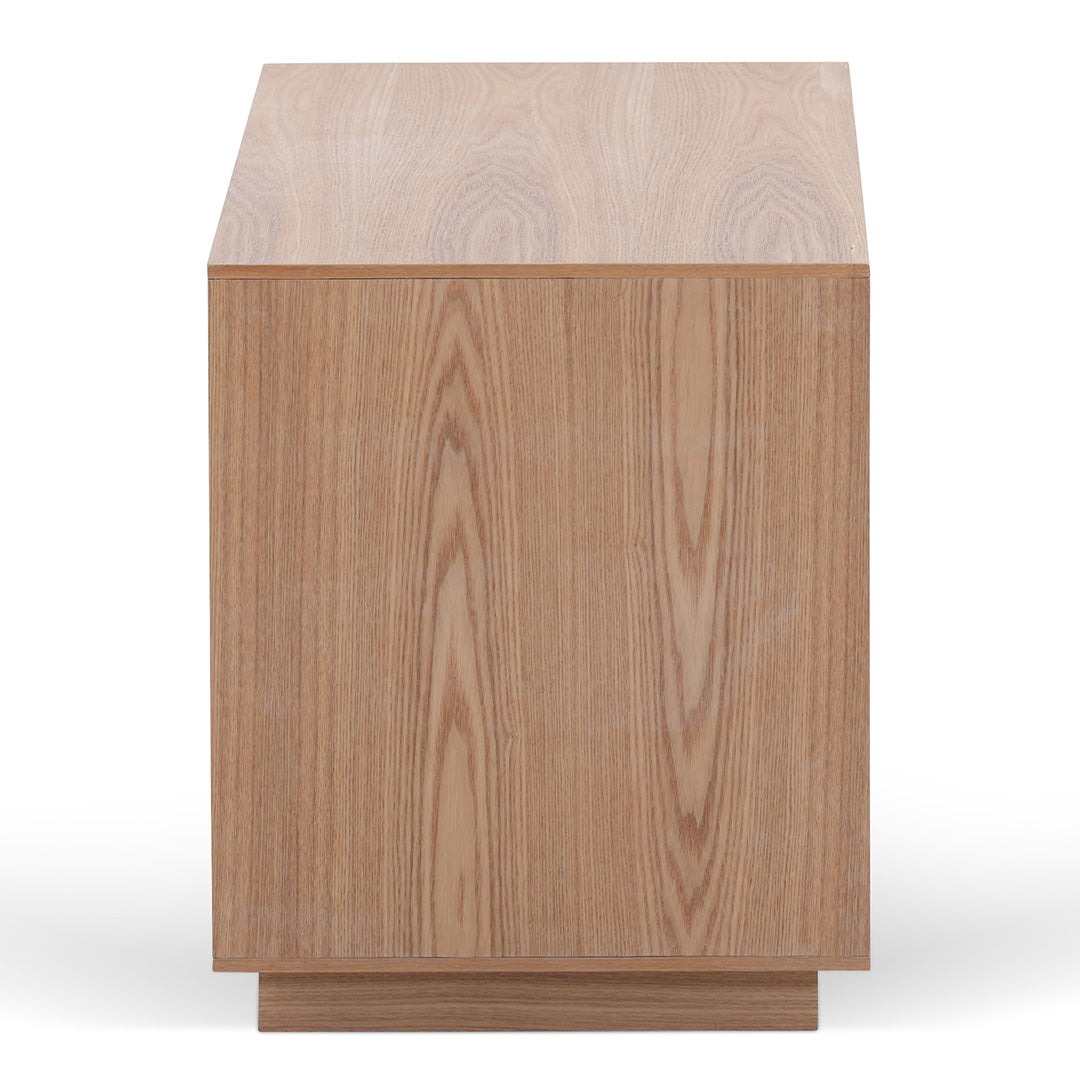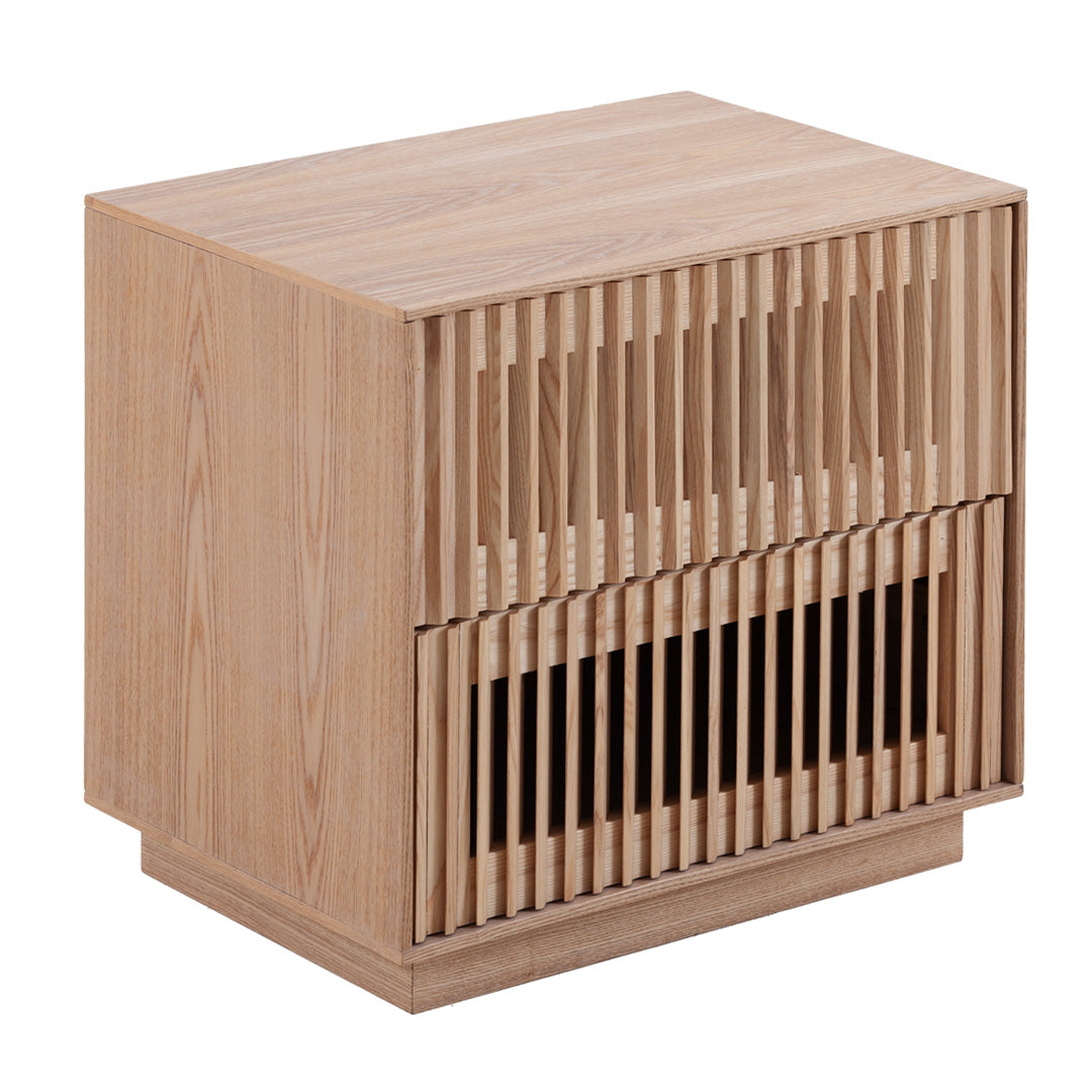 Elevate your bedroom with the Bedside Table in Natural, where aesthetics meet functionalitySturdy engineered wood with ash veneer 2 handless drawers with metal railings Full black finish with vertical drawer paneling Added base for enhanced elevation and stability Weight capacity: 20 kg top, 5 kg per drawer Product is fully assembled55cm (W) x 40cm (D) x 50cm (H) Panel size: 55cm (W) x 40cm (D) x 45cm (H) Base frame size: 49cm (W) x 34cm (D) x 5cm (H)Box 1/1: 63cmx48cmx58cm, 27kg, 0.1754cbm