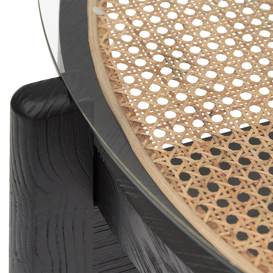 Simply appreciate the timeless elegance of rattan-inspired design, elevate your living space with 96cm Coffee Table exquisite fusion of vintage charm and contemporary allure.Tabletop in a clear tempered glass build Second-tier shelf made with handwoven rattan Frame and leg detailing in a matte black oak wood finish Hand carved wood textures visible throughout Tempered glass table top sits plush within frame Product requires two-person assembly96cm (W) x 96cm (D) x 45cm (H) Leg height: 34.4cmBox 1: 96cmx96cmx45cm, 25kg, 0.4147cbm Box 2: 98cmx98cmx12cm, 19kg, 0.1152cbm