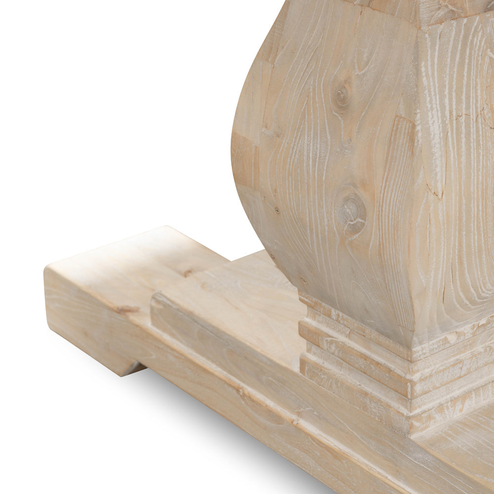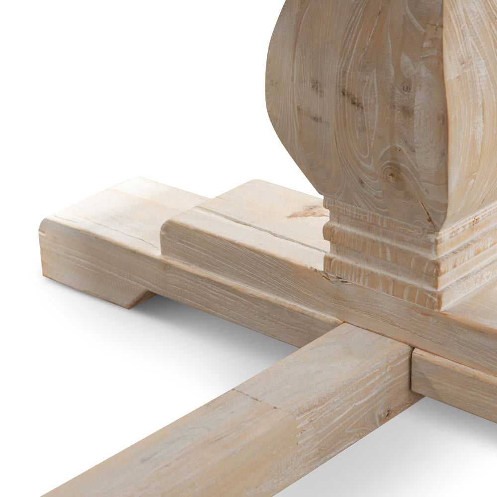 Evoking a beautiful medieval charm, our table is a must-have for any homeowner who enjoys the distressed look of a recycled piece of furniture. It’s a strong solid table perfect for completing the décor of your living space.Recycled Elm timber in a white washed finishSolid timber legsSeats 6-8 peopleProduct comes flat packed and requires two-person assembly Note: This range uses reclaimed elm timber. Each handmade piece features unique characteristics like cracks, splits, and imperfections. Variations in colour, texture, and pattern are natural and should be appreciated. Differences between shipments are expected.240cm (W) 100cm (D) 75cm (H) Thickness of table top: 6cmBox 1/2: 7cmx242cmx106cm, 55kg, 0.1796cbm Box 2/2: 72cmx95cmx26cm, 28kg, 0.1778cbm