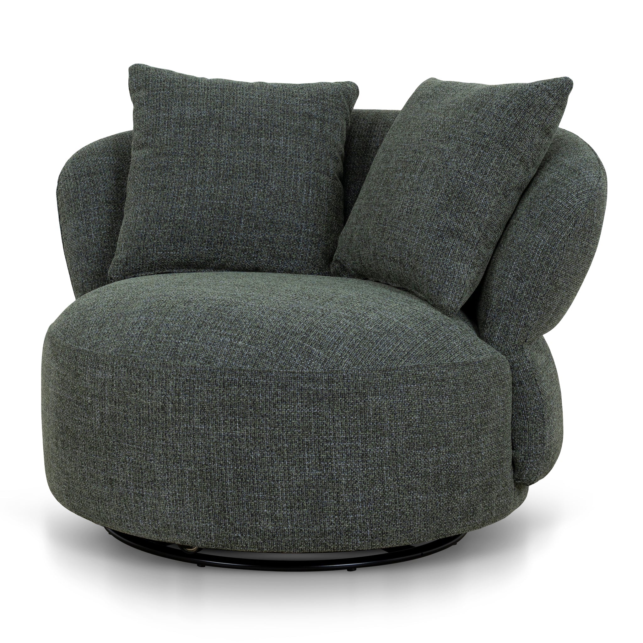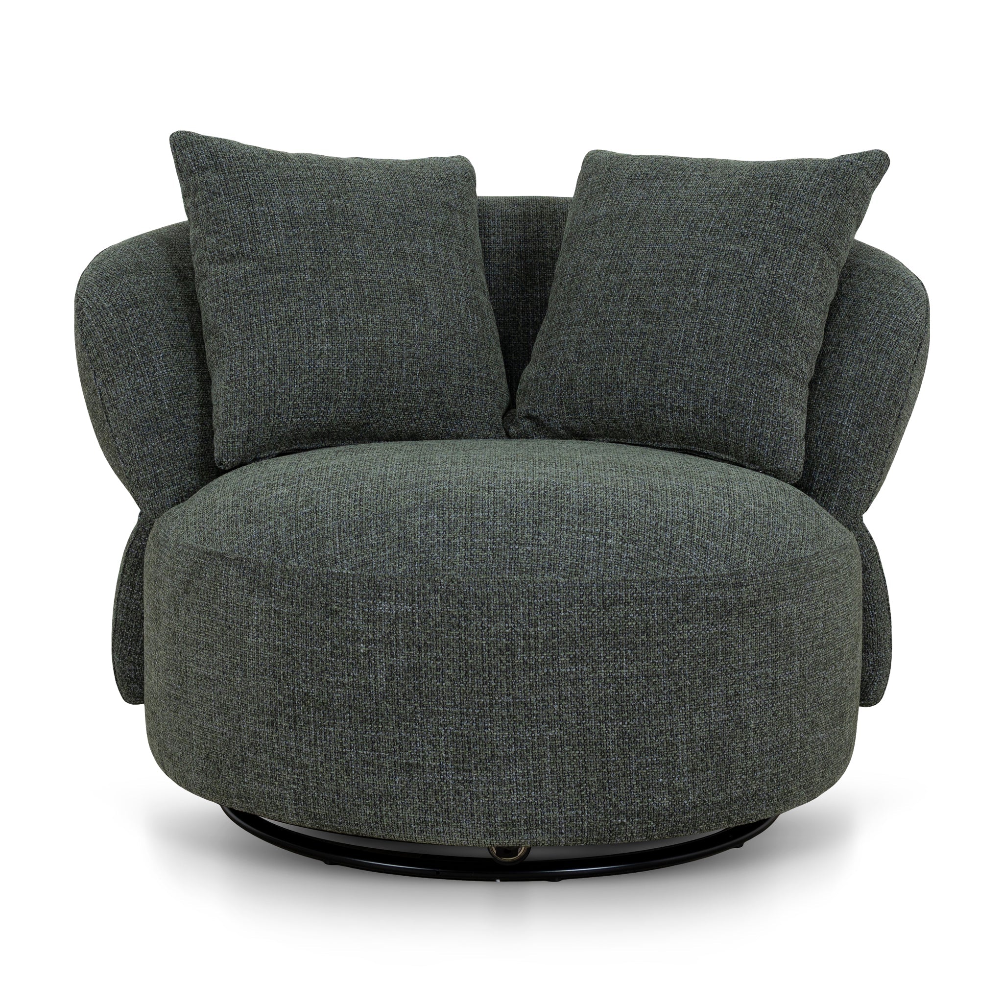 The Swivel Lounge Chair - Moss Green is a sophisticated invitation to unwind in style.Moss green polyester upholstery Pinewood and plywood frame Web suspension Fiber and feather filling Gently sloped backrest and curved sides Plinth base with swivel functionality Rubber legs Soft-medium seat firmness Weight Capacity: 120 kg Minor assembly required108cm (W) x 100cm (D) x 74/84cm (H) Leg Height: 7.2cmBox 1/1: 122cmx103cmx70cm, 40kg, 0.8075cbm